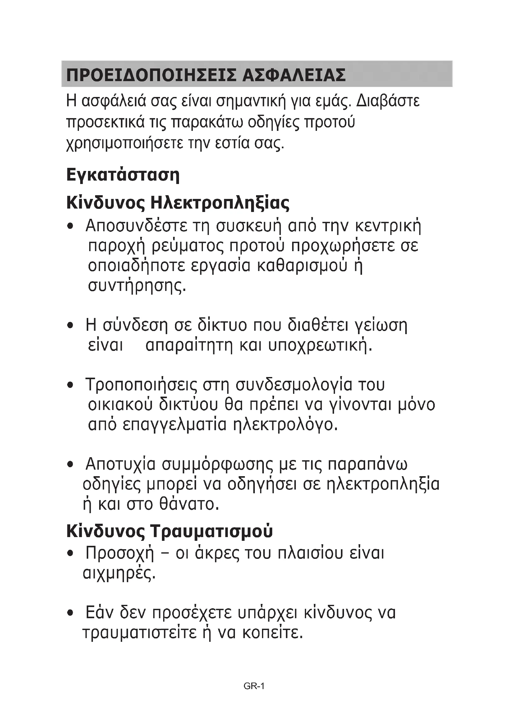- Εάν η συσκευή δεν εγκατασταθεί σωστά η εγγύηση παύει να ισχύει και ακυρώνεται οποιαδήποτε αξίωση αστικής ευθύνης. GR-2Λειτουργία και Συντήρηση Κίνδυνος Ηλεκτροπληξίας Κίνδυνοι για την Υγεία