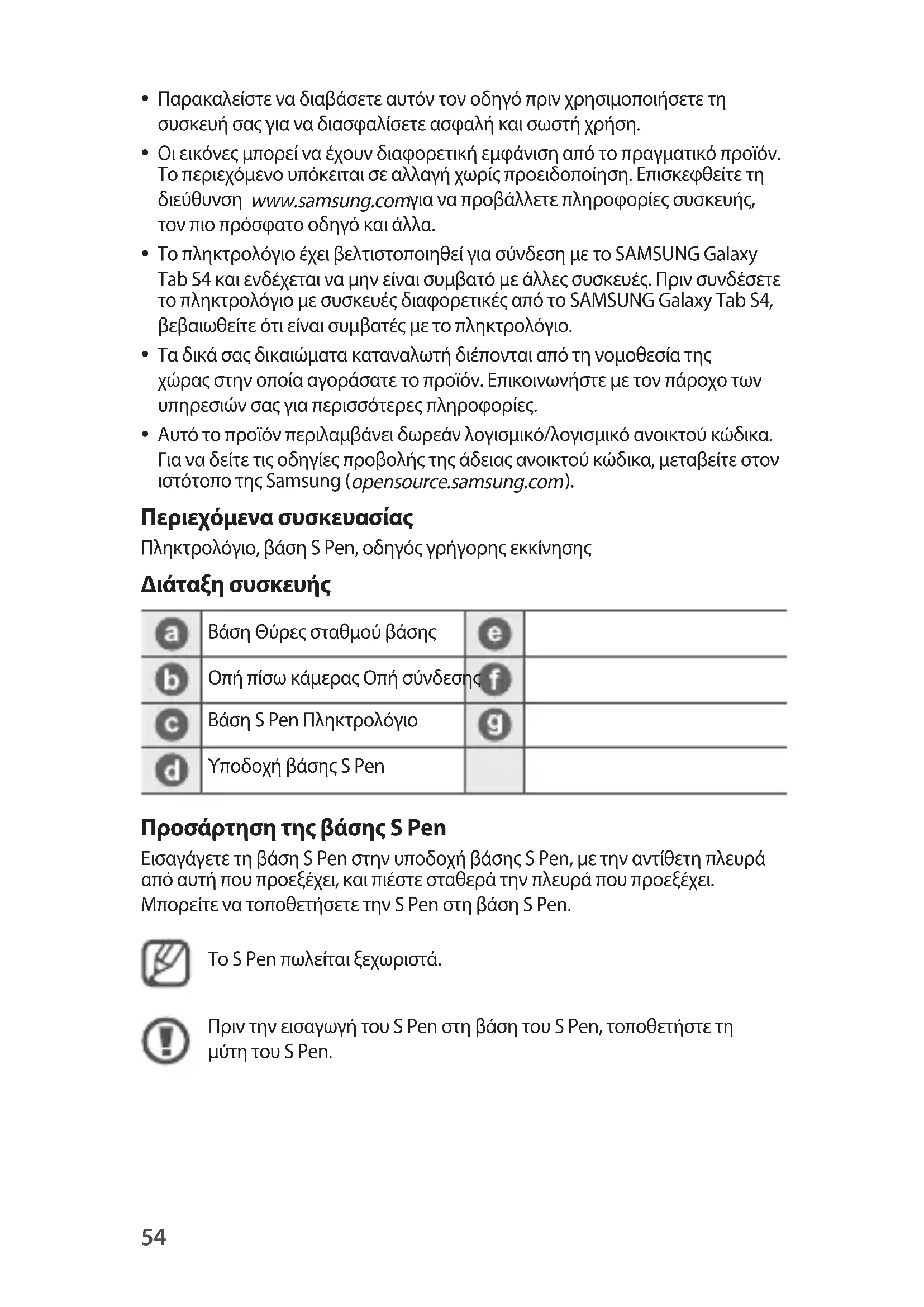 Περιεχόμενα συσκευασίας Πληκτρολόγιο, βάση S Pen, οδηγός γρήγορης εκκίνησης Διάταξη συσκευής Βάση Θύρες σταθμού βάσης Οπή πίσω κάμερας Οπή σύνδεσης Βάση S Pen Πληκτρολόγιο Υποδοχή βάσης S Pen Προσάρτηση της βάσης S Pen Εισαγάγετε τη βάση S Pen στην υποδοχή βάσης S Pen, με την αντίθετη πλευρά από αυτή που προεξέχει, και πιέστε σταθερά την πλευρά που προεξέχει. Μπορείτε να τοποθετήσετε την S Pen στη βάση S Pen. Το S Pen πωλείται ξεχωριστά. Πριν την εισαγωγή του S Pen στη βάση του S Pen, τοποθετήστε τη μύτη του S Pen. Ελληνικά55