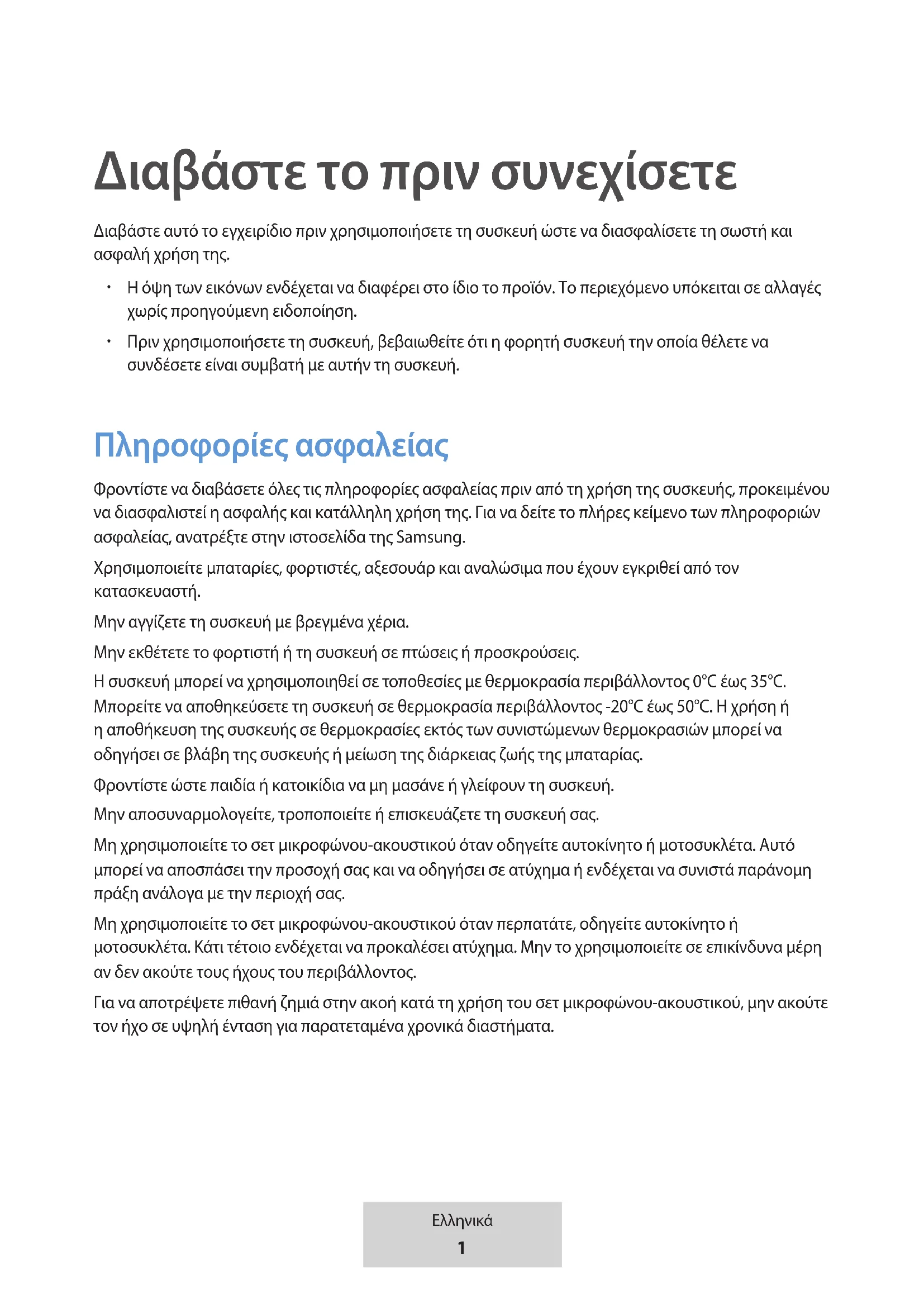 Πριν χρησιμοποιήσετε τη συσκευή, βεβαιωθείτε ότι η φορητή συσκευή την οποία θέλετε να συνδέσετε είναι συμβατή με αυτήν τη συσκευή. Πληροφορίες ασφαλείας Φροντίστε να διαβάσετε όλες τις πληροφορίες ασφαλείας πριν από τη χρήση της συσκευής, προκειμένου να διασφαλιστεί η ασφαλής και κατάλληλη χρήση της. Για να δείτε το πλήρες κείμενο των πληροφοριών ασφαλείας, ανατρέξτε στην ιστοσελίδα της Samsung. Χρησιμοποιείτε μπαταρίες, φορτιστές, αξεσουάρ και αναλώσιμα που έχουν εγκριθεί από τον κατασκευαστή. Μην αγγίζετε τη συσκευή με βρεγμένα χέρια. Μην εκθέτετε το φορτιστή ή τη συσκευή σε πτώσεις ή προσκρούσεις. Η συσκευή μπορεί να χρησιμοποιηθεί σε τοποθεσίες με θερμοκρασία περιβάλλοντος 0°C έως 35°C. Μπορείτε να αποθηκεύσετε τη συσκευή σε θερμοκρασία περιβάλλοντος -20°C έως 50°C. Η χρήση ή η αποθήκευση της συσκευής σε θερμοκρασίες εκτός των συνιστώμενων θερμοκρασιών μπορεί να οδηγήσει σε βλάβη της συσκευής ή μείωση της διάρκειας ζωής της μπαταρίας. Φροντίστε ώστε παιδία ή κατοικίδια να μη μασάνε ή γλείφουν τη συσκευή. Μην αποσυναρμολογείτε, τροποποιείτε ή επισκευάζετε τη συσκευή σας. Μη χρησιμοποιείτε το σετ μικροφώνου-ακουστικού όταν οδηγείτε αυτοκίνητο ή μοτοσυκλέτα. Αυτό μπορεί να αποσπάσει την προσοχή σας και να οδηγήσει σε ατύχημα ή ενδέχεται να συνιστά παράνομη πράξη ανάλογα με την περιοχή σας. Μη χρησιμοποιείτε το σετ μικροφώνου-ακουστικού όταν περπατάτε, οδηγείτε αυτοκίνητο ή μοτοσυκλέτα. Κάτι τέτοιο ενδέχεται να προκαλέσει ατύχημα. Μην το χρησιμοποιείτε σε επικίνδυνα μέρη αν δεν ακούτε τους ήχους του περιβάλλοντος. Για να αποτρέψετε πιθανή ζημιά στην ακοή κατά τη χρήση του σετ μικροφώνου-ακουστικού, μην ακούτε τον ήχο σε υψηλή ένταση για παρατεταμένα χρονικά διαστήματα.2