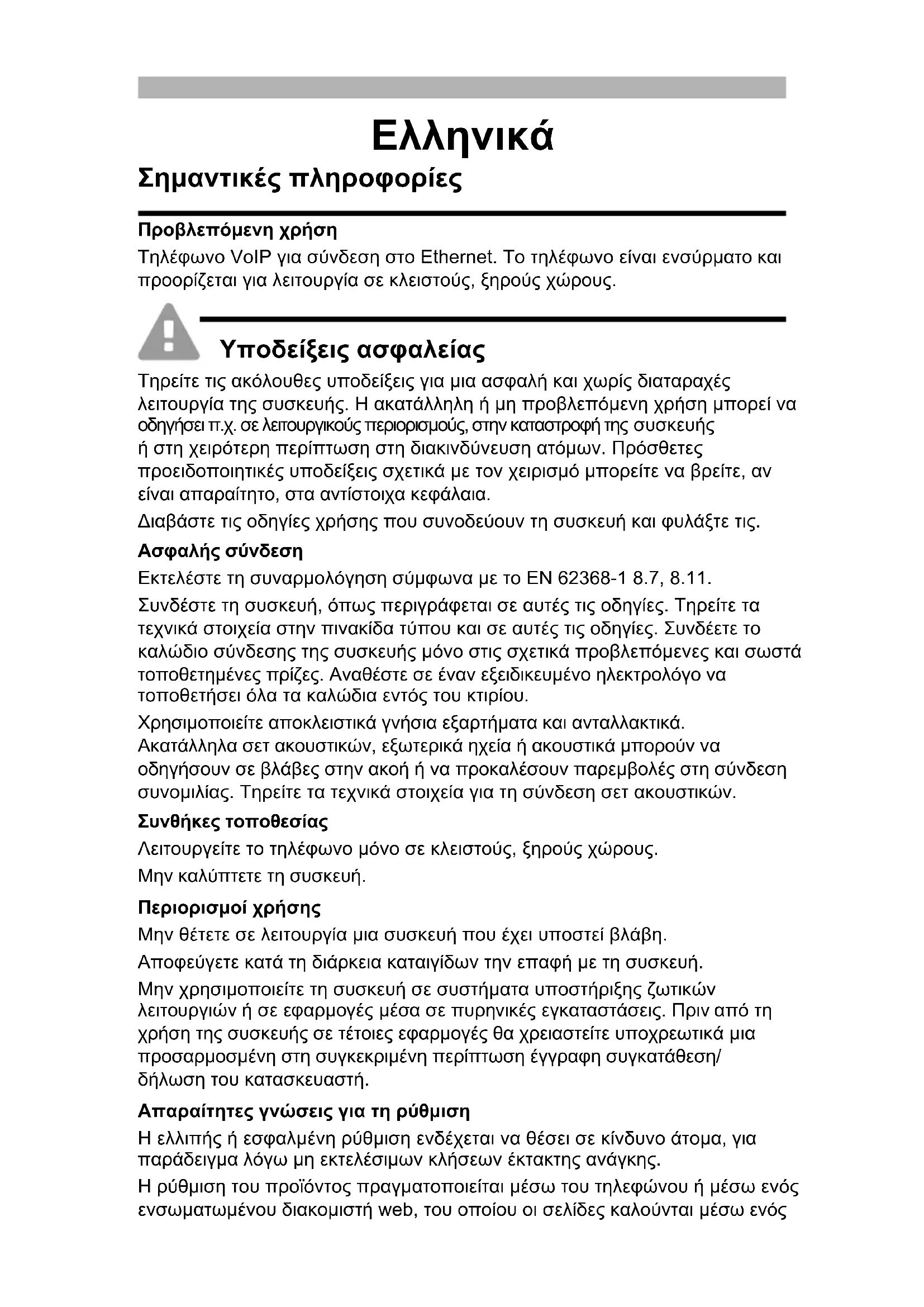 - Cambie de inmediato la contraseña en Usario. Nota: encontrará información adicional, por ejemplo, para configurar una identidad, en Ayuda online. Centralita Proveedor VoIP Nombre de usuario SIP Número interno configurado para el teléfono Ejemplo: 557 Nombre de usuario configurado para la cuenta Ejemplo: Numero@Proveedor.es Contraseña La contraseña correspondiente La contraseña correspondiente Registrador SIP La dirección IP de la centralita Ejemplo: 192.168.196.37 La URL del proveedor VoIP Ejemplo: Proveedor.esΕλληνικά Σημαντικές πληροφορίες Προβλεπόμενη χρήση Τηλέφωνο VoIP για σύνδεση στο Ethernet. Το τηλέφωνο είναι ενσύρματο και προορίζεται για λειτουργία σε κλειστούς, ξηρούς χώρους. Υποδείξεις ασφαλείας Τηρείτε τις ακόλουθες υποδείξεις για μια ασφαλή και χωρίς διαταραχές λειτουργία της συσκευής. Η ακατάλληλη ή μη προβλεπόμενη χρήση μπορεί να οδηγήσει π.χ. σε λειτουργικούς περιορισμούς, στην καταστροφή της συσκευής ή στη χειρότερη περίπτωση στη διακινδύνευση ατόμων. Πρόσθετες προειδοποιητικές υποδείξεις σχετικά με τον χειρισμό μπορείτε να βρείτε, αν είναι απαραίτητο, στα αντίστοιχα κεφάλαια. Διαβάστε τις οδηγίες χρήσης που συνοδεύουν τη συσκευή και φυλάξτε τις. Ασφαλής σύνδεση Εκτελέστε τη συναρμολόγηση σύμφωνα με το EN 62368-1 8.7, 8.11. Συνδέστε τη συσκευή, όπως περιγράφεται σε αυτές τις οδηγίες. Τηρείτε τα τεχνικά στοιχεία στην πινακίδα τύπου και σε αυτές τις οδηγίες. Συνδέετε το καλώδιο σύνδεσης της συσκευής μόνο στις σχετικά προβλεπόμενες και σωστά τοποθετημένες πρίζες. Αναθέστε σε έναν εξειδικευμένο ηλεκτρολόγο να τοποθετήσει όλα τα καλώδια εντός του κτιρίου. Χρησιμοποιείτε αποκλειστικά γνήσια εξαρτήματα και ανταλλακτικά. Ακατάλληλα σετ ακουστικών, εξωτερικά ηχεία ή ακουστικά μπορούν να οδηγήσουν σε βλάβες στην ακοή ή να προκαλέσουν παρεμβολές στη σύνδεση συνομιλίας. Τηρείτε τα τεχνικά στοιχεία για τη σύνδεση σετ ακουστικών. Συνθήκες τοποθεσίας Λειτουργείτε το τηλέφωνο μόνο σε κλειστούς, ξηρούς χώρους. Μην καλύπτετε τη συσκευή. Περιορισμοί χρήσης Μην θέτετε σε λειτουργία μια συσκευή που έχει υποστεί βλάβη. Αποφεύγετε κατά τη διάρκεια καταιγίδων την επαφή με τη συσκευή. Μην χρησιμοποιείτε τη συσκευή σε συστήματα υποστήριξης ζωτικών λειτουργιών ή σε εφαρμογές μέσα σε πυρηνικές εγκαταστάσεις. Πριν από τη χρήση της συσκευής σε τέτοιες εφαρμογές θα χρειαστείτε υποχρεωτικά μια προσαρμοσμένη στη συγκεκριμένη περίπτωση έγγραφη συγκατάθεση/ δήλωση του κατασκευαστή. Απαραίτητες γνώσεις για τη ρύθμιση Η ελλιπής ή εσφαλμένη ρύθμιση ενδέχεται να θέσει σε κίνδυνο άτομα, για παράδειγμα λόγω μη εκτελέσιμων κλήσεων έκτακτης ανάγκης. Η ρύθμιση του προϊόντος πραγματοποιείται μέσω του τηλεφώνου ή μέσω ενός ενσωματωμένου διακομιστή web, του οποίου οι σελίδες καλούνται μέσω ενόςπρογράμματος περιήγησης στο web. Η σχετική βοήθεια διατίθεται στην αγγλική ή στη γερμανική γλώσσα. Αν δεν είστε εξοικειωμένοι με αυτές τις γλώσσες και τους χρησιμοποιούμενους ειδικούς όρους, συμβουλευτείτε τεχνικά και γλωσσικά κατάλληλο εξειδικευμένο