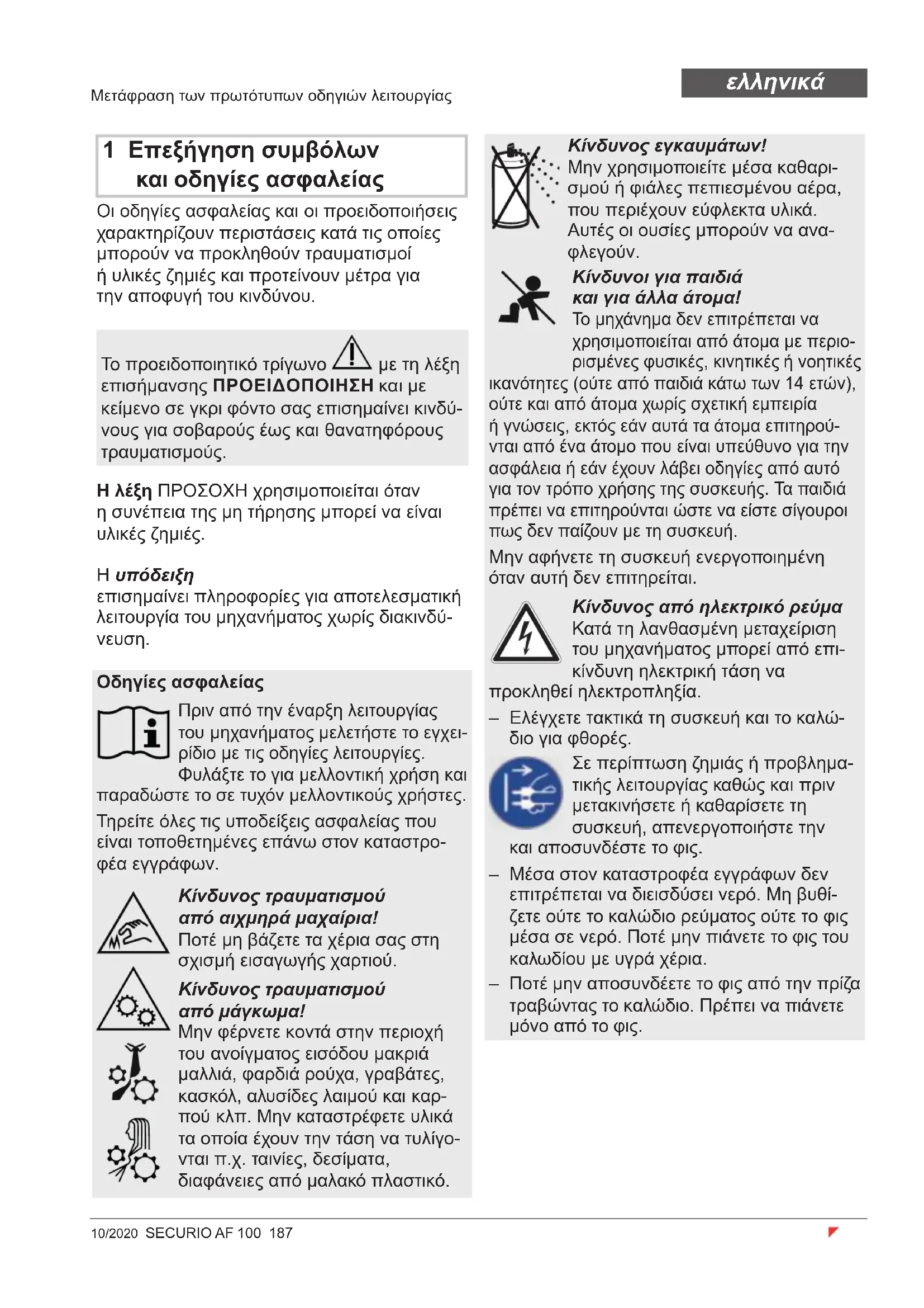Κίνδυνοι για παιδιά και για άλλα άτομα! Το μηχάνημα δεν επιτρέπεται να χρησιμοποιείται από άτομα με περιο- ρισμένες φυσικές, κινητικές ή νοητικές ικανότητες (ούτε από παιδιά κάτω των 14 ετών), ούτε και από άτομα χωρίς σχετική εμπειρία ή γνώσεις, εκτός εάν αυτά τα άτομα επιτηρού- νται από ένα άτομο που είναι υπεύθυνο για την ασφάλεια ή εάν έχουν λάβει οδηγίες από αυτό για τον τρόπο χρήσης της συσκευής. Τα παιδιά πρέπει να επιτηρούνται ώστε να είστε σίγουροι πως δεν παίζουν με τη συσκευή. Μην αφήνετε τη συσκευή ενεργοποιημένη όταν αυτή δεν επιτηρείται. Κίνδυνος από ηλεκτρικό ρεύμα Κατά τη λανθασμένη μεταχείριση του μηχανήματος μπορεί από επι- κίνδυνη ηλεκτρική τάση να προκληθεί ηλεκτροπληξία. – Ελέγχετε τακτικά τη συσκευή και το καλώ- διο για φθορές. Σε περίπτωση ζημιάς ή προβλημα- τικής λειτουργίας καθώς και πριν μετακινήσετε ή καθαρίσετε τη συσκευή, απενεργοποιήστε την και αποσυνδέστε το φις. – Μέσα στον καταστροφέα εγγράφων δεν επιτρέπεται να διεισδύσει νερό. Μη βυθί- ζετε ούτε το καλώδιο ρεύματος ούτε το φις μέσα σε νερό. Ποτέ μην πιάνετε το φις του καλωδίου με υγρά χέρια. – Ποτέ μην αποσυνδέετε το φις από την πρίζα τραβώντας το καλώδιο. Πρέπει να πιάνετε μόνο από το φις.188 SECURIO AF 100 10/2020