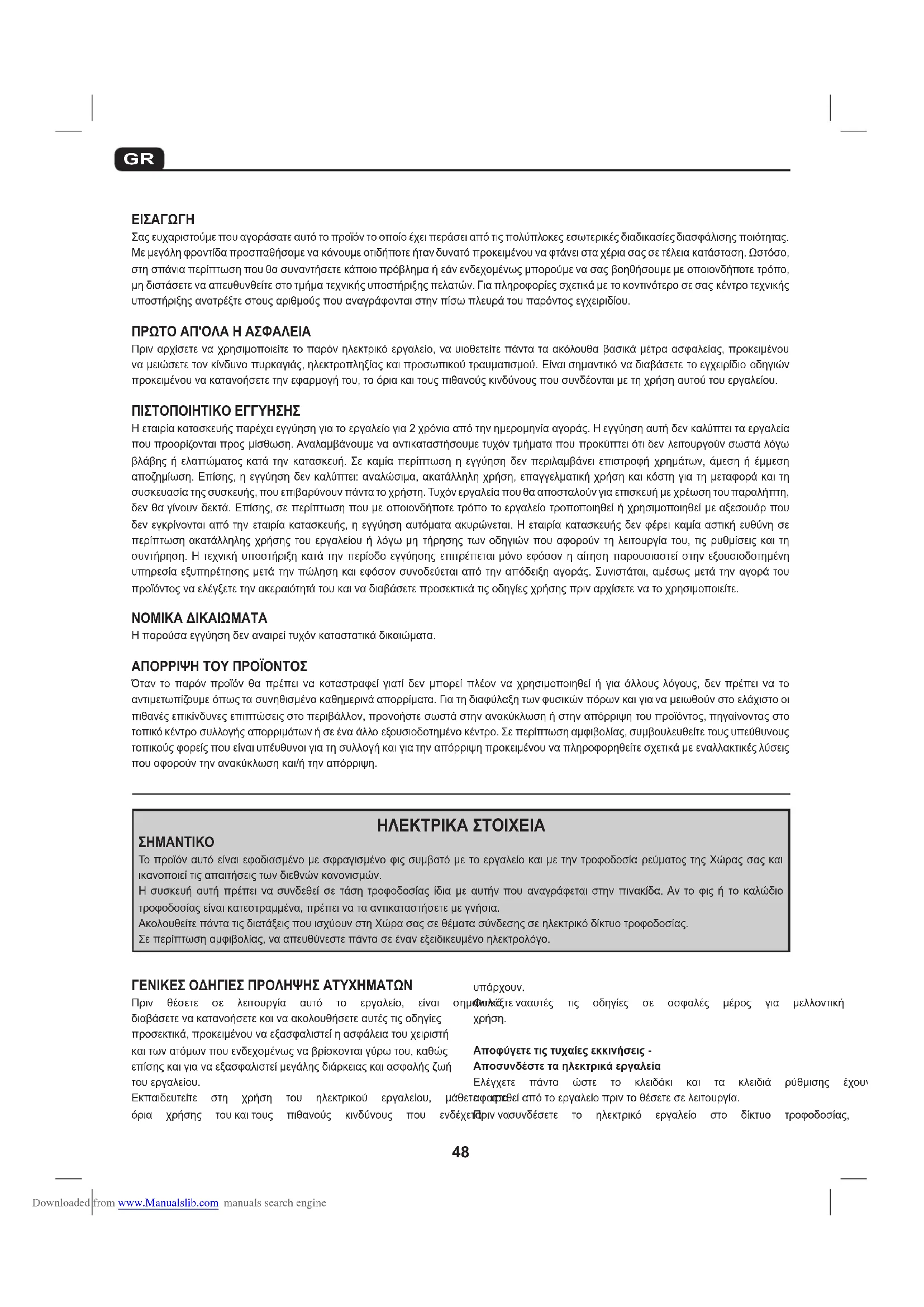 Σαςευχαριστούμεπουαγοράσατεαυτότοπροϊόντοοποίοέχειπεράσειαπότιςπολύπλοκεςεσωτερικέςδιαδικασίεςδιασφάλισηςποιότητας. Μεμεγάληφροντίδαπροσπαθήσαμενακάνουμεοτιδήποτεήτανδυνατόπροκειμένουναφτάνεισταχέριασαςσετέλειακατάσταση.Ωστόσο, στησπάνιαπερίπτωσηπουθασυναντήσετεκάποιοπρόβλημαήεάνενδεχομένωςμπορούμενασαςβοηθήσουμεμεοποιονδήποτετρόπο, μηδιστάσετενααπευθυνθείτεστοτμήματεχνικήςυποστήριξηςπελατών.Γιαπληροφορίεςσχετικάμετοκοντινότεροσεσαςκέντροτεχνικής υποστήριξηςανατρέξτεστουςαριθμούςπουαναγράφονταιστηνπίσωπλευράτουπαρόντοςεγχειριδίου. ΠΡΩΤΟ ΑΠ'ΟΛΑ Η ΑΣΦΑΛΕΙΑ Πριναρχίσετεναχρησιμοποιείτετοπαρόνηλεκτρικόεργαλείο,ναυιοθετείτεπάνταταακόλουθαβασικάμέτραασφαλείας,προκειμένου ναμειώσετετονκίνδυνοπυρκαγιάς,ηλεκτροπληξίαςκαιπροσωπικούτραυματισμού.Είναισημαντικόναδιαβάσετετοεγχειρίδιοοδηγιών προκειμένουνακατανοήσετετηνεφαρμογήτου,ταόριακαιτουςπιθανούςκινδύνουςπουσυνδέονταιμετηχρήσηαυτούτουεργαλείου. ΠΙΣΤΟΠΟΙΗΤΙΚΟ ΕΓΓΥΗΣΗΣ Ηεταιρίακατασκευήςπαρέχειεγγύησηγιατοεργαλείογια2χρόνιααπότηνημερομηνίααγοράς.Ηεγγύησηαυτήδενκαλύπτειταεργαλεία πουπροορίζονταιπροςμίσθωση.Αναλαμβάνουμενααντικαταστήσουμετυχόντμήματαπουπροκύπτειότιδενλειτουργούνσωστάλόγω βλάβηςήελαττώματοςκατάτην κατασκευή.Σε καμίαπερίπτωσηηεγγύηση δενπεριλαμβάνειεπιστροφή χρημάτων,άμεσηή έμμεση αποζημίωση.Επίσης,ηεγγύησηδενκαλύπτει:αναλώσιμα,ακατάλληληχρήση,επαγγελματικήχρήσηκαικόστηγιατημεταφοράκαιτη συσκευασίατηςσυσκευής,πουεπιβαρύνουνπάντατοχρήστη.Τυχόνεργαλείαπουθααποσταλούνγιαεπισκευήμεχρέωσητουπαραλήπτη, δενθαγίνουνδεκτά.Επίσης,σεπερίπτωσηπουμεοποιονδήποτετρόποτοεργαλείοτροποποιηθείήχρησιμοποιηθείμεαξεσουάρπου δενεγκρίνονταιαπότηνεταιρίακατασκευής,ηεγγύησηαυτόματαακυρώνεται.Ηεταιρίακατασκευήςδενφέρεικαμίααστικήευθύνησε περίπτωσηακατάλληληςχρήσηςτουεργαλείουήλόγωμη τήρησηςτωνοδηγιών πουαφορούντη λειτουργίατου,τιςρυθμίσειςκαιτη συντήρηση.Ητεχνική υποστήριξηκατάτηνπερίοδοεγγύησηςεπιτρέπεταιμόνοεφόσονηαίτησηπαρουσιαστείστηνεξουσιοδοτημένη υπηρεσίαεξυπηρέτησηςμετάτηνπώλησηκαιεφόσονσυνοδεύεταιαπότηναπόδειξηαγοράς.Συνιστάται,αμέσωςμετάτηναγοράτου προϊόντοςναελέγξετετηνακεραιότητάτουκαιναδιαβάσετεπροσεκτικάτιςοδηγίεςχρήσηςπριναρχίσετενατοχρησιμοποιείτε. ΝΟΜΙΚΑ ΔΙΚΑΙΩΜΑΤΑ Ηπαρούσαεγγύησηδεναναιρείτυχόνκαταστατικάδικαιώματα. ΑΠΟΡΡΙΨΗ ΤΟΥ ΠΡΟΪΟΝΤΟΣ Όταντο παρόνπροϊόν θα πρέπει να καταστραφείγιατί δεν μπορεί πλέον να χρησιμοποιηθεί ή για άλλουςλόγους, δεν πρέπει να το αντιμετωπίζουμεόπωςτασυνηθισμένακαθημερινάαπορρίματα.Γιατηδιαφύλαξητωνφυσικώνπόρωνκαιγιαναμειωθούνστοελάχιστοοι πιθανέςεπικίνδυνεςεπιπτώσειςστοπεριβάλλον,προνοήστεσωστάστηνανακύκλωσηήστηναπόρριψητουπροϊόντος,πηγαίνονταςστο τοπικόκέντροσυλλογήςαπορριμάτωνήσεέναάλλοεξουσιοδοτημένοκέντρο.Σεπερίπτωσηαμφιβολίας,συμβουλευθείτετουςυπεύθυνους τοπικούςφορείςπουείναιυπέυθυνοιγιατησυλλογήκαιγιατηναπόρριψηπροκειμένουναπληροφορηθείτεσχετικάμεεναλλακτικέςλύσεις πουαφορούντηνανακύκλωσηκαι/ήτηναπόρριψη. Downloaded from www.Manualslib.com manuals search engine49