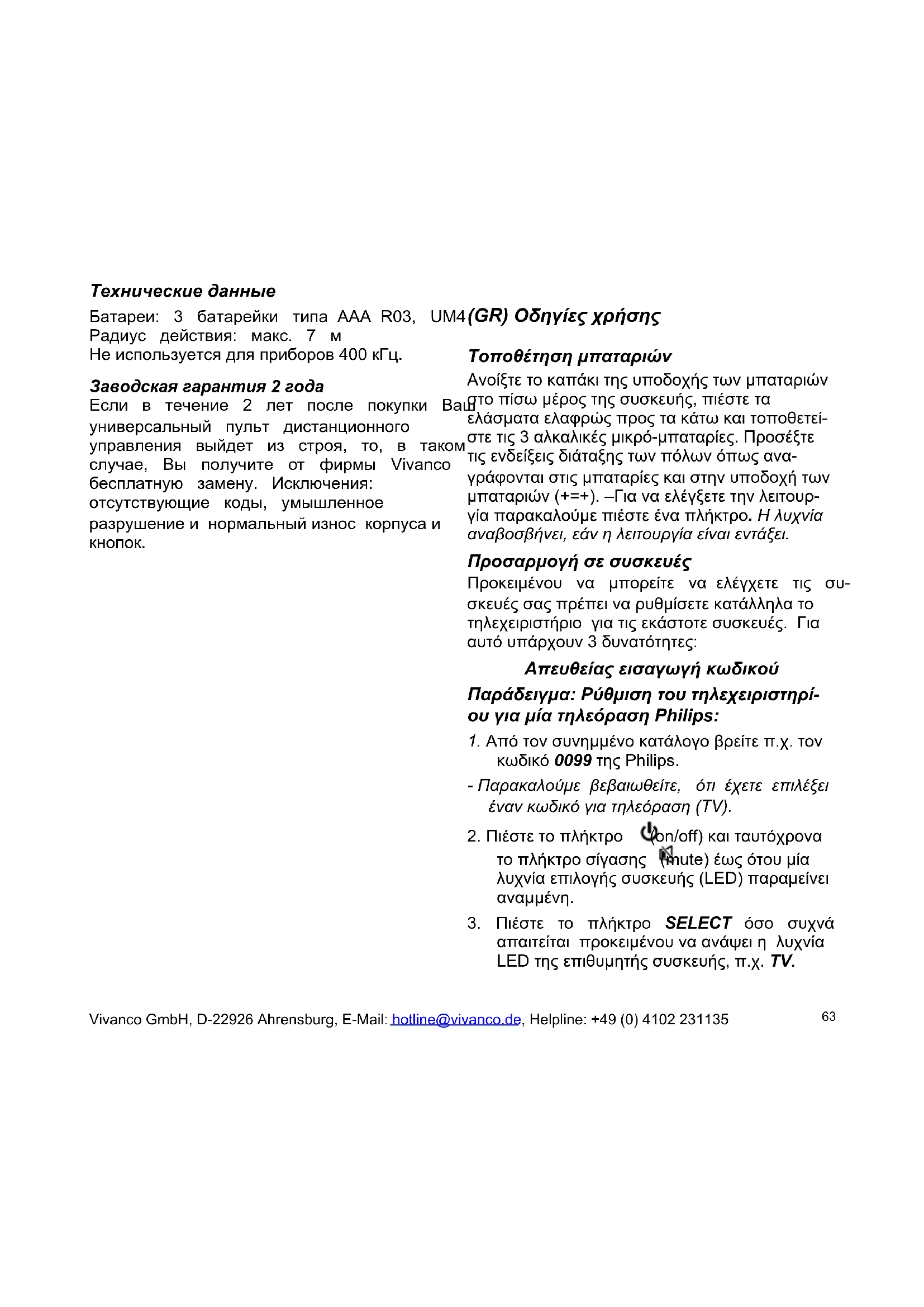 Στην πράξη ο χειρισμός των συσκευών σας γί- νεται με τον ίδιο τρόπο που πραγματοποιείται με τα αυθεντικά τηλεχειριστήρια. Επειδή τα σύμβο- λα ενός τηλεχειριστηρίου γενικής χρήσης εν- δέχεται να διαφέρουν από εκείνα των αυθεντι- κών τηλεχειριστηρίων ίσως να πρέπει να δοκι- μάσετε όλα τα πλήκτρα προκειμένου να εντοπί- σετε όλες τις λειτουργίες. Τεχνικά χαρακτηριστικά Μπαταρίες: 3x μικρές μπαταρίες τύπου R03, UM4, AAA Εμβέλεια: μέγιστη 7 m Δεν ενδείκνυται για συσκευές 400 kHz 2 έτη εργοστασιακή εγγύηση Σε περίπτωση που το τηλεχειριστήριο σας στα- ματήσει να λειτουργεί εντός 2 ετών από την ημε- ρομηνία αγοράς, τότε θα λάβετε δωρεάν από την Vivanco μία νέα συσκευή προς αντικατάστα- ση. Εξαιρέσεις: λανθασμένοι κωδικοί, εκούσια καταστροφή και κανονικές φθορές του περιβλή- ματος και των πλήκτρων λόγω χρήσης Vivanco GmbH, D-22926 Ahrensburg, E-Mail: hotline@vivanco.de, Helpline: +49 (0) 4102 231135 68(TR) Kullanma talimatı Pillerin takılması Lütfen cihazın arka tarafındaki pil yerinin kapağını açınız, dili biraz aşağıya bastırınız ve 3 adet alkali mikro hücre pili takınız. Bunu yaparken, pillerdeki ve pil yerindeki kutuplara dikkat ediniz (+=+). - Fonksiyon kontrolü için düğme. Fonksiyon kusursuz işlemekteyse lamba yanıp söner. Cihaz uyarlaması Cihazlarınıza kumanda edebilmek için, uzaktan kumandayı cihazlarınıza göre ayarlamanız gerekmektedir. Bunun için 3 yol mevcut bulunmaktadır: Doğrudan kumanda kodunun girilmesi Örnek: Uzaktan kumandanın Philips marka televizyona ayarlanması: