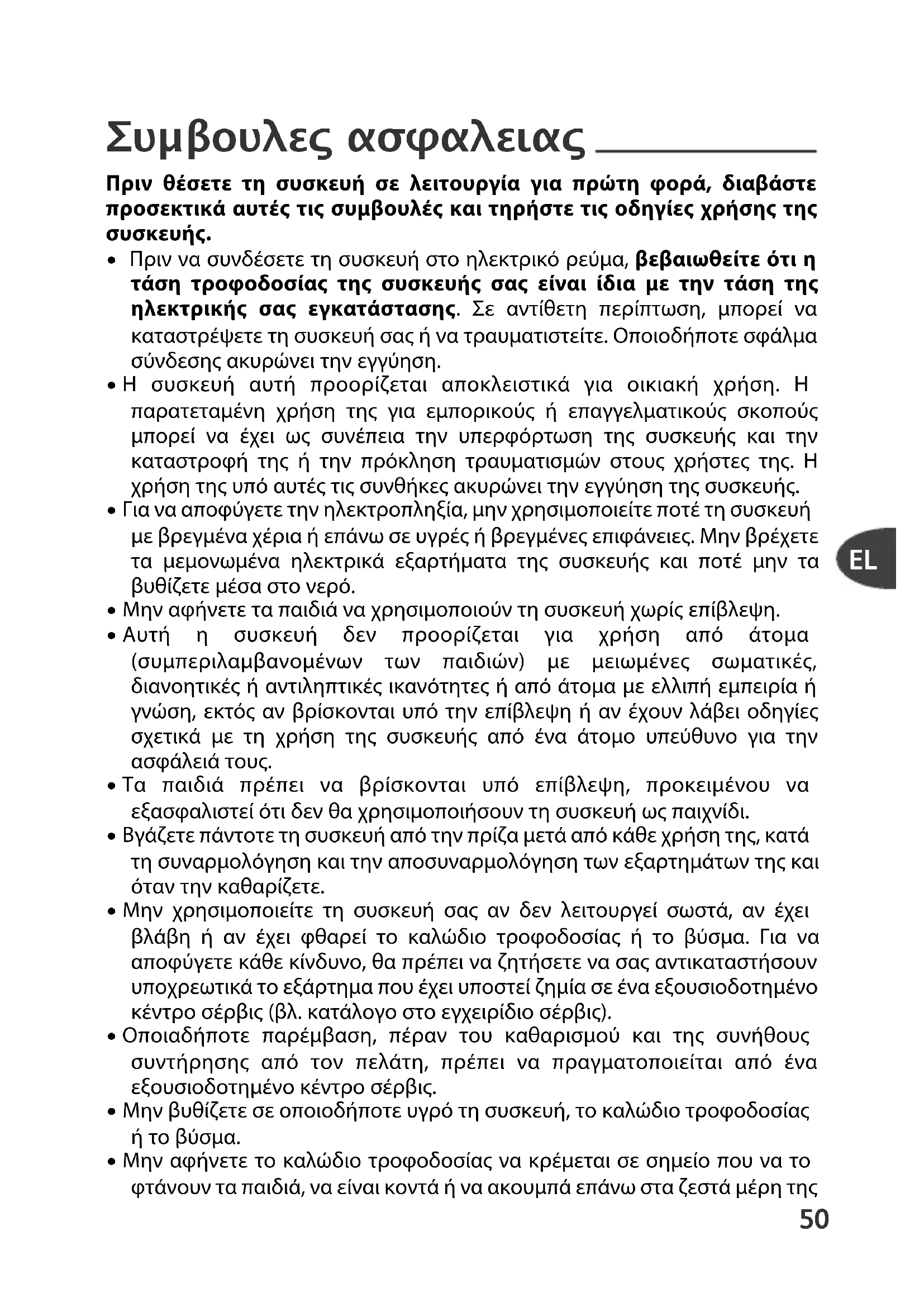- Η συσκευή αυτή προορίζεται αποκλειστικά για οικιακή χρήση. Η παρατεταμένη χρήση της για εμπορικούς ή επαγγελματικούς σκοπούς μπορεί να έχει ως συνέπεια την υπερφόρτωση της συσκευής και την καταστροφή της ή την πρόκληση τραυματισμών στους χρήστες της. Η χρήση της υπό αυτές τις συνθήκες ακυρώνει την εγγύηση της συσκευής.