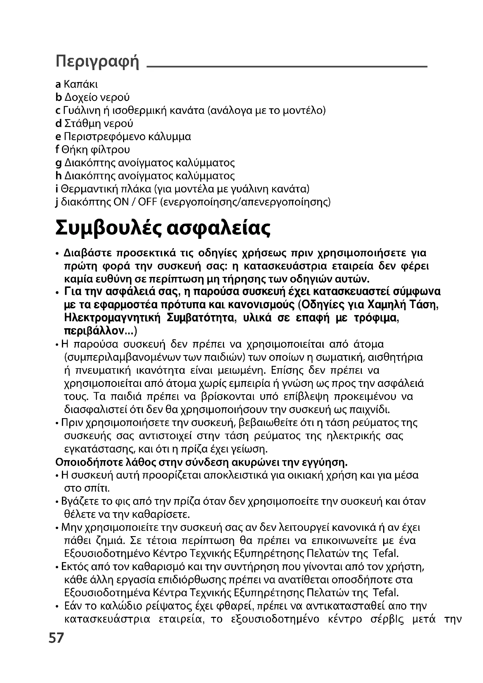 SM_COFFEE-MAKER-EXPRESS_Mise en page 1 20/05/11 14:43 Page56Περιγραφή a Καπάκι b Δοχείο νερού c Γυάλινη ή ισοθερμική κανάτα (ανάλογα με το μοντέλο) d Στάθμη νερού e Περιστρεφόμενο κάλυμμα f Θήκη φίλτρου g Διακόπτης ανοίγματος καλύμματος h Διακόπτης ανοίγματος καλύμματος i Θερμαντική πλάκα (για μοντέλα με γυάλινη κανάτα) j διακόπτης ON / OFF (ενεργοποίησης/απενεργοποίησης) Συμβουλές ασφαλείας