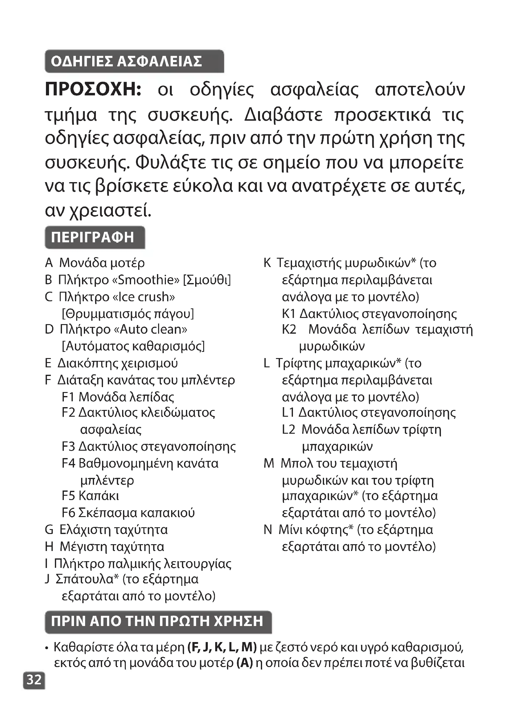 ΠΡΙΝ ΑΠΟ ΤΗΝ ΠΡΩΤΗ ΧΡΗΣΗ ΟΔΗΓΙΕΣ ΑΣΦΑΛΕΙΑΣ A Μονάδα μοτέρ B Πλήκτρο «Smoothie» [Σμούθι] C Πλήκτρο «Ice crush» [Θρυμματισμός πάγου] D Πλήκτρο «Auto clean» [Αυτόματος καθαρισμός] E Διακόπτης χειρισμού F Διάταξη κανάτας του μπλέντερ F1 Μονάδα λεπίδας F2 Δακτύλιος κλειδώματος