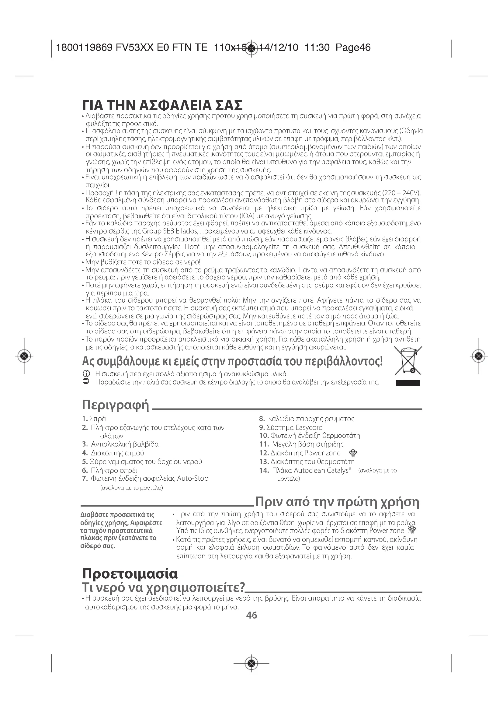 - Η συσκευή σας έχει σχεδιαστεί να λειτουργεί με νερό της βρύσης. Είναι απαραίτητο να κάνετε τη διαδικασία αυτοκαθαρισμού της συσκευής μία φορά το μήνα. ∆ιαβάστε προσεκτικά τις οδηγίες χρήσης, Αφαιρέστε τα τυχόν προστατευτικά πλάκας πριν ζεστάνετε το σίδερό σας. 1800119869 FV53XX E0 FTN TE_110x154 14/12/10 11:30 Page46EN