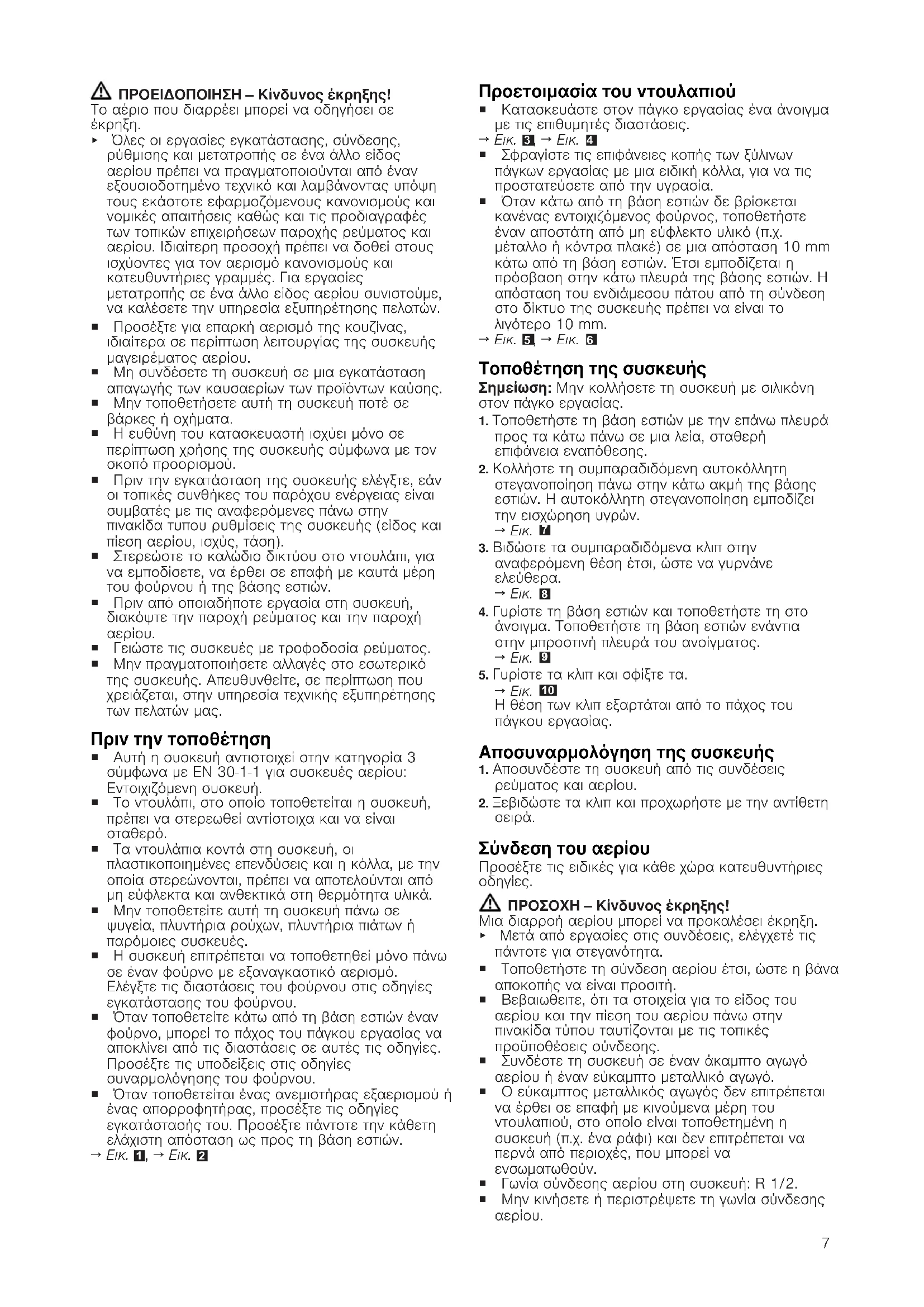Ασφαλής συναρμολόγηση Προσέξτε αυτές τις υποδείξεις ασφαλείας, όταν συναρμολογείτε τη συσκευή. ¡ Διαβάστε προσεκτικά αυτές τις οδηγίες. ¡ Οι εικόνες που υπάρχουν σ'αυτές τις οδηγίες είναι μόνο ενδεικτικές. ¡ Μόνο με τη σωστή τοποθέτηση σύμφωνα με τις οδηγίες τοποθέτησης διασφαλίζεται η ασφάλεια κατά τη χρήση. Ο εγκαταστάτης είναι υπεύθυνος για την άψογη λειτουργία στη θέση τοποθέτησης.7 ΠΡΟΕΙΔΟΠΟΙΗΣΗ‒Κίνδυνος έκρηξης! Το αέριο που διαρρέει μπορεί να οδηγήσει σε