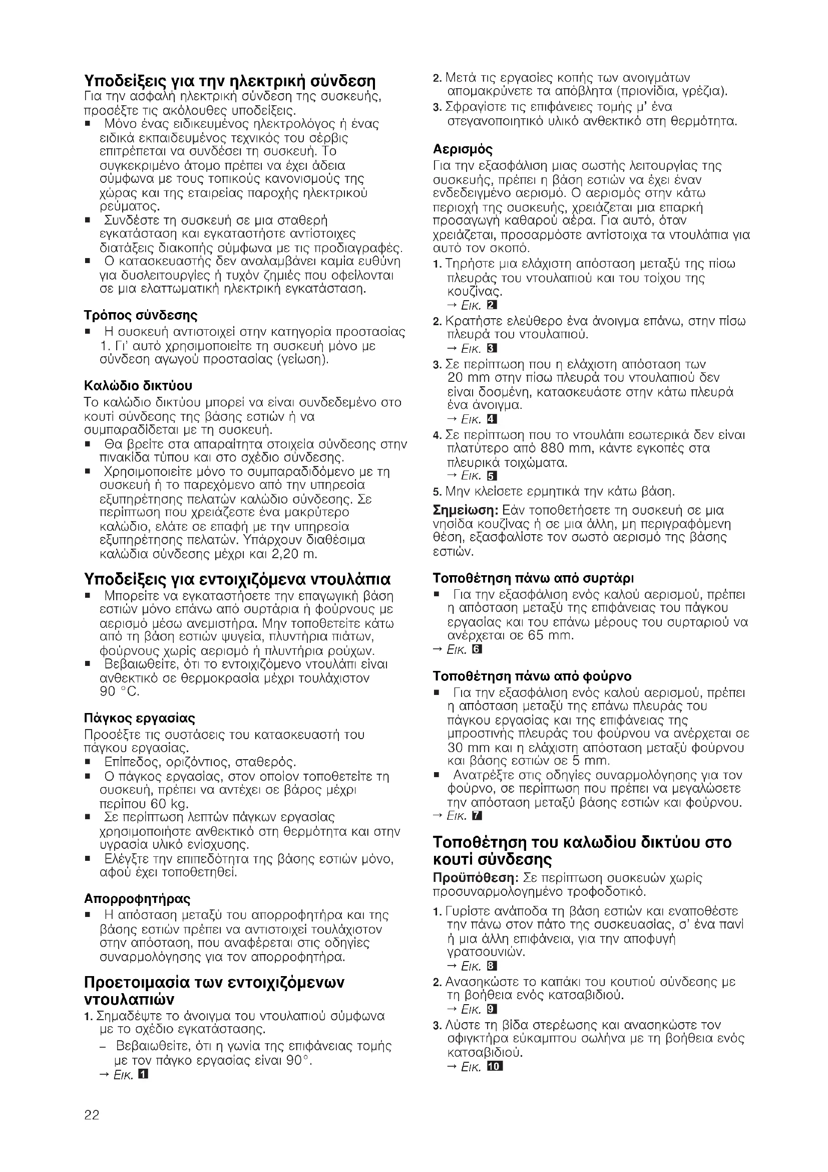 σύνδεση αγωγού προστασίας (γείωση). Καλώδιο δικτύου Το καλώδιο δικτύου μπορεί να είναι συνδεδεμένο στο κουτί σύνδεσης της βάσης εστιών ή να συμπαραδίδεται με τη συσκευή. ¡ Θα βρείτε στα απαραίτητα στοιχεία σύνδεσης στην πινακίδα τύπου και στο σχέδιο σύνδεσης. ¡ Χρησιμοποιείτε μόνο το συμπαραδιδόμενο με τη συσκευή ή το παρεχόμενο από την υπηρεσία εξυπηρέτησης πελατών καλώδιο σύνδεσης. Σε περίπτωση που χρειάζεστε ένα μακρύτερο καλώδιο, ελάτε σε επαφή με την υπηρεσία εξυπηρέτησης πελατών. Υπάρχουν διαθέσιμα καλώδια σύνδεσης μέχρι και 2,20m. Υποδείξεις για εντοιχιζόμενα ντουλάπια ¡ Μπορείτε να εγκαταστήσετε την επαγωγική βάση εστιών μόνο επάνω από συρτάρια ή φούρνους με αερισμό μέσω ανεμιστήρα. Μην τοποθετείτε κάτω από τη βάση εστιών ψυγεία, πλυντήρια πιάτων, φούρνους χωρίς αερισμό ή πλυντήρια ρούχων. ¡ Βεβαιωθείτε, ότι το εντοιχιζόμενο ντουλάπι είναι ανθεκτικό σε θερμοκρασία μέχρι τουλάχιστον 90°C. Πάγκος εργασίας Προσέξτε τις συστάσεις του κατασκευαστή του πάγκου εργασίας. ¡ Επίπεδος, οριζόντιος, σταθερός. ¡ Ο πάγκος εργασίας, στον οποίον τοποθετείτε τη συσκευή, πρέπει να αντέχει σε βάρος μέχρι περίπου 60kg. ¡ Σε περίπτωση λεπτών πάγκων εργασίας χρησιμοποιήστε ανθεκτικό στη θερμότητα και στην υγρασία υλικό ενίσχυσης. ¡ Ελέγξτε την επιπεδότητα της βάσης εστιών μόνο, αφού έχει τοποθετηθεί. Απορροφητήρας ¡ Η απόσταση μεταξύ του απορροφητήρα και της βάσης εστιών πρέπει να αντιστοιχεί τουλάχιστον στην απόσταση, που αναφέρεται στις οδηγίες συναρμολόγησης για τον απορροφητήρα. Προετοιμασία των εντοιχιζόμενων