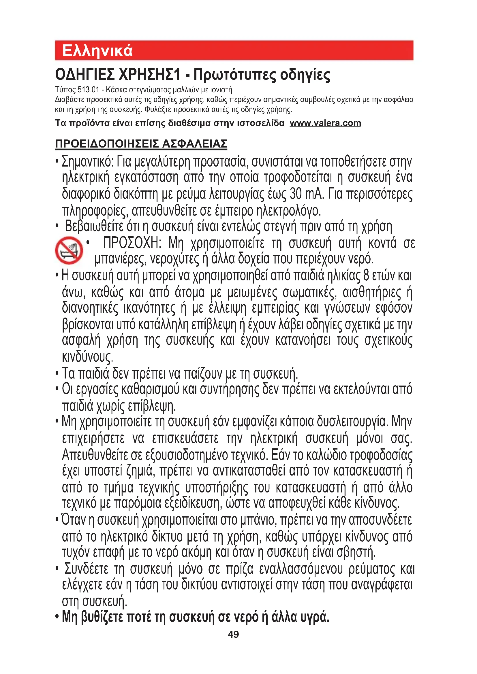 ΟΔΗΓΙΕΣ ΧΡΗΣΗΣ1 - Πρωτότυπες οδηγίες Τύπος 513.01 - Κάσκα στεγνώματος μαλλιών με ιονιστή Διαβάστε προσεκτικά αυτές τις οδηγίες χρήσης, καθώς περιέχουν σημαντικές συμβουλές σχετικά με την ασφάλεια και τη χρήση της συσκευής. Φυλάξτε προσεκτικά αυτές τις οδηγίες χρήσης. Τα προϊόντα είναι επίσης διαθέσιμα στην ιστοσελίδα www.valera.com ΠΡΟΕΙΔΟΠΟΙΗΣΕΙΣ ΑΣΦΑΛΕΙΑΣ