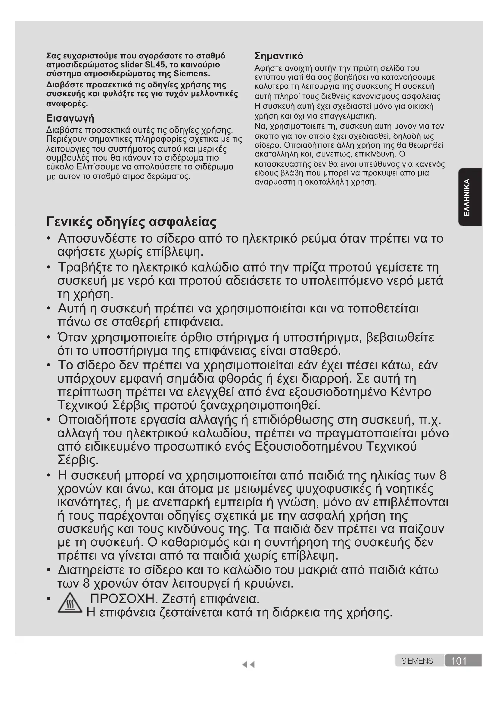 Η συσκευή αυτή αποκτά υψηλή θερμοκρασία και παράγει ατμό κατά τη λειτουργία, μπορεί να προκαλέσει κάψιμο ή έγκαυμα εάν δεν χρησιμοποιείται σωστά. Ο σωλήνας ατμού, η βάση ατμού, η μεταλλική πλάκα στο κάτω μέρος της αφαιρούμενη βάση σίδερου (2) και ιδιαίτερα το σίδερο μπορεί να ζεσταθούν κατά τη λειτουργία. Αυτό είναι φυσιολογικό. Μην κατευθύνετε τον ατμό προς άτομα ή ζώα. Μην επιτρέπετε να έρεται σε παφή το καλώδιο με τη βάση του δίτε ρου όταν αυτή είναι ζεστό. Πρέπει να γνωρίζετε ότι το σύστημα μπορεί να συνεχίσει να παράγει ατμό για ένα σύντομο χρονικό διάστημα μόλις ελευθερώσετε τη σκανδάλη ατμού. Αυτή η λειτουργία είναι φυσιολογική.103 S I E M E N S