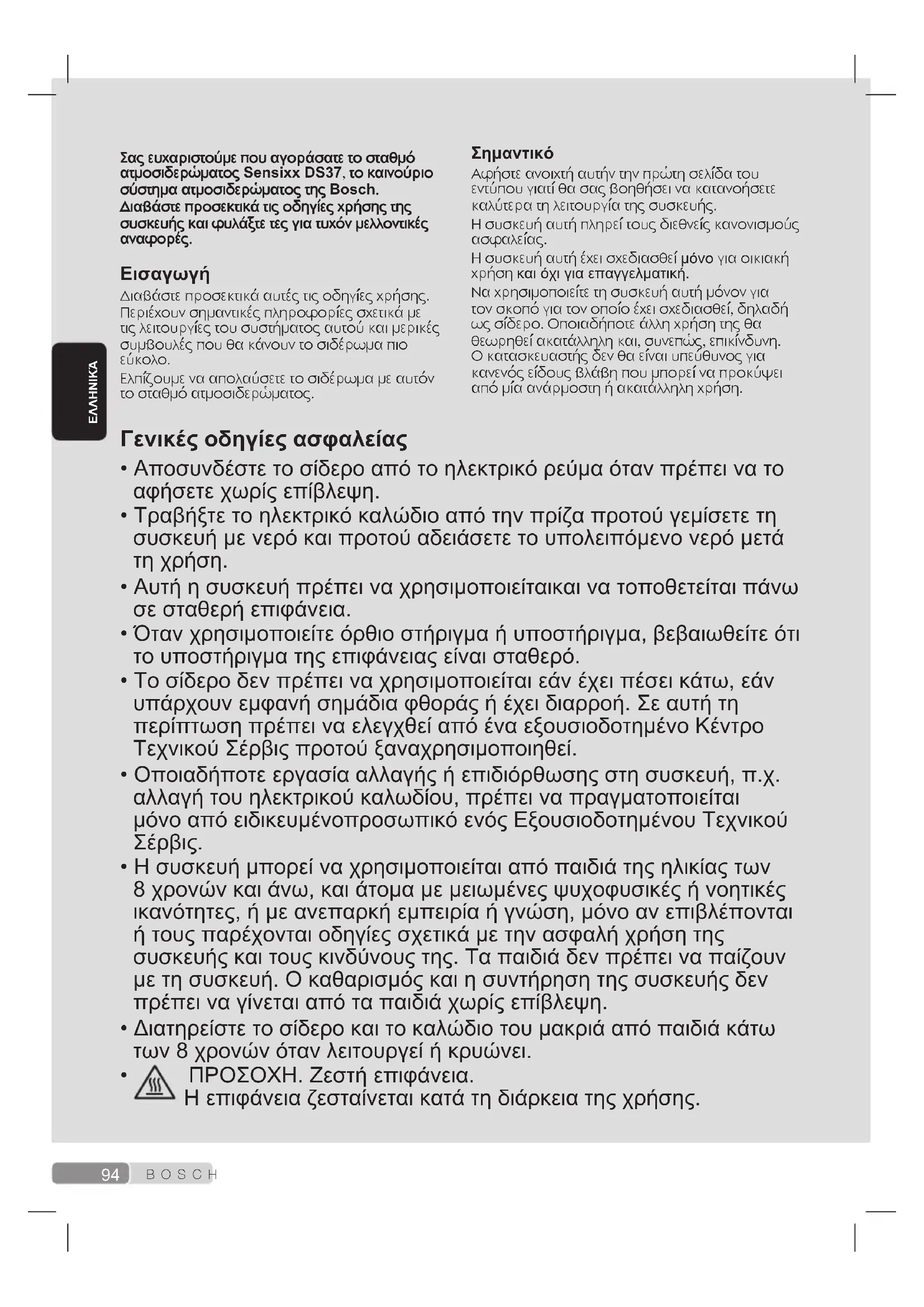 - Άπλά πατήστε τη σκανδάλη ακόμα μια φορά και το σίδερο θα σταματήσει αμέσως να βγάζει ατμό. Άν τα παραπάνω δεν επιλύσουν το πρόβλημα, επικοινωνήστε με ένα εξουσιοδοτημένο τεχνικό σέρβις. ΜπορείτεναμεταφορτώσετεαυτότοεγχειρίδιοαπότητοπικήιστοσελίδατηςBosch. B O S C H TÜRK Bosch’tanyeniprofesyonelbuharlaütüleme sistemi,SensixxDS37buharistasyonunu satınaldığınıziçinteşekkürederiz. Cihazınkullanımtalimatlarınıdikkatlibir sekildeokuyunvedahasonradanışmak amacıylasaklayın Giriş