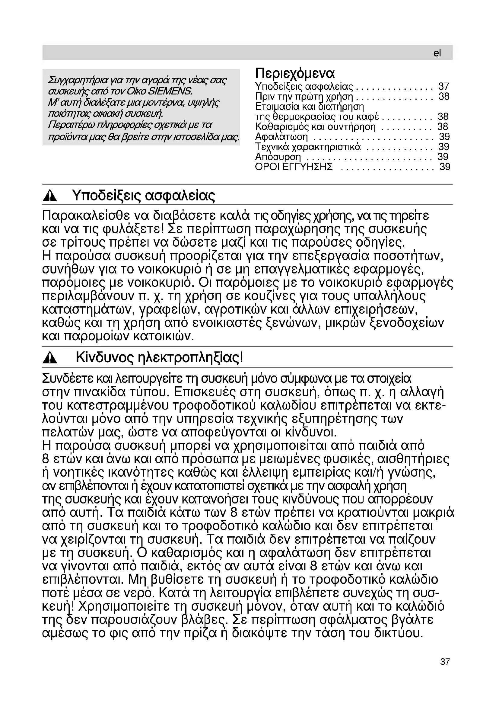 Συγχαρητήρια για την αγορά της νέας σας συσκευής από τον Oίκο SIEMENS. Μ’ αυτή διαλέξατε μια μοντέρνα, υψηλής ποιότητας οικιακή συσκευή. Περαιτέρω πληροφορίες σχετικά με τα προϊόντα μας θα βρείτε στην ιστοσελίδα μας.38 , Κίνδυνος εγκαυμάτων και πυρκαγιάς! Κατά τη λειτουργία πιάνετε τα μέρη της συσκευής και τη γυάλινη κανάτα μόνο στις λαβές που έχουν προβλεφθεί γι’ αυτό. Μην αφήνετε τη συσκευή επάνω ή κοντά σε καυτές επιφάνειες, όπως π. χ. εστίες κουζίνας. Μην καλύπτετε ποτέ την επιφάνεια απόθεσης της κανάτας. , Κίνδυνος ασφυξίας! Μην αφήνετε τα παιδιά να παίζουν με τα υλικά συσκευασίας. Σ' αυτές τις οδηγίες χρήσης περιγράφονται διάφορα μοντέλα: – Βασικό μοντέλο (Εικόνα 6a) μόνο με διακόπτη On/Off,– Το μοντέλο (Εικόνα 6b) έχει έναν επι-πλέον διακόπτη για επιλογή φλιτζανιών,Όλα τα μοντέλα είναι προγραμματισμένα με αυτόματη απενεργοποίηση ”auto off” (εξοικονόμηση ενέργειας), η οποία θέτει τη συσκευή μετά από περ. 40 λεπτά εκτός λειτουργίας. Πριν την πρώτη χρήση Αφήστε να περάσουν από τη συσκευή δύο φορές 9 φλιτζάνια νερό (χωρίς καφέ), για να καθαριστεί η συσκευή. Ενδεχομένως μπορεί να παρουσιαστεί μια ακίνδυνη ελαφριά οσμή στη συσκευή λόγω του ότι είναι καινούργια.Στην περίπτωση αυτή αφήνετε να περάσει ένα αραιό διάλυμα ξιδιού (2 φλιτζάνια ξίδι προς 6 φλιτζάνια νερό), στη συνέχεια δύο φορές 9 φλιτζάνια νερό. Ετοιμασία και διατήρηση της θερμοκρασίας του καφέ Εικόνα 1 έως 5Γεμίζετε το δοχείο νερού μόνο με καθαρό νερό και σε καμιά περίπτωση με γάλα ή έτοιμα ποτά όπως τσάι ή καφές! (Αλλοίωση γεύσης του καφέ στις επόμενες χρήσεις.) Τοποθετήστε το φίλτρο 1x4 μέσα στη συγκράτηση φίλτρου.Χρησιμοποιείτε μέτρια αλεσμένο καφέ (συνιστούμε περ. 7 g για κάθε φλιτζάνι). Για λιγότερα φλιτζάνια χρησιμοποιείτε λίγο περισσότερο καφέ απ' ότι για μεγαλύτερο αριθμό φλιτζανιών.Εκχυλίζετε τουλάχιστον 3 μεγάλα φλιτζάνια καφέ, γιατί διαφορετικά ο καφές δεν έχει την επιθυμητή θερμοκρασία ούτε είναι τόσο δυνατός όσο επιθυμείτε.= περ. 125 ml = περ. 85 mlΗ πλάκα διατήρησης θερμοκρασίας παραμένει ζεστή για ακόμα κάποιο διάστημα και μετά τη λήξη της λειτουργίας.Δεν επιτρέπεται να ξαναγεμίσετε την καφε-τιέρα με νερό, αν αυτή δεν κρυώσει πρώτα 5 λεπτά.Κατά τον ίδιο τρόπο μπορεί να ετοιμαστεί και τσάι. Διακόπτης για την επιλογή αριθμού