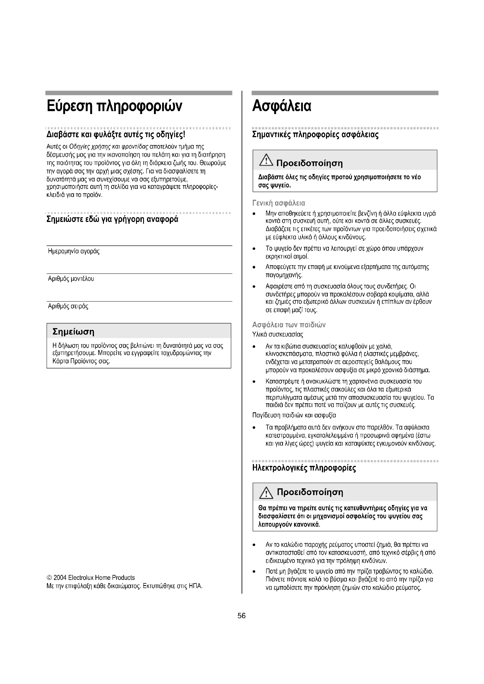 © 2004 Electrolux Home Products Με την επιφύλαξη κάθε δικαιώµατος. Εκτυπώθηκε στις ΗΠΑ.