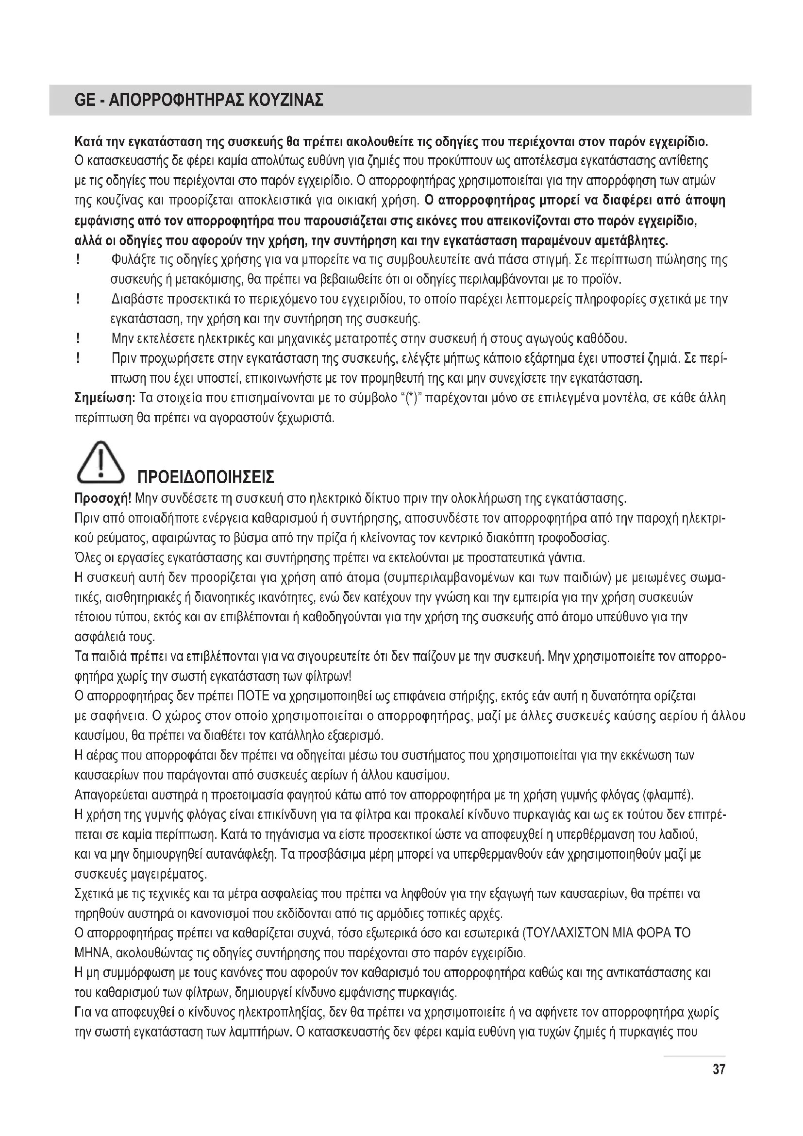 Κατά την εγκατάσταση της συσκευής θα πρέπει ακολουθείτε τις οδηγίες που περιέχονται στον παρόν εγχειρίδιο. Ο κατασκευαστής δε φέρει καμία απολύτως ευθύνη για ζημιές που προκύπτουν ως αποτέλεσμα εγκατάστασης αντίθετης με τις οδηγίες που περιέχονται στο παρόν εγχειρίδιο. Ο απορροφητήρας χρησιμοποιείται για την απορρόφηση των ατμών της κουζίνας και προορίζεται αποκλειστικά για οικιακή χρήση. Ο απορροφητήρας μπορεί να διαφέρει από άποψη εμφάνισης από τον απορροφητήρα που παρουσιάζεται στις εικόνες που απεικονίζονται στο παρόν εγχειρίδιο, αλλά οι οδηγίες που αφορούν την χρήση, την συντήρηση και την εγκατάσταση παραμένουν αμετάβλητες. ! Φυλάξτε τις οδηγίες χρήσης για να μπορείτε να τις συμβουλευτείτε ανά πάσα στιγμή. Σε περίπτωση πώλησης της συσκευής ή μετακόμισης, θα πρέπει να βεβαιωθείτε ότι οι οδηγίες περιλαμβάνονται με το προϊόν. ! Διαβάστε προσεκτικά το περιεχόμενο του εγχειριδίου, το οποίο παρέχει λεπτομερείς πληροφορίες σχετικά με την εγκατάσταση, την χρήση και την συντήρηση της συσκευής. ! Μην εκτελέσετε ηλεκτρικές και μηχανικές μετατροπές στην συσκευή ή στους αγωγούς καθόδου. ! Πριν προχωρήσετε στην εγκατάσταση της συσκευής, ελέγξτε μήπως κάποιο εξάρτημα έχει υποστεί ζημιά. Σε περί- πτωση που έχει υποστεί, επικοινωνήστε με τον προμηθευτή της και μην συνεχίσετε την εγκατάσταση. Σημείωση: Τα στοιχεία που επισημαίνονται με το σύμβολο “(*)” παρέχονται μόνο σε επιλεγμένα μοντέλα, σε κάθε άλλη περίπτωση θα πρέπει να αγοραστούν ξεχωριστά. ΠΡΟΕΙΔΟΠΟΙΗΣΕΙΣ Προσοχή! Μην συνδέσετε τη συσκευή στο ηλεκτρικό δίκτυο πριν την ολοκλήρωση της εγκατάστασης. Πριν από οποιαδήποτε ενέργεια καθαρισμού ή συντήρησης, αποσυνδέστε τον απορροφητήρα από την παροχή ηλεκτρι- κού ρεύματος, αφαιρώντας το βύσμα από την πρίζα ή κλείνοντας τον κεντρικό διακόπτη τροφοδοσίας. Όλες οι εργασίες εγκατάστασης και συντήρησης πρέπει να εκτελούνται με προστατευτικά γάντια. Η συσκευή αυτή δεν προορίζεται για χρήση από άτομα (συμπεριλαμβανομένων και των παιδιών) με μειωμένες σωμα- τικές, αισθητηριακές ή διανοητικές ικανότητες, ενώ δεν κατέχουν την γνώση και την εμπειρία για την χρήση συσκευών τέτοιου τύπου, εκτός και αν επιβλέπονται ή καθοδηγούνται για την χρήση της συσκευής από άτομο υπεύθυνο για την ασφάλειά τους. Τα παιδιά πρέπει να επιβλέπονται για να σιγουρευτείτε ότι δεν παίζουν με την συσκευή. Μην χρησιμοποιείτε τον απορρο- φητήρα χωρίς την σωστή εγκατάσταση των φίλτρων! Ο απορροφητήρας δεν πρέπει ΠΟΤΕ να χρησιμοποιηθεί ως επιφάνεια στήριξης, εκτός εάν αυτή η δυνατότητα ορίζεται με σαφήνεια. Ο χώρος στον οποίο χρησιμοποιείται ο απορροφητήρας, μαζί με άλλες συσκευές καύσης αερίου ή άλλου καυσίμου, θα πρέπει να διαθέτει τον κατάλληλο εξαερισμό. Η αέρας που απορροφάται δεν πρέπει να οδηγείται μέσω του συστήματος που χρησιμοποιείται για την εκκένωση των καυσαερίων που παράγονται από συσκευές αερίων ή άλλου καυσίμου. Απαγορεύεται αυστηρά η προετοιμασία φαγητού κάτω από τον απορροφητήρα με τη χρήση γυμνής φλόγας (φλαμπέ). Η χρήση της γυμνής φλόγας είναι επικίνδυνη για τα φίλτρα και προκαλεί κίνδυνο πυρκαγιάς και ως εκ τούτου δεν επιτρέ- πεται σε καμία περίπτωση. Κατά το τηγάνισμα να είστε προσεκτικοί ώστε να αποφευχθεί η υπερθέρμανση του λαδιού, και να μην δημιουργηθεί αυτανάφλεξη. Τα προσβάσιμα μέρη μπορεί να υπερθερμανθούν εάν χρησιμοποιηθούν μα