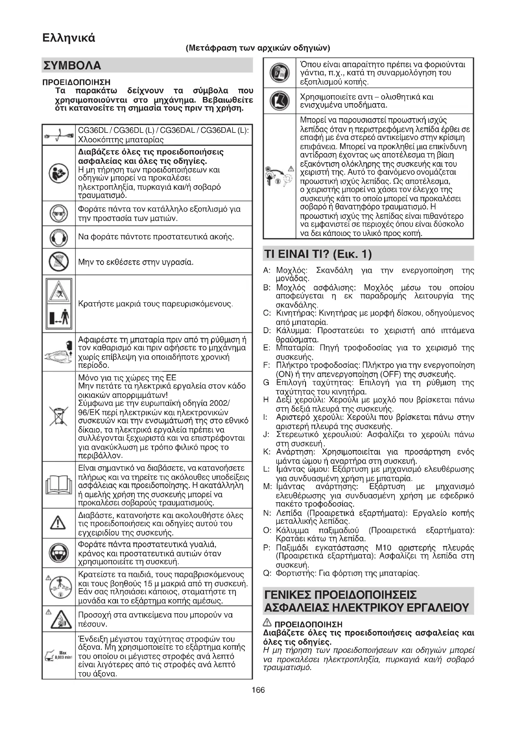ΠΡΟΕΙΔΟΠΟΙΗΣΗ Τα παρακάτω δείχνουν τα σύμβολα που χρησιμοποιούνται στο μηχάνημα. Βεβαιωθείτε ότι κατανοείτε τη σημασία τους πριν τη χρήση. CG36DL / CG36DL (L) / CG36DAL / CG36DAL (L): Χλοοκόπτης μπαταρίας Διαβάζετε όλες τις προειδοποιήσεις ασφαλείας και όλες τις οδηγίες. Η μη τήρηση των προειδοποιήσεων και οδηγιών μπορεί να προκαλέσει ηλεκτροπληξία, πυρκαγιά και/ή σοβαρό τραυματισμό. Φοράτε πάντα τον κατάλληλο εξοπλισμό για την προστασία των ματιών. Να φοράτε πάντοτε προστατευτικά ακοής. Μην το εκθέσετε στην υγρασία. Κρατήστε μακριά τους παρευρισκόμενους. Αφαιρέστε τη μπαταρία πριν από τη ρύθμιση ή τον καθαρισμό και πριν αφήσετε το μηχάνημα χωρίς επίβλεψη για οποιαδήποτε χρονική