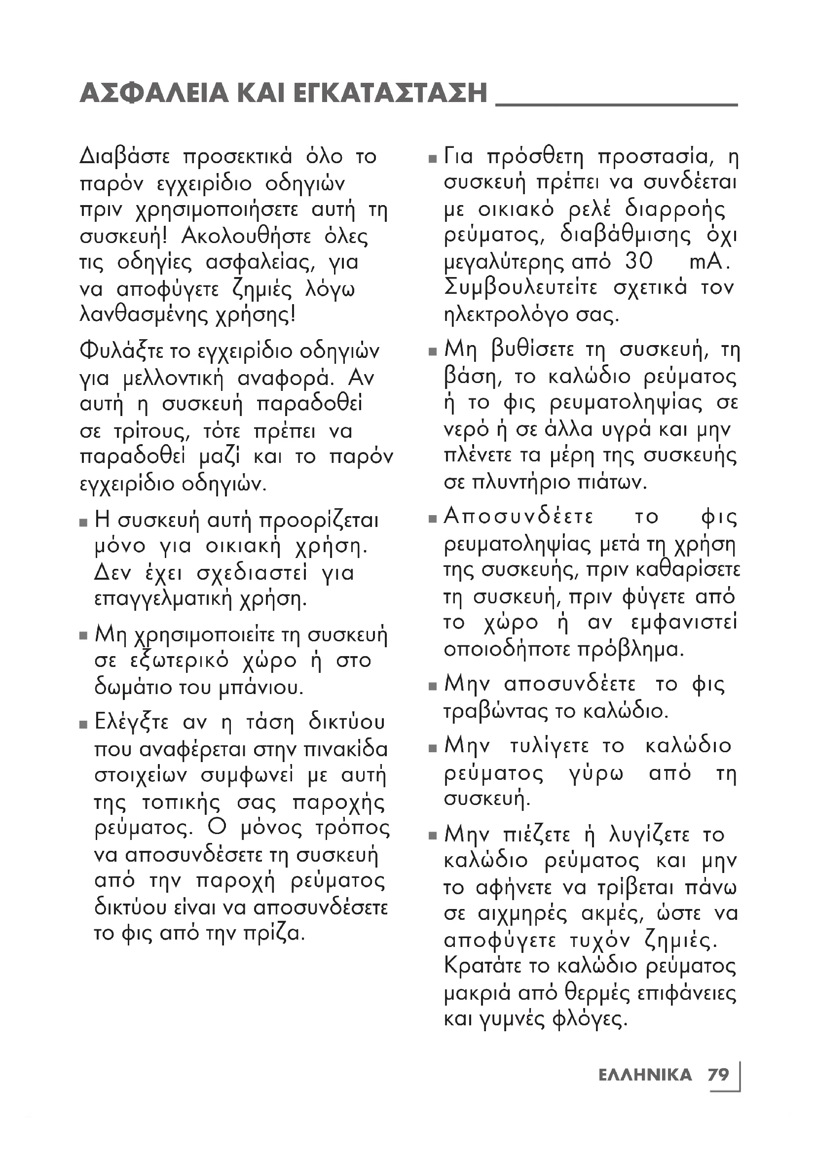 Μη χρησιμοποιείτε τη συσκευή με υγρά ή βρεγμένα χέρια. ΑΣΦΑΛΕΙΑ ΚΑΙ ΕΓΚΑΤΑΣΤΑΣΗ _________________