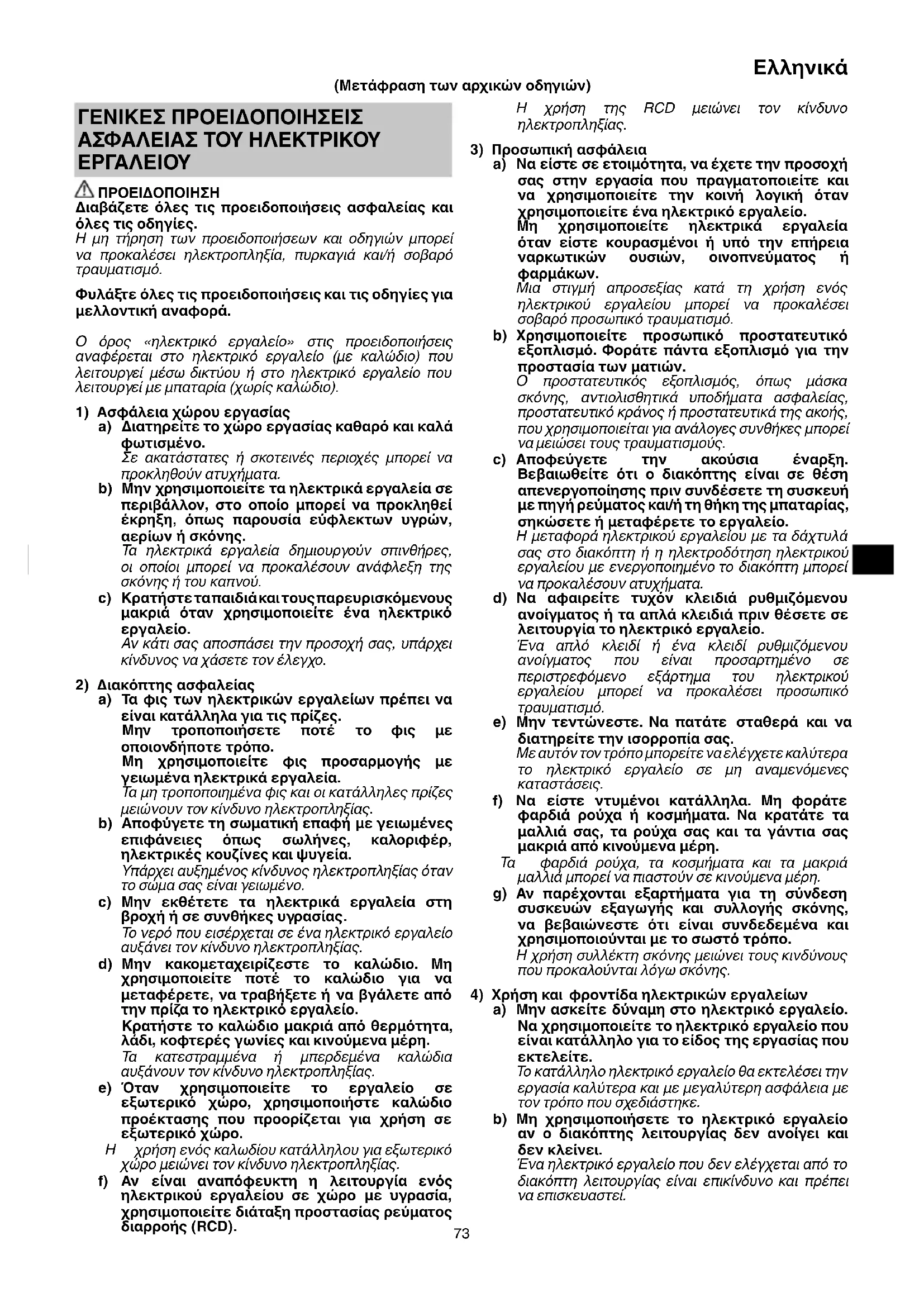 ΠΡΟΕΙΔΟΠΟΙΗΣΗ Διαβάζετε όλες τις προειδοποιήσεις ασφαλείας και όλες τις οδηγίες. Η μη τήρηση των προειδοποιήσεων και οδηγιών μπορεί να προκαλέσει ηλεκτροπληξία, πυρκαγιά και/ή σοβαρό τραυματισμό. Φυλάξτε όλες τις προειδοποιήσεις και τις οδηγίες για μελλοντική αναφορά. Ο όρος «ηλεκτρικό εργαλείο» στις προειδοποιήσεις αναφέρεται στο ηλεκτρικό εργαλείο (με καλώδιο) που λειτουργεί μέσω δικτύου ή στο ηλεκτρικό εργαλείο που λειτουργεί με μπαταρία (χωρίς καλώδιο).