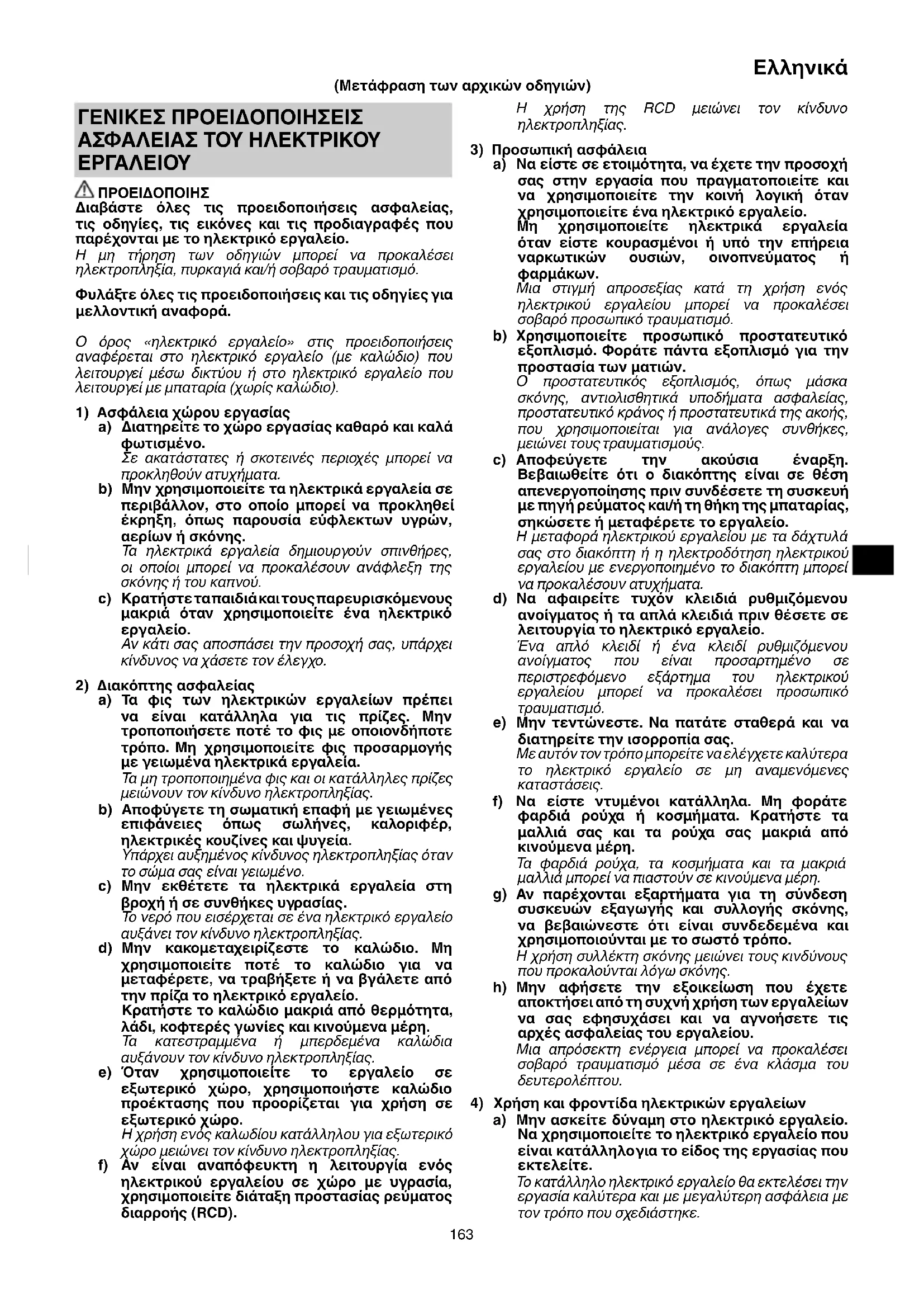 a) Τα φις των ηλεκτρικών εργαλείων πρέπει να είναι κατάλληλα για τις πρίζες. Μην τροποποιήσετε ποτέ το φις με οποιονδήποτε τρόπο. Μη χρησιμοποιείτε φις προσαρμογής με γειωμένα ηλεκτρικά εργαλεία. Τα μη τροποποιημένα φις και οι κατάλληλες πρίζες μειώνουν τον κίνδυνο ηλεκτροπληξίας. b) Αποφύγετε τη σωματική επαφή με γειωμένες επιφάνειες όπως σωλήνες, καλοριφέρ, ηλεκτρικές κουζίνες και ψυγεία. Υπάρχει αυξημένος κίνδυνος ηλεκτροπληξίας όταν το σώμα σας είναι γειωμένο. c) Μην εκθέτετε τα ηλεκτρικά εργαλεία στη βροχή ή σε συνθήκες υγρασίας. Το νερό που εισέρχεται σε ένα ηλεκτρικό εργαλείο αυξάνει τον κίνδυνο ηλεκτροπληξίας. d) Μην κακομεταχειρίζεστε το καλώδιο. Μη χρησιμοποιείτε ποτέ το καλώδιο για να μεταφέρετε, να τραβήξετε ή να βγάλετε από την πρίζα το ηλεκτρικό εργαλείο. Κρατήστε το καλώδιο μακριά από θερμότητα, λάδι, κοφτερές γωνίες και κινούμενα μέρη. Τα κατεστραμμένα ή μπερδεμένα καλώδια αυξάνουν τον κίνδυνο ηλεκτροπληξίας. e) Όταν χρησιμοποιείτε το εργαλείο σε εξωτερικό χώρο, χρησιμοποιήστε καλώδιο προέκτασης που προορίζεται για χρήση σε εξωτερικό χώρο. Η χρήση ενός καλωδίου κατάλληλου για εξωτερικό χώρο μειώνει τον κίνδυνο ηλεκτροπληξίας. f) Αν είναι αναπόφευκτη η λειτουργία ενός ηλεκτρικού εργαλείου σε χώρο με υγρασία, χρησιμοποιείτε διάταξη προστασίας ρεύματος διαρροής (RCD). (Μετάφραση των αρχικών οδηγιών) 0000BookC3605DAEU.indb1630000BookC3605DAEU.indb163 2018/12/1413:39:082018/12/1413:39:08164