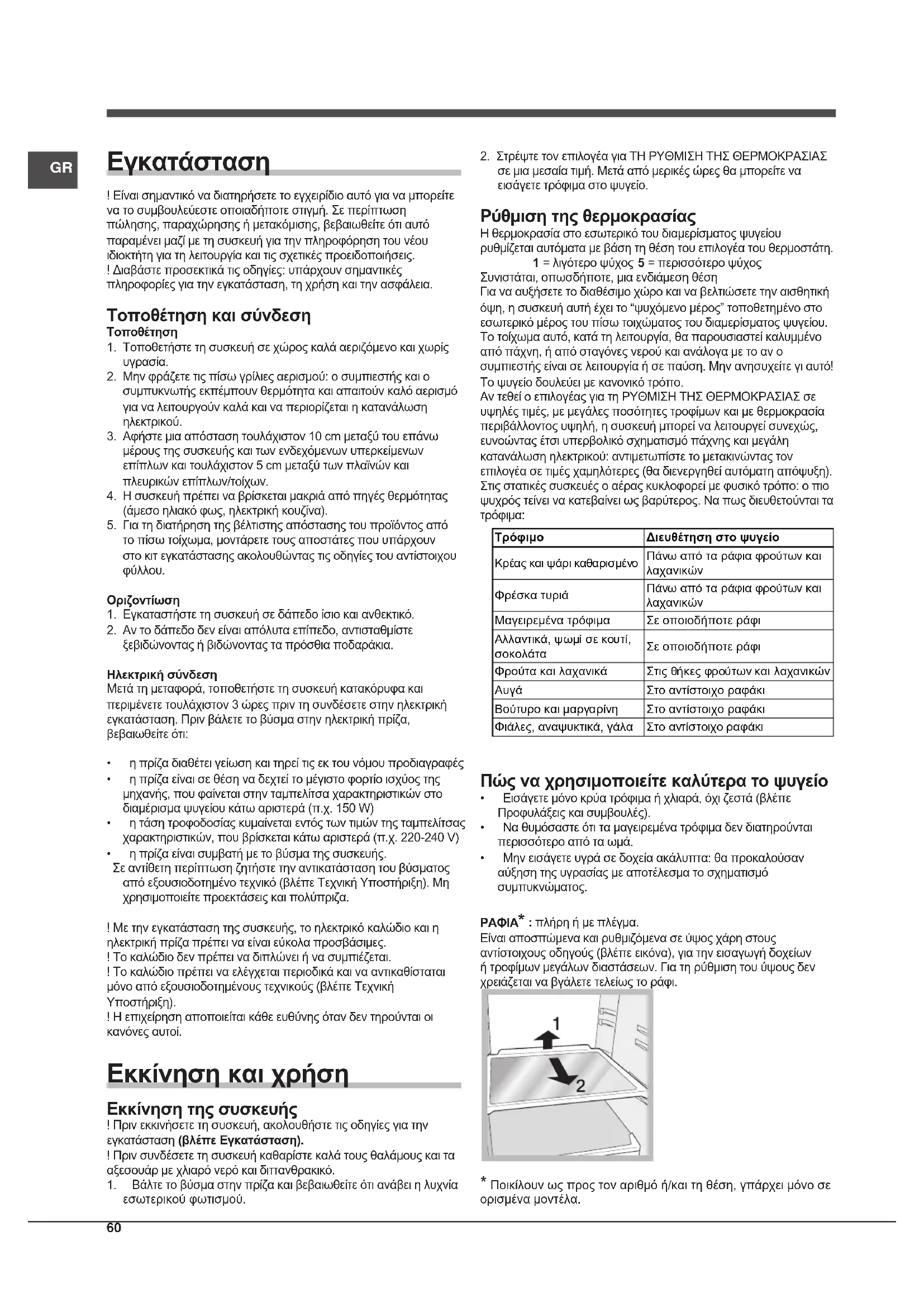 Εγκατάσταση ! Είναι σημαντικό να διατηρήσετε το εγχειρίδιο αυτό για να μπορείτε να το συμβουλεύεστε οποιαδήποτε στιγμή. Σε περίπτωση πώλησης, παραχώρησης ή μετακόμισης, βεβαιωθείτε ότι αυτό παραμένει μαζί με τη συσκευή για την πληροφόρηση του νέου ιδιοκτήτη για τη λειτουργία και τις σχετικές προειδοποιήσεις.! Διαβάστε προσεκτικά τις οδηγίες: υπάρχουν σημαντικές πληροφορίες για την εγκατάσταση, τη χρήση και την ασφάλεια. Τοποθέτηση και σύνδεση Τοποθέτηση1. Τοποθετήστε τη συσκευή σε χώρος καλά αεριζόμενο και χωρίς υγρασία.2. Μην φράζετε τις πίσω γρίλιες αερισμού: ο συμπιεστής και ο συμπυκνωτής εκπέμπουν θερμότητα και απαιτούν καλό αερισμό για να λειτουργούν καλά και να περιορίζεται η κατανάλωση ηλεκτρικού.3. Αφήστε μια απόσταση τουλάχιστον 10 cm μεταξύ του επάνω μέρους της συσκευής και των ενδεχόμενων υπερκείμενων επίπλων και τουλάχιστον 5 cm μεταξύ των πλαϊνών και πλευρικώνεπίπλων/τοίχων.4. Η συσκευή πρέπει να βρίσκεται μακριά από πηγές θερμότητας (άμεσο ηλιακό φως, ηλεκτρική κουζίνα).5. Για τη διατήρηση της βέλτιστης απόστασης του προϊόντος από το πίσω τοίχωμα, μοντάρετε τους αποστάτες που υπάρχουν στο κιτ εγκατάστασης ακολουθώντας τις οδηγίες του αντίστοιχου φύλλου.Οριζοντίωση1. Εγκαταστήστε τη συσκευή σε δάπεδο ίσιο και ανθεκτικό.2. Αν το δάπεδο δεν είναι απόλυτα επίπεδο, αντισταθμίστε ξεβιδώνοντας ή βιδώνοντας τα πρόσθια ποδαράκια.Ηλεκτρική σύνδεσηΜετά τη μεταφορά, τοποθετήστε τη συσκευή κατακόρυφα και περιμένετε τουλάχιστον 3 ώρες πριν τη συνδέσετε στην ηλεκτρική εγκατάσταση. Πριν βάλετε το βύσμα στην ηλεκτρική πρίζα, βεβαιωθείτε ότι:• ηπρίζαδιαθέτειγείωσηκαιτηρείτιςεκτουνόμουπροδιαγραφές• ηπρίζαείναισεθέσηναδεχτείτομέγιστοφορτίοισχύοςτηςμηχανής, που φαίνεται στην ταμπελίτσα χαρακτηριστικών στο διαμέρισμα ψυγείου κάτω αριστερά (π.χ. 150 W)• ητάσητροφοδοσίαςκυμαίνεταιεντόςτωντιμώντηςταμπελίτσαςχαρακτηριστικών, που βρίσκεται κάτω αριστερά (π.χ. 220-240 V)• ηπρίζαείναισυμβατήμετοβύσματηςσυσκευής. Σε αντίθετη περίπτωση ζητήστε την αντικατάσταση του βύσματος από εξουσιοδοτημένο τεχνικό (βλέπε Τεχνική Υποστήριξη). Μη χρησιμοποιείτε προεκτάσεις και πολύπριζα.! Με την εγκατάσταση της συσκευής, το ηλεκτρικό καλώδιο και η ηλεκτρική πρίζα πρέπει να είναι εύκολα προσβάσιμες.! Το καλώδιο δεν πρέπει να διπλώνει ή να συμπιέζεται.! Το καλώδιο πρέπει να ελέγχεται περιοδικά και να αντικαθίσταται μόνο από εξουσιοδοτημένους τεχνικούς (βλέπε Τεχνική Υποστήριξη).! Η επιχείρηση αποποιείται κάθε ευθύνης όταν δεν τηρούνται οι κανόνες αυτοί. Εκκίνηση και χρήση Εκκίνηση της συσκευής ! Πριν εκκινήσετε τη συσκευή, ακολουθήστε τις οδηγίες για την εγκατάσταση (βλέπε Εγκατάσταση).! Πριν συνδέσετε τη συσκευή καθαρίστε καλά τους θαλάμους και τα αξεσουάρ με χλιαρό νερό και διττανθρακικό.1. Βάλτετοβύσμαστηνπρίζακαιβεβαιωθείτεότιανάβειηλυχνίαεσωτερικού φωτισμού.2. Στρέψτε τον επιλογέα για ΤΗ ΡΥΘΜΙΣΗ ΤΗΣ ΘΕΡΜΟΚΡΑΣΙΑΣ σε μια μεσαία τιμή. Μετά από μερικές ώρες θα μπορείτε να εισάγετε τρόφιμα στο ψυγείο. Ρύθμιση της θερμοκρασίας Η θερμοκρασία στο εσωτερικό του διαμερίσματος ψυγείου ρυθμίζεται αυτόματα με βάση τη θέση του επιλογέα του θερμοστάτη. 1 = λιγότερο ψύχος 5 = περισσότερο ψύχος Συνιστάται, οπωσδήποτε, μια ενδιάμεση θέσηΓια να αυξήσετε το διαθέσιμο χώρο και να βελτιώσετε την αισθητική όψη, η συσκευή αυτή έχει το “ψυχόμενο μέρος” τοπ