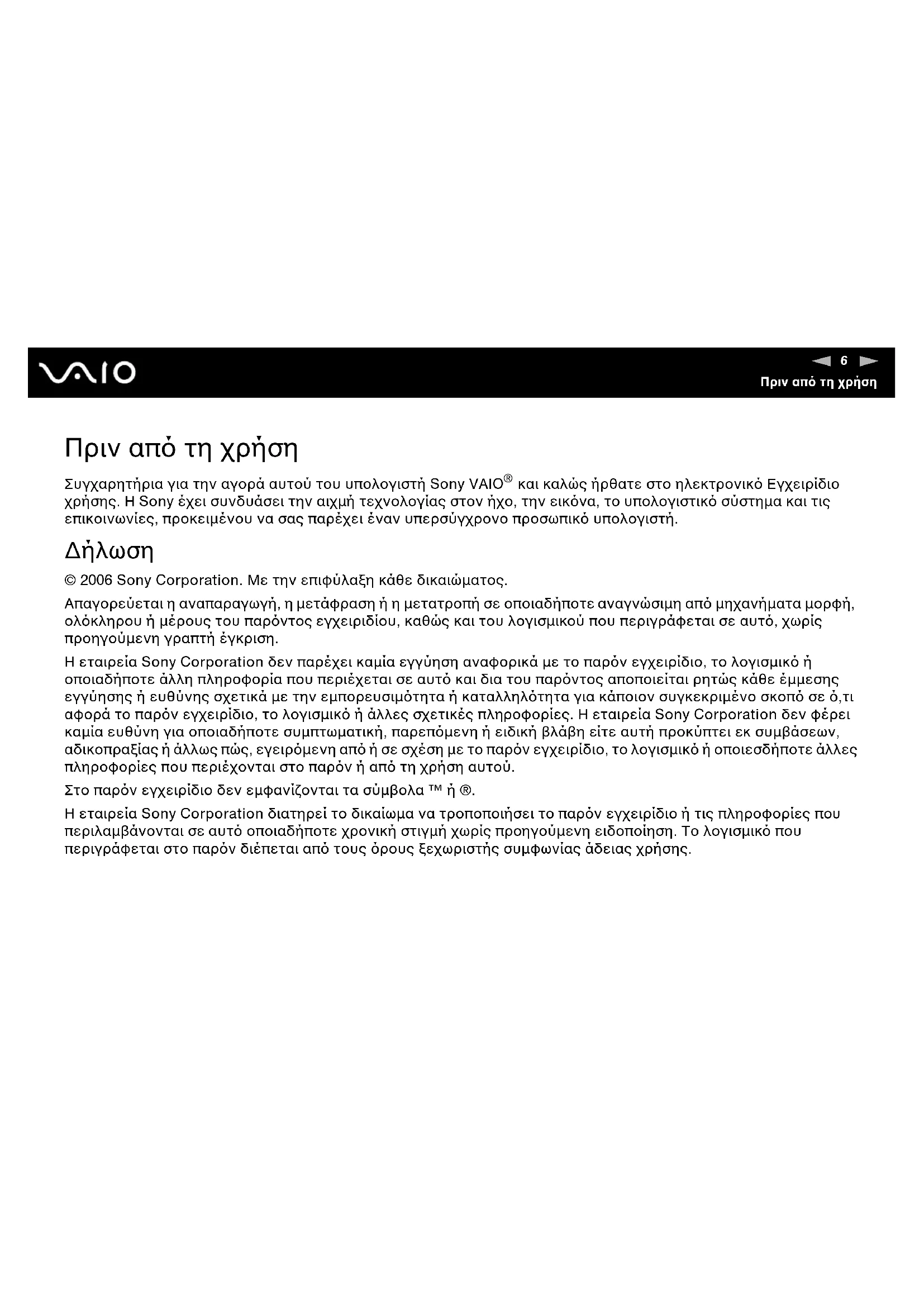 © 2006 Sony Corporation. Με την επιφύλαξη κάθε δικαιώµατος. Απαγορεύεται η αναπαραγωγή, η µετάφραση ή η µετατροπή σε οποιαδήποτε αναγνώσιµη απ µηχανήµατα µορφή, ολκληρου ή µέρους του παρντος εγχειριδίου, καθώς και του λογισµικού που περιγράφεται σε αυτ, χωρίς προηγούµενη γραπτή έγκριση. Η εταιρεία Sony Corporation δεν παρέχει καµία εγγύηση αναφορικά µε το παρν εγχειρίδιο, το λογισµικ ή οποιαδήποτε άλλη πληροφορία που περιέχεται σε αυτ και δια του παρντος αποποιείται ρητώς κάθε έµµεσης εγγύησης ή ευθύνης σχετικά µε την εµπορευσιµτητα ή καταλληλτητα για κάποιον συγκεκριµένο σκοπ σε ,τι αφορά το παρν εγχειρίδιο, το λογισµικ ή άλλες σχετικές πληροφορίες. Η εταιρεία Sony Corporation δεν φέρει καµία ευθύνη για οποιαδήποτε συµπτωµατική, παρεπµενη ή ειδική βλάβη είτε αυτή προκύπτει εκ συµβάσεων, αδικοπραξίας ή άλλως πώς, εγειρµενη απ ή σε σχέση µε το παρν εγχειρίδιο, το λογισµικ ή οποιεσδήποτε άλλες πληροφορίες που περιέχονται στο παρν ή απ τη χρήση αυτού. Στο παρν εγχειρίδιο δεν εµφανίζονται τα σύµβολα ™ ή ®. Η εταιρεία Sony Corporation διατηρεί το δικαίωµα να τροποποιήσει το παρν εγχειρίδιο ή τις πληροφορίες που περιλαµβάνονται σε αυτ οποιαδήποτε χρονική στιγµή χωρίς προηγούµενη ειδοποίηση. Το λογισµικ που περιγράφεται στο παρν διέπεται απ τους ρους ξεχωριστής συµφωνίας άδειας χρήσης.7