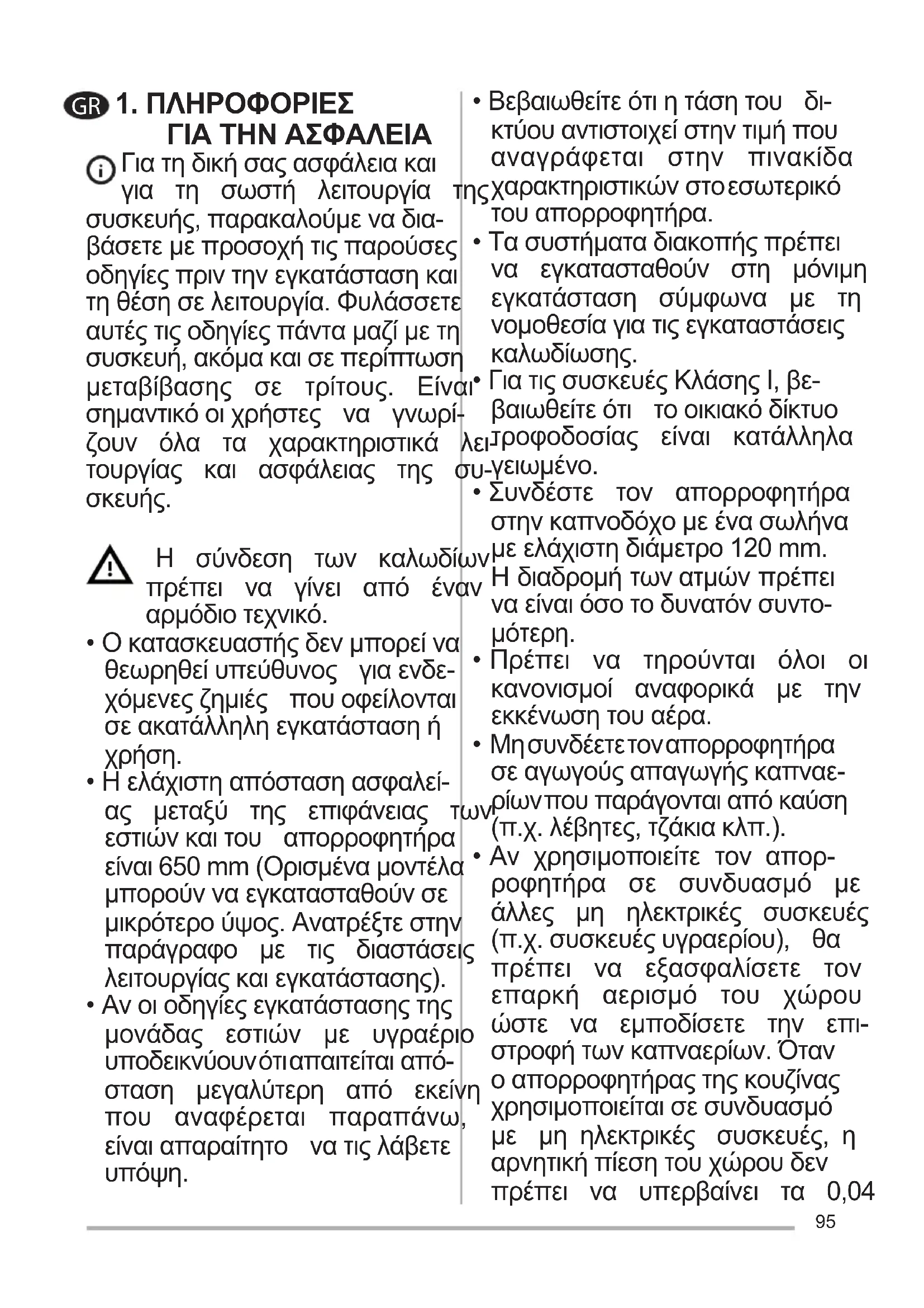 - Αν χρησιμοποιείτε τον απορ- ροφητήρα σε συνδυασμό με άλλες μη ηλεκτρικές συσκευές (π.χ.συσκευέςυγραερίου), θα πρέπει να εξασφαλίσετε τον επαρκή αερισμό του χώρου ώστε να εμποδίσετε την επι- στροφήτωνκαπναερίων.Όταν οαπορροφητήραςτηςκουζίνας χρησιμοποιείταισεσυνδυασμό με μη ηλεκτρικές συσκευές, η αρνητικήπίεσητουχώρουδεν πρέπει να υπερβαίνει τα 0,04 GR96 mbarέτσιώστενααποφεύγεται η επιστροφή των καπναερίων στο χώρο και η αναρρόφησή τουςαπότοναπορροφητήρα.