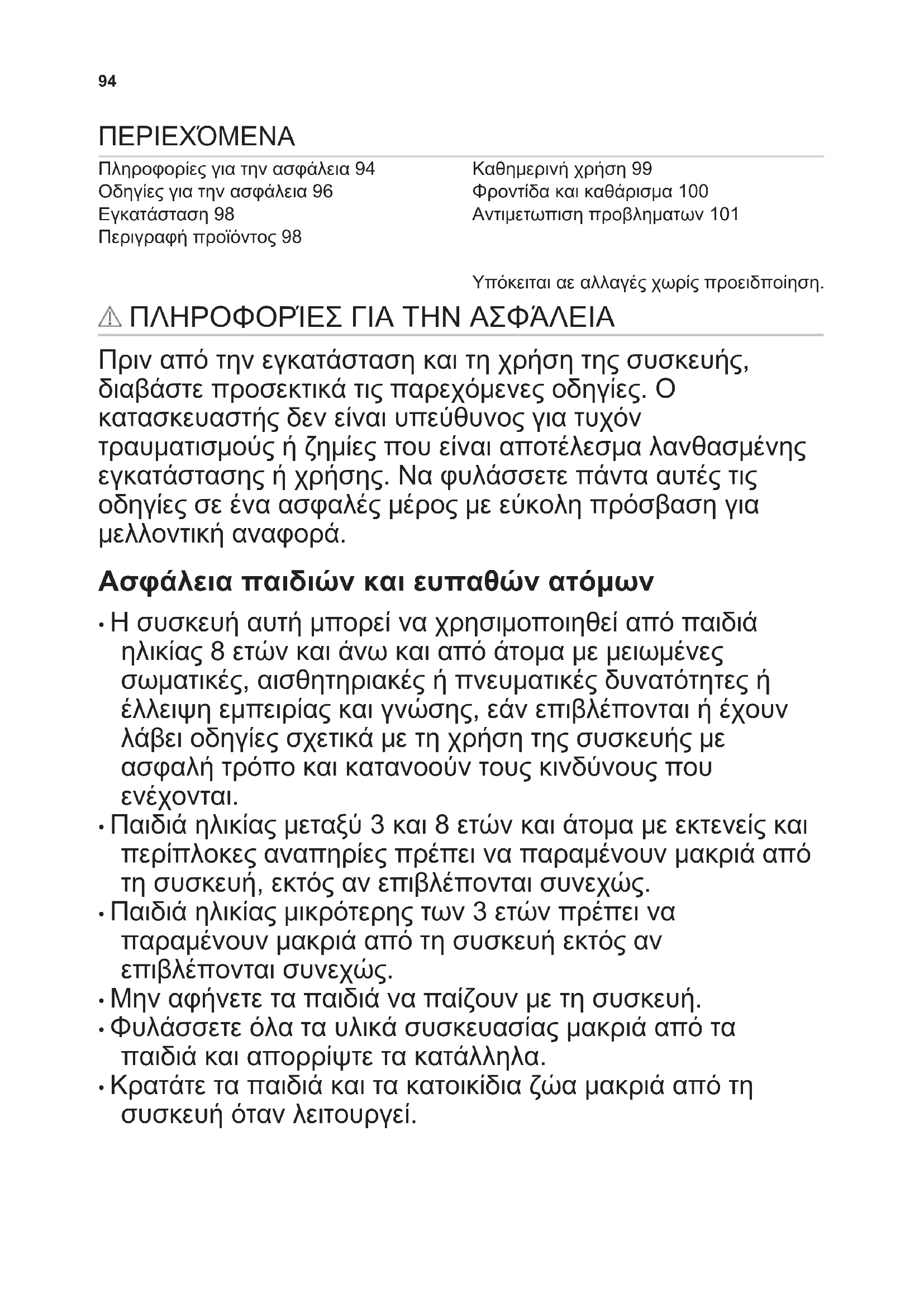 - Κρατάτε τα παιδιά και τα κατοικίδια ζώα μακριά από τη συσκευή όταν λειτουργεί. 94• Τα παιδιά δεν πρέπει να εκτελούν τον καθαρισμό και τη συντήρηση που εκτελεί ο χρήστης στη συσκευή χωρίς