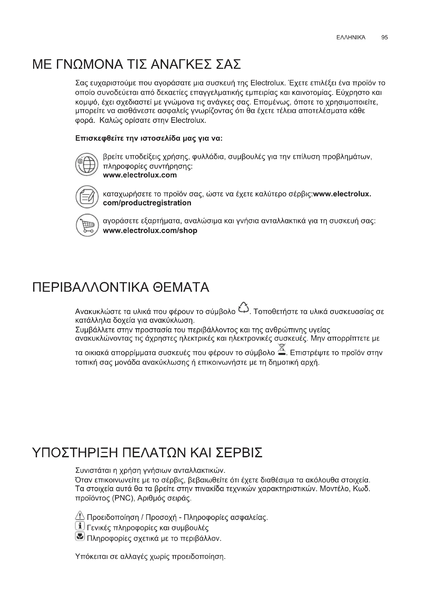 ΜΕ ΓΝΩΜΟΝΑ ΤΙΣ ΑΝΑΓΚΕΣ ΣΑΣ Σας ευχαριστούμε που αγοράσατε μια συσκευή της Electrolux. Έχετε επιλέξει ένα προϊόν το οποίο συνοδεύεται από δεκαετίες επαγγελματικής εμπειρίας και καινοτομίας. Εύχρηστο και κομψό, έχει σχεδιαστεί με γνώμονα τις ανάγκες σας. Επομένως, όποτε το χρησιμοποιείτε, μπορείτε να αισθάνεστε ασφαλείς γνωρίζοντας ότι θα έχετε τέλεια αποτελέσματα κάθε φορά. Καλώς ορίσατε στην Electrolux. Επισκεφθείτε την ιστοσελίδα μας για να: βρείτε υποδείξεις χρήσης, φυλλάδια, συμβουλές για την επίλυση προβλημάτων, πληροφορίες συντήρησης: www.electrolux.com καταχωρήσετε το προϊόν σας, ώστε να έχετε καλύτερο σέρβις:www.electrolux. com/productregistration αγοράσετε εξαρτήματα, αναλώσιμα και γνήσια ανταλλακτικά για τη συσκευή σας: www.electrolux.com/shop ΠΕΡΙΒΑΛΛΟΝΤΙΚΑ ΘΕΜΑΤΑ Ανακυκλώστε τα υλικά που φέρουν το σύμβολο . Τοποθετήστε τα υλικά συσκευασίας σε κατάλληλα δοχεία για ανακύκλωση. Συμβάλλετε στην προστασία του περιβάλλοντος και της ανθρώπινης υγείας ανακυκλώνοντας τις άχρηστες ηλεκτρικές και ηλεκτρονικές συσκευές. Μην απορρίπτετε με τα οικιακά απορρίμματα συσκευές που φέρουν το σύμβολο . Επιστρέψτε το προϊόν στην τοπική σας μονάδα ανακύκλωσης ή επικοινωνήστε με τη δημοτική αρχή. ΥΠΟΣΤΗΡΙΞΗ ΠΕΛΑΤΩΝ ΚΑΙ ΣΕΡΒΙΣ Συνιστάται η χρήση γνήσιων ανταλλακτικών. Όταν επικοινωνείτε με το σέρβις, βεβαιωθείτε ότι έχετε διαθέσιμα τα ακόλουθα στοιχεία. Τα στοιχεία αυτά θα τα βρείτε στην πινακίδα τεχνικών χαρακτηριστικών. Μοντέλο, Κωδ. προϊόντος (PNC), Αριθμός σειράς. Προειδοποίηση / Προσοχή - Πληροφορίες ασφαλείας. Γενικές πληροφορίες και συμβουλές Πληροφορίες σχετικά με το περιβάλλον. Υπόκειται σε αλλαγές χωρίς προειδοποίηση. EL ΟΔΗΓΊΕΣ ΧΡΉΣΗΣwww.electrolux.com