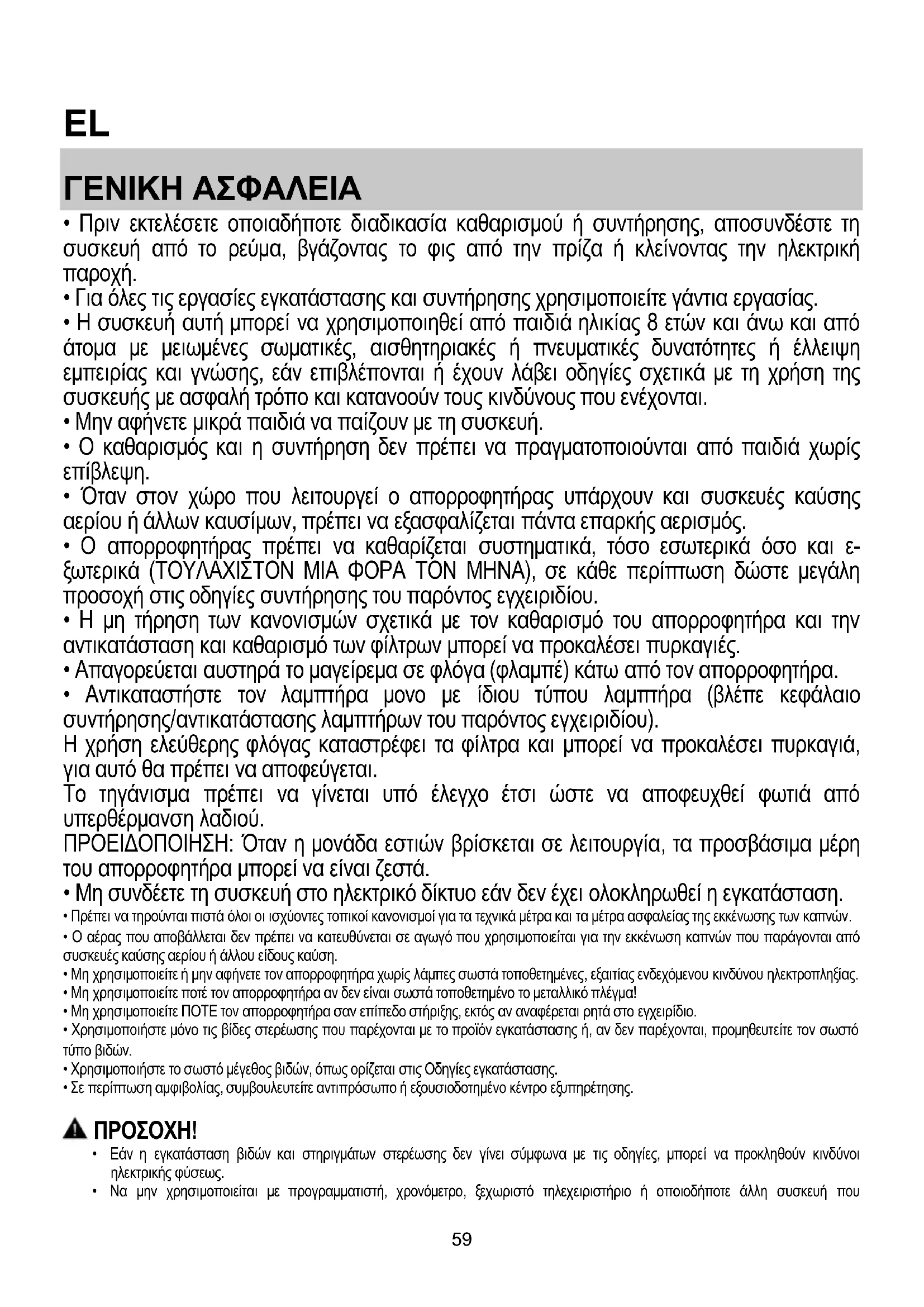 - Μη χρησιμοποιείτε ή μην αφήνετε τον απορροφητήρα χωρίς λάμπες σωστά τοποθετημένες, εξαιτίας ενδεχόμενου κινδύνου ηλεκτροπληξίας.