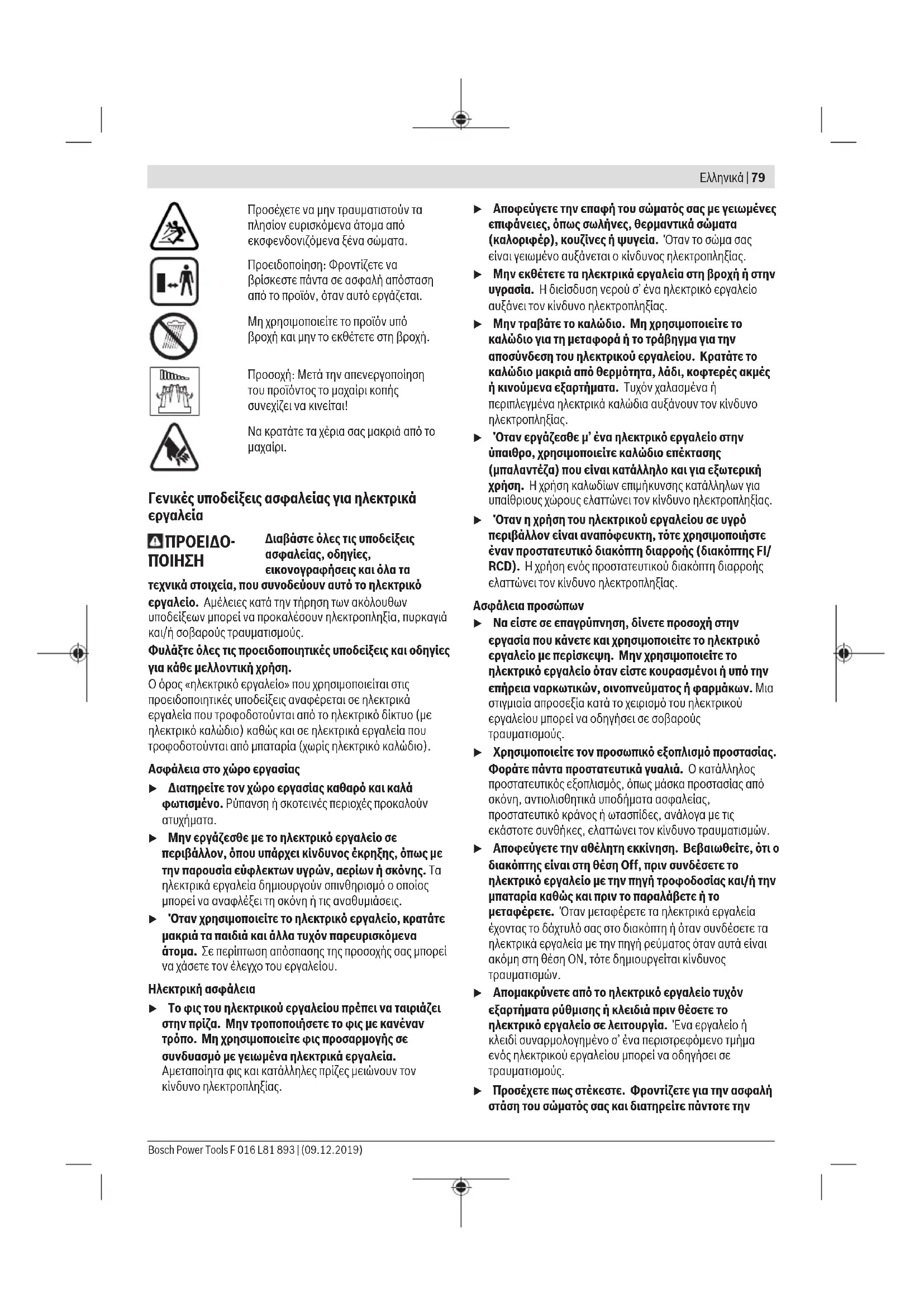 Υποδείξεις ασφαλείας Επεξήγηση των συμβόλων Διαβάστε τις οδηγίες χειρισμού. F 016 L81 893 | (09.12.2019) Bosch Power ToolsΕλληνικά | 79 Προσέχετε να μην τραυματιστούν τα πλησίον ευρισκόμενα άτομα από εκσφενδονιζόμενα ξένα σώματα. Προειδοποίηση: Φροντίζετε να βρίσκεστε πάντα σε ασφαλή απόσταση από το προϊόν, όταν αυτό εργάζεται. Μη χρησιμοποιείτε το προϊόν υπό βροχή και μην το εκθέτετε στη βροχή. Προσοχή: Μετά την απενεργοποίηση του προϊόντος το μαχαίρι κοπής συνεχίζει να κινείται! Να κρατάτε τα χέρια σας μακριά από το