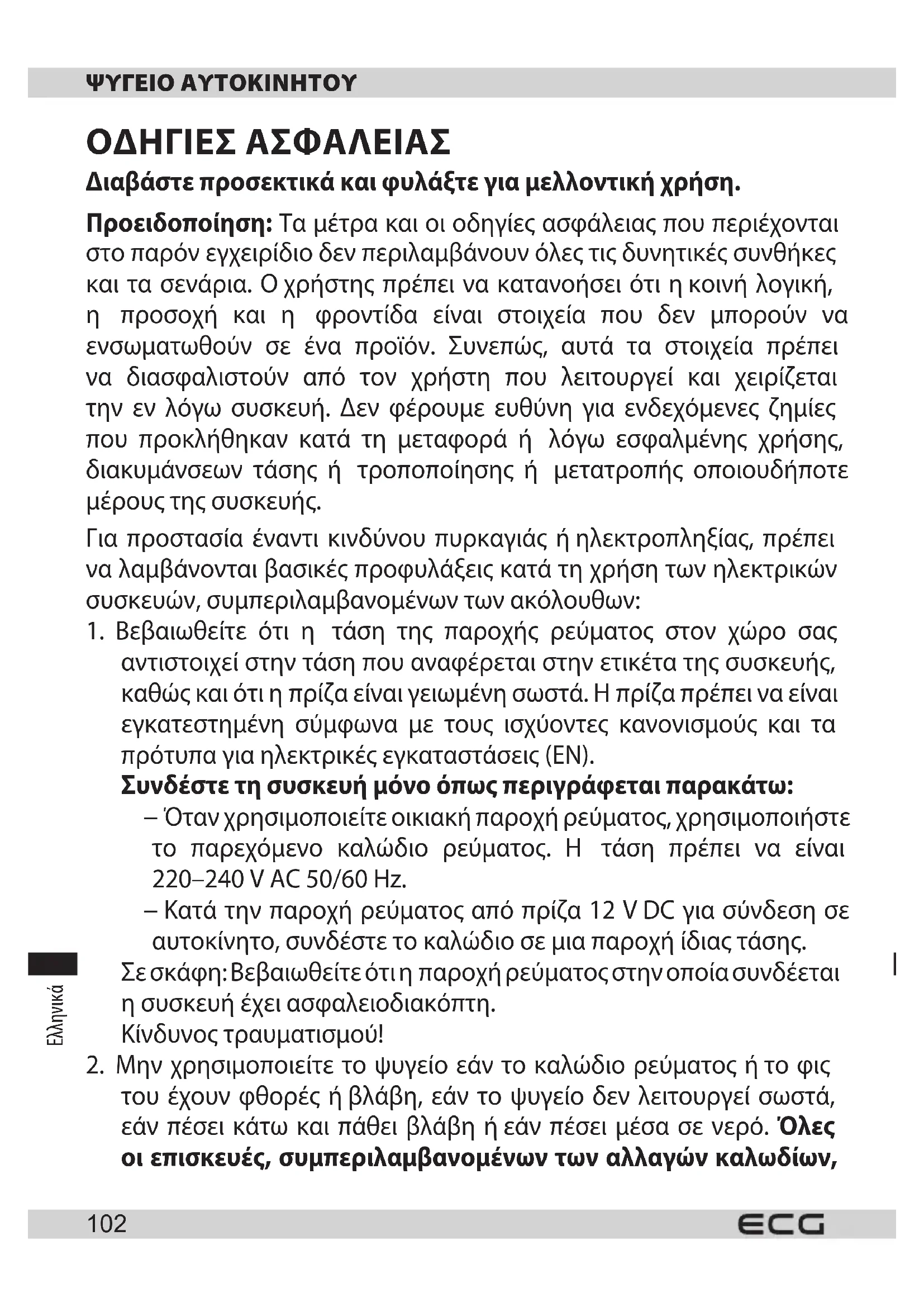 ΨΥΓΕΙΟ ΑΥΤΟΚΙΝΗΤΟΥ ΟΔΗΓΙΕΣ ΑΣΦΑΛΕΙΑΣ Διαβάστε προσεκτικά και φυλάξτε για μελλοντική χρήση. Προειδοποίηση: Τα μέτρα και οι οδηγίες ασφάλειας που περιέχονται στο παρόν εγχειρίδιο δεν περιλαμβάνουν όλες τις δυνητικές συνθήκες και τα σενάρια. Οχρήστης πρέπει να κατανοήσει ότι ηκοινή λογική, η προσοχή και η φροντίδα είναι στοιχεία που δεν μπορούν να ενσωματωθούν σε ένα προϊόν. Συνεπώς, αυτά τα στοιχεία πρέπει να διασφαλιστούν από τον χρήστη που λειτουργεί και χειρίζεται την εν λόγω συσκευή. Δεν φέρουμε ευθύνη για ενδεχόμενες ζημίες που προκλήθηκαν κατά τη μεταφορά ή λόγω εσφαλμένης χρήσης, διακυμάνσεων τάσης ή τροποποίησης ή μετατροπής οποιουδήποτε μέρους της συσκευής. Για προστασία έναντι κινδύνου πυρκαγιάς ήηλεκτροπληξίας, πρέπει να λαμβάνονται βασικές προφυλάξεις κατά τη χρήση των ηλεκτρικών συσκευών, συμπεριλαμβανομένων των ακόλουθων: