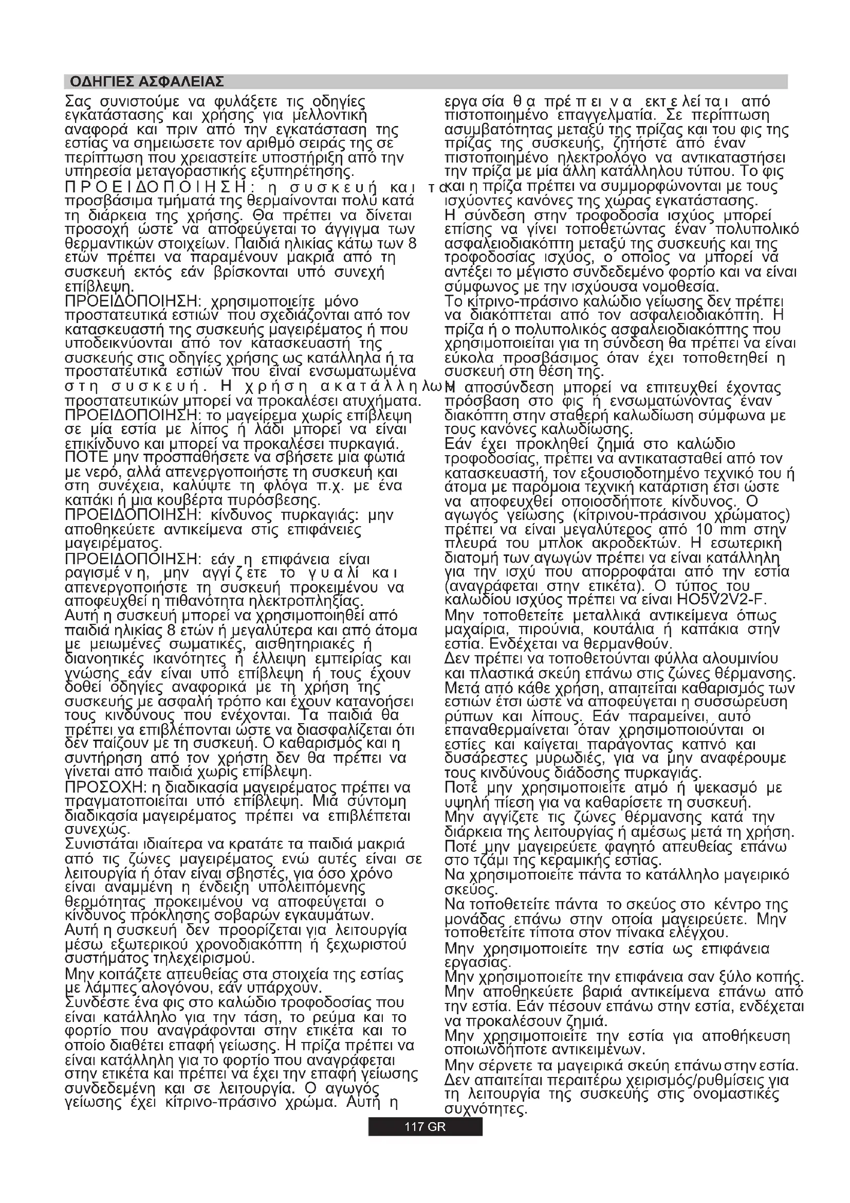 Συνιστάται ιδιαίτερα να κρατάτε τα παιδιά μακριά από τις ζώνες μαγειρέματος ενώ αυτές είναι σε λειτουργία ή όταν είναι σβηστές, για όσο χρόνο είναι αναμμένη η ένδειξη υπολειπόμενης θερμότητας προκειμένου να αποφεύγεται ο κίνδυνος πρόκλησης σοβαρών εγκαυμάτων. Σας συνιστούμε να φυλάξετε τις οδηγίες εγκατάστασης και χρήσης για μελλοντική αναφορά και πριν από την εγκατάσταση της εστίας να σημειώσετε τον αριθμό σειράς της σε περίπτωση που χρειαστείτε υποστήριξη από την υπηρεσία μεταγοραστικής εξυπηρέτησης. ΠΡΟΕΙΔΟΠΟΙΗΣΗ: χρησιμοποιείτε μόνο προστατευτικά εστιών που σχεδιάζονται από τον κατασκευαστή της συσκευής μαγειρέματος ή που υποδεικνύονται από τον κατασκευαστή της συσκευής στις οδηγίες χρήσης ως κατάλληλα ή τα προστατευτικά εστιών που είναι ενσωματωμένα σ τ η σ υ σ κ ε υ ή . Η χ ρ ή σ η α κ α τ ά λ λ η λω ν προστατευτικών μπορεί να προκαλέσει ατυχήματα. Μην κοιτάζετε απευθείας στα στοιχεία της εστίας με λάμπες αλογόνου, εάν υπάρχουν. ΠΡΟΕΙΔΟΠΟΙΗΣΗ: το μαγείρεμα χωρίς επίβλεψη σε μία εστία με λίπος ή λάδι μπορεί να είναι επικίνδυνο και μπορεί να προκαλέσει πυρκαγιά. ΠΟΤΕ μην προσπαθήσετε να σβήσετε μια φωτιά με νερό, αλλά απενεργοποιήστε τη συσκευή και στη συνέχεια, καλύψτε τη φλόγα π.χ. με ένα καπάκι ή μια κουβέρτα πυρόσβεσης. ΠΡΟΕΙΔΟΠΟΙΗΣΗ: κίνδυνος πυρκαγιάς: μην αποθηκεύετε αντικείμενα στις επιφάνειες μαγειρέματος. ΠΡΟΕΙΔΟΠΟΙΗΣΗ: εάν η επιφάνεια είναι ραγισμέ ν η, μην αγγί ζ ετε το γ υ α λί κα ι απενεργοποιήστε τη συσκευή προκειμένου να αποφευχθεί η πιθανότητα ηλεκτροπληξίας. Αυτή η συσκευή μπορεί να χρησιμοποιηθεί από παιδιά ηλικίας 8 ετών ή μεγαλύτερα και από άτομα με μειωμένες σωματικές, αισθητηριακές ή διανοητικές ικανότητες ή έλλειψη εμπειρίας και γνώσης εάν είναι υπό επίβλεψη ή τους έχουν δοθεί οδηγίες αναφορικά με τη χρήση της συσκευής με ασφαλή τρόπο και έχουν κατανοήσει τους κινδύνους που ενέχονται. Τα παιδιά θα πρέπει να επιβλέπονται ώστε να διασφαλίζεται ότι δεν παίζουν με τη συσκευή. Ο καθαρισμός και η συντήρηση από τον χρήστη δεν θα πρέπει να γίνεται από παιδιά χωρίς επίβλεψη. Αυτή η συσκευή δεν προορίζεται για λειτουργία μέσω εξωτερικού χρονοδιακόπτη ή ξεχωριστού συστήματος τηλεχειρισμού. Συνδέστε ένα φις στο καλώδιο τροφοδοσίας που είναι κατάλληλο για την τάση, το ρεύμα και το φορτίο που αναγράφονται στην ετικέτα και το οποίο διαθέτει επαφή γείωσης. Η πρίζα πρέπει να είναι κατάλληλη για το φορτίο που αναγράφεται στην ετικέτα και πρέπει να έχει την επαφή γείωσης συνδεδεμένη και σε λειτουργία. Ο αγωγός γείωσης έχει κίτρινο-πράσινο χρώμα. Αυτή η ΟΔΗΓΙΕΣ ΑΣΦΑΛΕΙΑΣ Μην τοποθετείτε μεταλλικά αντικείμενα όπως μαχαίρια, πιρούνια, κουτάλια ή καπάκια στην εστία. Ενδέχεται να θερμανθούν. Μετά από κάθε χρήση, απαιτείται καθαρισμός των εστιών έτσι ώστε να αποφεύγεται η συσσώρευση ρύπων και λίπους. Εάν παραμείνει, αυτό επαναθερμαίνεται όταν χρησιμοποιούνται οι εστίες και καίγεται παράγοντας καπνό και δυσάρεστες μυρωδιές, για να μην αναφέρουμε τους κινδύνους διάδοσης πυρκαγιάς. Μην αγγίζετε τις ζώνες θέρμανσης κατά την διάρκεια της λειτουργίας ή αμέσως μετά τη χρήση. Μην χρησιμοποιείτε την εστία ως επιφάνεια