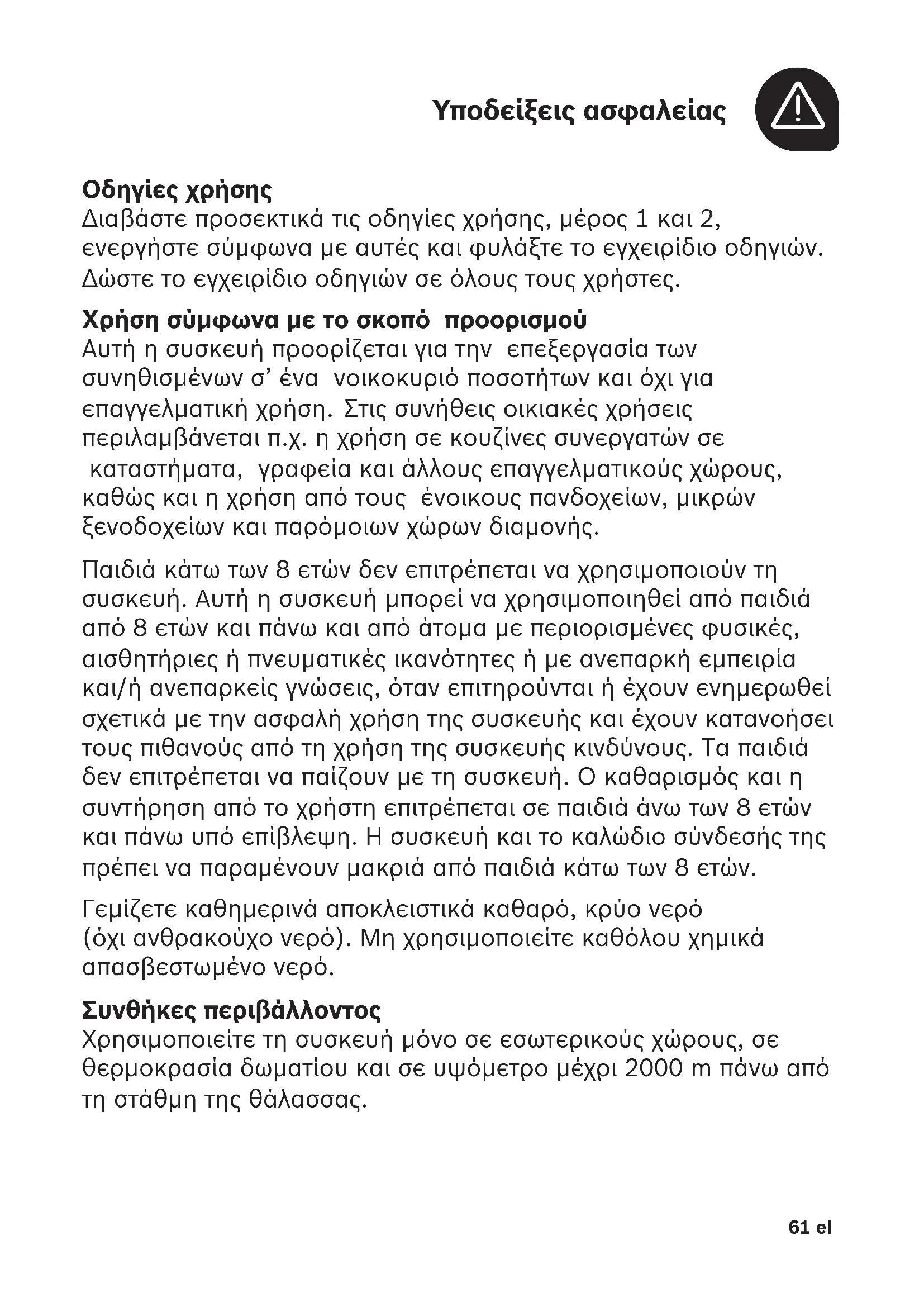 Οδηγίες χρήσης Διαβάστε προσεκτικά τις οδηγίες χρήσης, μέρος 1 και 2, ενεργήστε σύμφωνα με αυτές και φυλάξτε το εγχειρίδιο οδηγιών. Δώστε το εγχειρίδιο οδηγιών σε όλους τους χρήστες. Χρήση σύμφωνα με το σκοπό προορισμού Αυτή η συσκευή προορίζεται για την επεξεργασία των συνηθισμένων σ’ ένα νοικοκυριό ποσοτήτων και όχι για επαγγελματική χρήση. Στις συνήθεις οικιακές χρήσεις περιλαμβάνεται π.χ. η χρήση σε κουζίνες συνεργατών σε καταστήματα, γραφεία και άλλους επαγγελματικούς χώρους, καθώς και η χρήση από τους ένοικους πανδοχείων, μικρών ξενοδοχείων και παρόμοιων χώρων διαμονής. Παιδιά κάτω των 8 ετών δεν επιτρέπεται να χρησιμοποιούν τη συσκευή. Αυτή η συσκευή μπορεί να χρησιμοποιηθεί από παιδιά από 8 ετών και πάνω και από άτομα με περιορισμένες φυσικές, αισθητήριες ή πνευματικές ικανότητες ή με ανεπαρκή εμπειρία και/ή ανεπαρκείς γνώσεις, όταν επιτηρούνται ή έχουν ενημερωθεί σχετικά με την ασφαλή χρήση της συσκευής και έχουν κατανοήσει τους πιθανούς από τη χρήση της συσκευής κινδύνους. Τα παιδιά δεν επιτρέπεται να παίζουν με τη συσκευή. Ο καθαρισμός και η συντήρηση από το χρήστη επιτρέπεται σε παιδιά άνω των 8 ετών και πάνω υπό επίβλεψη. Η συσκευή και το καλώδιο σύνδεσής της πρέπει να παραμένουν μακριά από παιδιά κάτω των 8 ετών. Γεμίζετε καθημερινά αποκλειστικά καθαρό, κρύο νερό (όχιανθρακούχο νερό). Μη χρησιμοποιείτε καθόλου χημικά απασβεστωμένο νερό. Συνθήκες περιβάλλοντος Χρησιμοποιείτε τη συσκευή μόνο σε εσωτερικούς χώρους, σε θερμοκρασία δωματίου και σε υψόμετρο μέχρι 2000m πάνω από τη στάθμη της θάλασσας.62el Υποδείξεις ασφαλείας