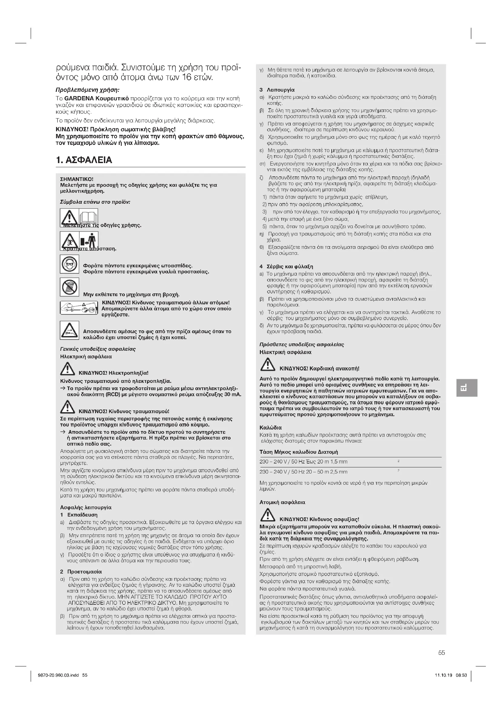 ρούμενα παιδιά. Συνιστούμε τη χρήση του προϊ- όντος μόνο από άτομα άνω των 16 ετών. Προβλεπόμενη χρήση: Το GARDENA Κουρευτικό προορίζεται για το κούρεμα και την κοπή γκαζόν και επιφανειών γρασιδιού σε ιδιωτικές κατοικίες και ερασιτεχνι- κούς κήπους. Το προϊόν δεν ενδείκνυται για λειτουργία μεγάλης διάρκειας. ΚΙΝΔΥΝΟΣ! Πρόκληση σωματικής βλάβης! Μη χρησιμοποιείτε το προϊόν για την κοπή φρακτών από θάμνους, τον τεμαχισμό υλικών ή για λίπασμα. 9870-20.960.03.indd 55 11.10.19 08:53EL