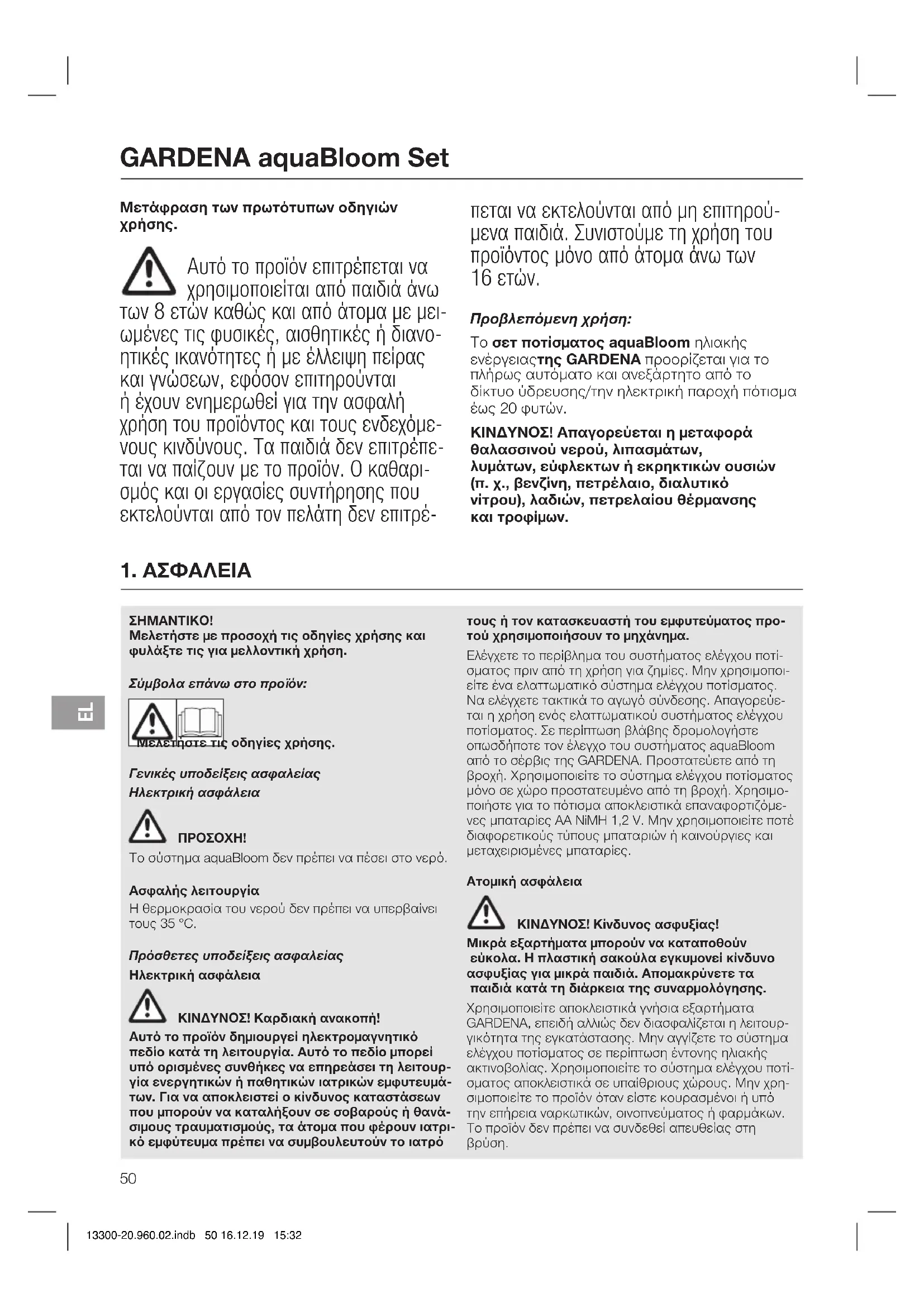 Το σύστημα aquaBloom δεν πρέπει να πέσει στο νερό. Ασφαλής λειτουργία Η θερμοκρασία του νερού δεν πρέπει να υπερβαίνει τους 35 °C. Πρόσθετες υποδείξεις ασφαλείας Ηλεκτρική ασφάλεια ΚΙΝΔΥΝΟΣ! Καρδιακή ανακοπή! Αυτό το προϊόν δημιουργεί ηλεκτρομαγνητικό πεδίο κατά τη λειτουργία. Αυτό το πεδίο μπορεί υπό ορισμένες συνθήκες να επηρεάσει τη λειτουρ- γία ενεργητικών ή παθητικών ιατρικών εμφυτευμά- των. Για να αποκλειστεί ο κίνδυνος καταστάσεων που μπορούν να καταλήξουν σε σοβαρούς ή θανά- σιμους τραυματισμούς, τα άτομα που φέρουν ιατρι- κό εμφύτευμα πρέπει να συμβουλευτούν το ιατρό τους ή τον κατασκευαστή του εμφυτεύματος προ- τού χρησιμοποιήσουν το μηχάνημα. Ελέγχετε το περίβλημα του συστήματος ελέγχου ποτί- σματος πριν από τη χρήση για ζημίες. Μην χρησιμοποι- είτε ένα ελαττωματικό σύστημα ελέγχου ποτίσματος. Να ελέγχετε τακτικά το αγωγό σύνδεσης. Απαγορεύε- ται η χρήση ενός ελαττωματικού συστήματος ελέγχου ποτίσματος. Σε περίπτωση βλάβης δρομολογήστε οπωσδήποτε τον έλεγχο του συστήματος aquaBloom από το σέρβις της GARDENA. Προστατεύετε από τη βροχή. Χρησιμοποιείτε το σύστημα ελέγχου ποτίσματος μόνο σε χώρο προστατευμένο από τη βροχή. Χρησιμο- ποιήστε για το πότισμα αποκλειστικά επαναφορτιζόμε- νες μπαταρίες AA NiMH 1,2 V. Μην χρησιμοποιείτε ποτέ διαφορετικούς τύπους μπαταριών ή καινούργιες και μεταχειρισμένες μπαταρίες. Ατομική ασφάλεια ΚΙΝΔΥΝΟΣ! Κίνδυνος ασφυξίας! Μικρά εξαρτήματα μπορούν να καταποθούν εύκολα. Η πλαστική σακούλα εγκυμονεί κίνδυνο ασφυξίας για μικρά παιδιά. Απομακρύνετε τα παιδιά κατά τη διάρκεια της συναρμολόγησης. Χρησιμοποιείτε αποκλειστικά γνήσια εξαρτήματα GARDENA, επειδή αλλιώς δεν διασφαλίζεται η λειτουρ- γικότητα της εγκατάστασης. Μην αγγίζετε το σύστημα ελέγχου ποτίσματος σε περίπτωση έντονης ηλιακής ακτινοβολίας. Χρησιμοποιείτε το σύστημα ελέγχου ποτί- σματος αποκλειστικά σε υπαίθριους χώρους. Μην χρη- σιμοποιείτε το προϊόν όταν είστε κουρασμένοιή υπό την επήρεια ναρκωτικών, οινοπνεύματος ή φαρμάκων. Το προϊόν δεν πρέπει να συνδεθεί απευθείας στη