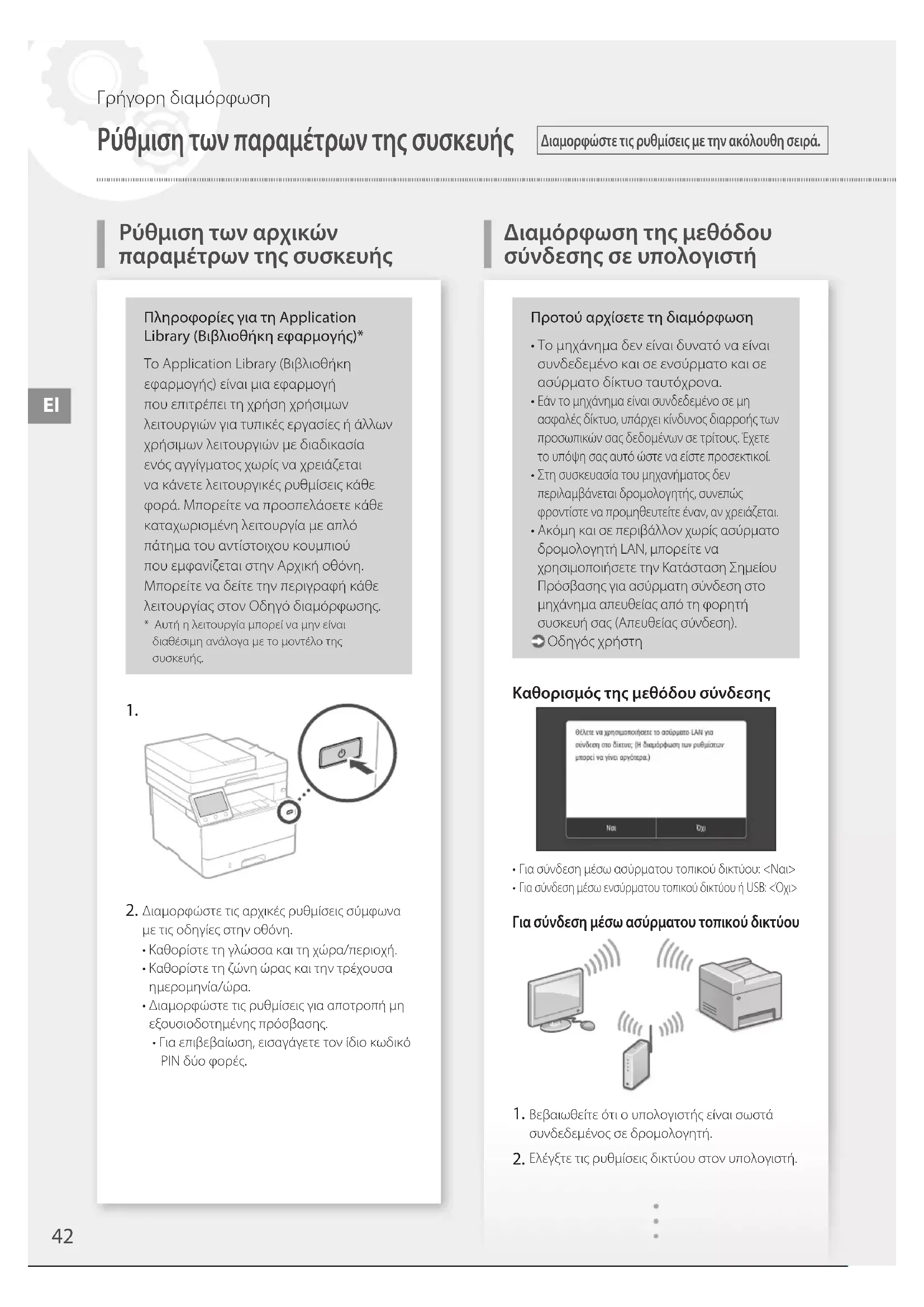 Διαμορφώστε τις αρχικές ρυθμίσεις σύμφωνα με τις οδηγίες στην οθόνη.• Καθορίστε τη γλώσσα και τη χώρα/περιοχή.• Καθορίστε τη ζώνη ώρας και την τρέχουσα ημερομηνία/ώρα.• Διαμορφώστε τις ρυθμίσεις για αποτροπή μη εξουσιοδοτημένης πρόσβασης.• Για επιβεβαίωση, εισαγάγετε τον ίδιο κωδικό ΡΙΝ δύο φορές.Προτού αρχίσετε τη διαμόρφωση• Το μηχάνημα δεν είναι δυνατό να είναι συνδεδεμένο και σε ενσύρματο και σε ασύρματο δίκτυο ταυτόχρονα. Εάν το μηχάνημα είναι συνδεδεμένο σε μη ασφαλές δίκτυο, υπάρχει κίνδυνος διαρροής των προσωπικών σας δεδομένων σε τρίτους. Έχετε το υπόψη σας αυτό ώστε να είστε προσεκτικοί. Στη συσκευασία του μηχανήματος δεν περιλαμβάνεται δρομολογητής, συνεπώς φροντίστε να προμηθευτείτε έναν, αν χρειάζεται. Ακόμη και σε περιβάλλον χωρίς ασύρματο δρομολογητή LAN, μπορείτε να χρησιμοποιήσετε την Κατάσταση Σημείου Πρόσβασης για ασύρματη σύνδεση στο μηχάνημα απευθείας από τη φορητή συσκευή σας (Απευθείας σύνδεση). Οδηγός χρήστηΚαθορισμός της μεθόδου σύνδεσης Για σύνδεση μέσω ασύρματου τοπικού δικτύου: <Ναι> Για σύνδεση μέσω ενσύρματου τοπικού δικτύου ή USB: <Όχι>Για σύνδεση μέσω ασύρματου τοπικού δικτύου Βεβαιωθείτε ότι ο υπολογιστής είναι σωστά συνδεδεμένος σε δρομολογητή. Ελέγξτε τις ρυθμίσεις δικτύου στον υπολογιστή.