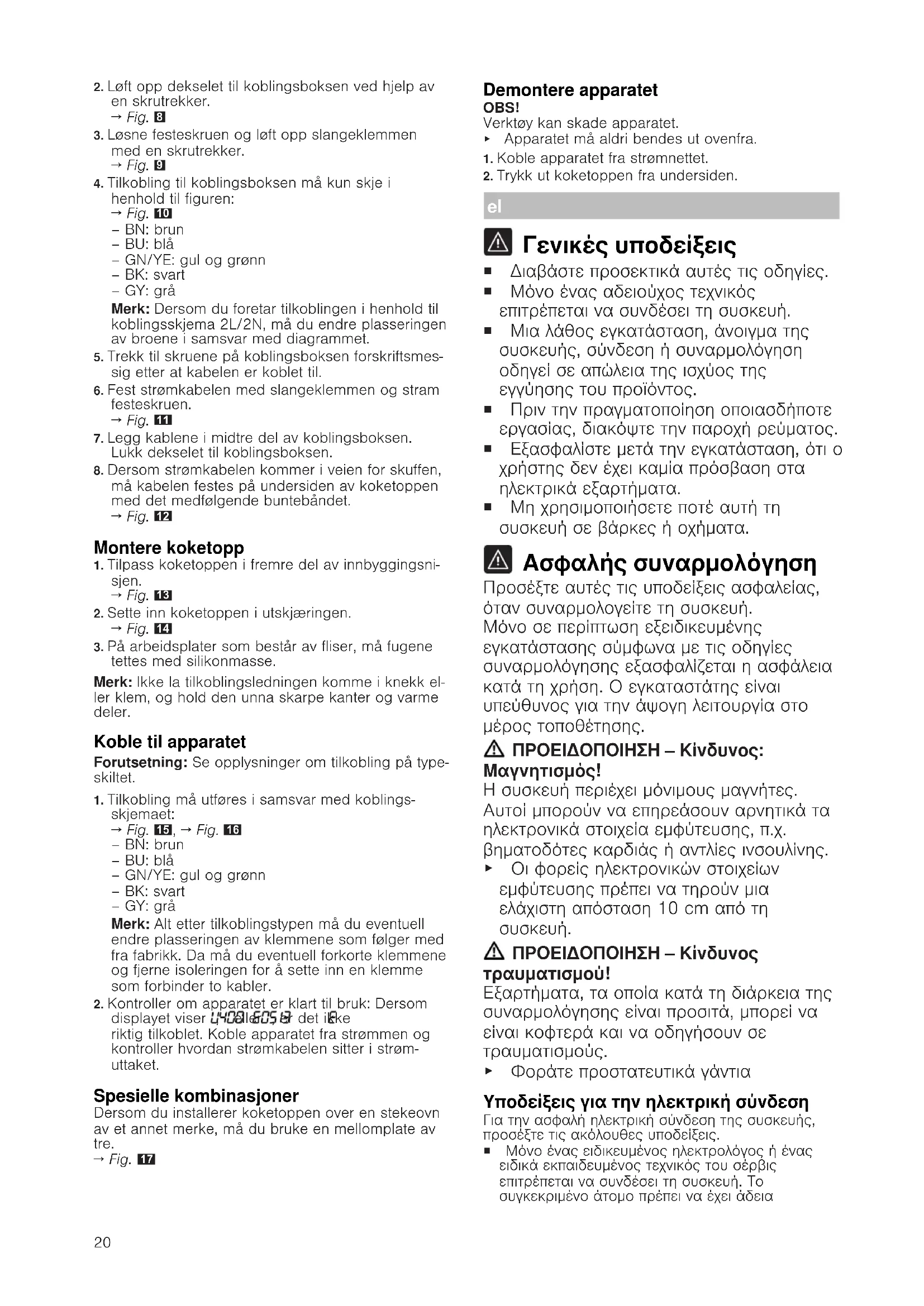 Γενικές υποδείξεις ¡ Διαβάστε προσεκτικά αυτές τις οδηγίες. ¡ Μόνο ένας αδειούχος τεχνικός επιτρέπεται να συνδέσει τη συσκευή. ¡ Μια λάθος εγκατάσταση, άνοιγμα της συσκευής, σύνδεση ή συναρμολόγηση οδηγεί σε απώλεια της ισχύος της εγγύησης του προϊόντος. ¡ Πριν την πραγματοποίηση οποιασδήποτε εργασίας, διακόψτε την παροχή ρεύματος. ¡ Εξασφαλίστε μετά την εγκατάσταση, ότι ο χρήστης δεν έχει καμία πρόσβαση στα ηλεκτρικά εξαρτήματα. ¡ Μη χρησιμοποιήσετε ποτέ αυτή τη συσκευή σε βάρκες ή οχήματα. Ασφαλής συναρμολόγηση Προσέξτε αυτές τις υποδείξεις ασφαλείας, όταν συναρμολογείτε τη συσκευή. Μόνο σε περίπτωση εξειδικευμένης εγκατάστασης σύμφωνα με τις οδηγίες συναρμολόγησης εξασφαλίζεται η ασφάλεια κατά τη χρήση. Ο εγκαταστάτης είναι υπεύθυνος για την άψογη λειτουργία στο μέρος τοποθέτησης. ΠΡΟΕΙΔΟΠΟΙΗΣΗ‒Κίνδυνος: Μαγνητισμός! Η συσκευή περιέχει μόνιμους μαγνήτες. Αυτοί μπορούν να επηρεάσουν αρνητικά τα ηλεκτρονικά στοιχεία εμφύτευσης, π.χ. βηματοδότες καρδιάς ή αντλίες ινσουλίνης. ▶ Οι φορείς ηλεκτρονικών στοιχείων εμφύτευσης πρέπει να τηρούν μια ελάχιστη απόσταση 10 cm από τη