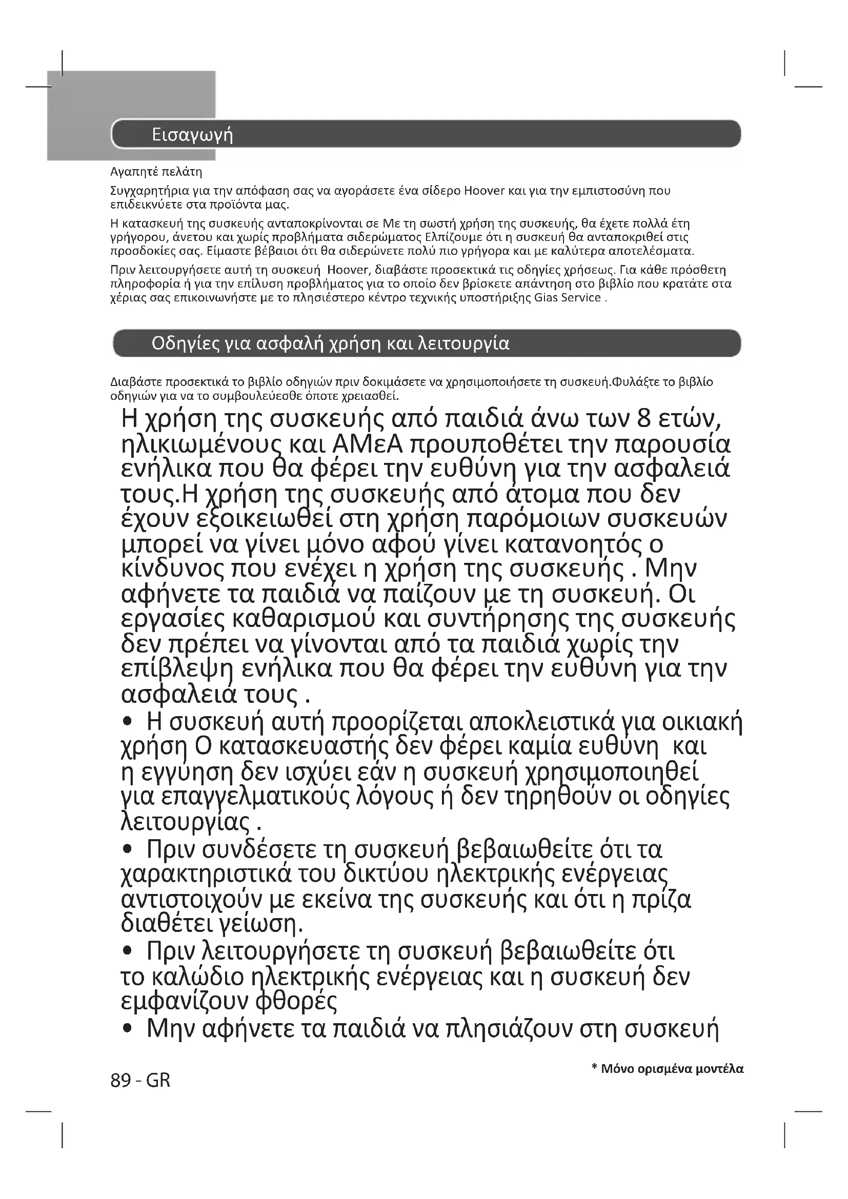 Αγαπητέ πελάτη Συγχαρητήρια για την απόφαση σας να αγοράσετε ένα σίδερο Hoover και για την εμπιστοσύνη που επιδεικνύετε στα προϊόντα μας. H κατασκευή της συσκευής ανταποκρίνονται σε Με τη σωστή χρήση της συσκευής, θα έχετε πολλά έτη γρήγορου, άνετου και χωρίς προβλήματα σιδερώματος Ελπίζουμε ότι η συσκευή θα ανταποκριθεί στις προσδοκίες σας. Είμαστε βέβαιοι ότι θα σιδερώνετε πολύ πιο γρήγορα και με καλύτερα αποτελέσματα. Πριν λειτουργήσετε αυτή τη συσκευή Hoover, διαβάστε προσεκτικά τις οδηγίες χρήσεως. Για κάθε πρόσθετη πληροφορία ή για την επίλυση προβλήματος για το οποίο δεν βρίσκετε απάντηση στο βιβλίο που κρατάτε στα χέριας σας επικοινωνήστε με το πλησιέστερο κέντρο τεχνικής υποστήριξης Gias Service . Οδηγίες για ασφαλή χρήση και λειτουργία Διαβάστε προσεκτικά το βιβλίο οδηγιών πριν δοκιμάσετε να χρησιμοποιήσετε τη συσκευή.Φυλάξτε το βιβλίο οδηγιών για να το συμβουλεύεσθε όποτε χρειασθεί. Η χρήση της συσκευής από παιδιά άνω των 8 ετών, ηλικιωμένους και ΑΜεΑ προυποθέτει την παρουσία ενήλικα που θα φέρει την ευθύνη για την ασφαλειά τους.Η χρήση της συσκευής από άτομα που δεν έχουν εξοικειωθεί στη χρήση παρόμοιων συσκευών μπορεί να γίνει μόνο αφού γίνει κατανοητός ο κίνδυνος που ενέχει η χρήση της συσκευής . Μην αφήνετε τα παιδιά να παίζουν με τη συσκευή. Οι εργασίες καθαρισμού και συντήρησης της συσκευής δεν πρέπει να γίνονται από τα παιδιά χωρίς την επίβλεψη ενήλικα που θα φέρει την ευθύνη για την ασφαλειά τους .