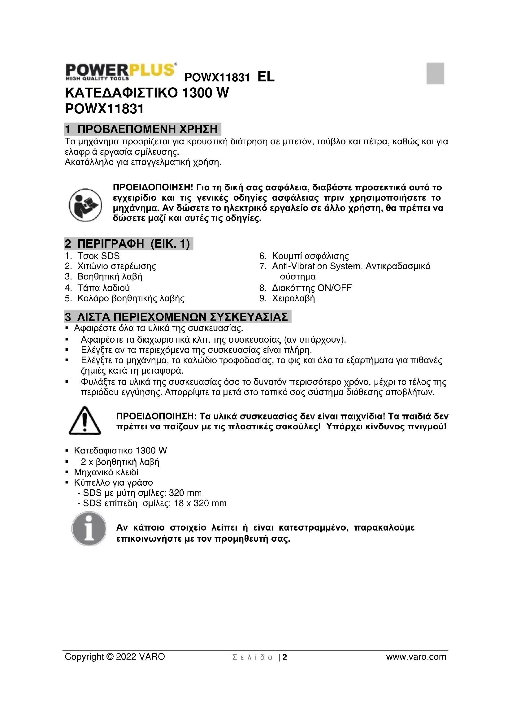 - 16 ΔΗΛΩΣΗ ΣΥΜΜΟΡΦΩΣΗΣ POWX11831 EL Copyright © 2022 VARO Σ ε λ ί δ α | 2 www.varo.com ΚΑΤΕΔΑΦΙΣΤΙΚΟ 1300 W POWX11831 1 ΠΡΟΒΛΕΠΟΜΕΝΗ ΧΡΗΣΗ Το μηχάνημα προορίζεται για κρουστική διάτρηση σε μπετόν, τούβλο και πέτρα, καθώς και για ελαφριά εργασία σμίλευσης. Ακατάλληλο για επαγγελματική χρήση. ΠΡΟΕΙΔΟΠΟΙΗΣΗ! Για τη δική σας ασφάλεια, διαβάστε προσεκτικά αυτό το εγχειρίδιο και τις γενικές οδηγίες ασφάλειας πριν χρησιμοποιήσετε το μηχάνημα. Αν δώσετε το ηλεκτρικό εργαλείο σε άλλο χρήστη, θα πρέπει να δώσετε μαζί και αυτές τις οδηγίες. 2 ΠΕΡΙΓΡΑΦΗ (ΕΙΚ. 1) p. 10