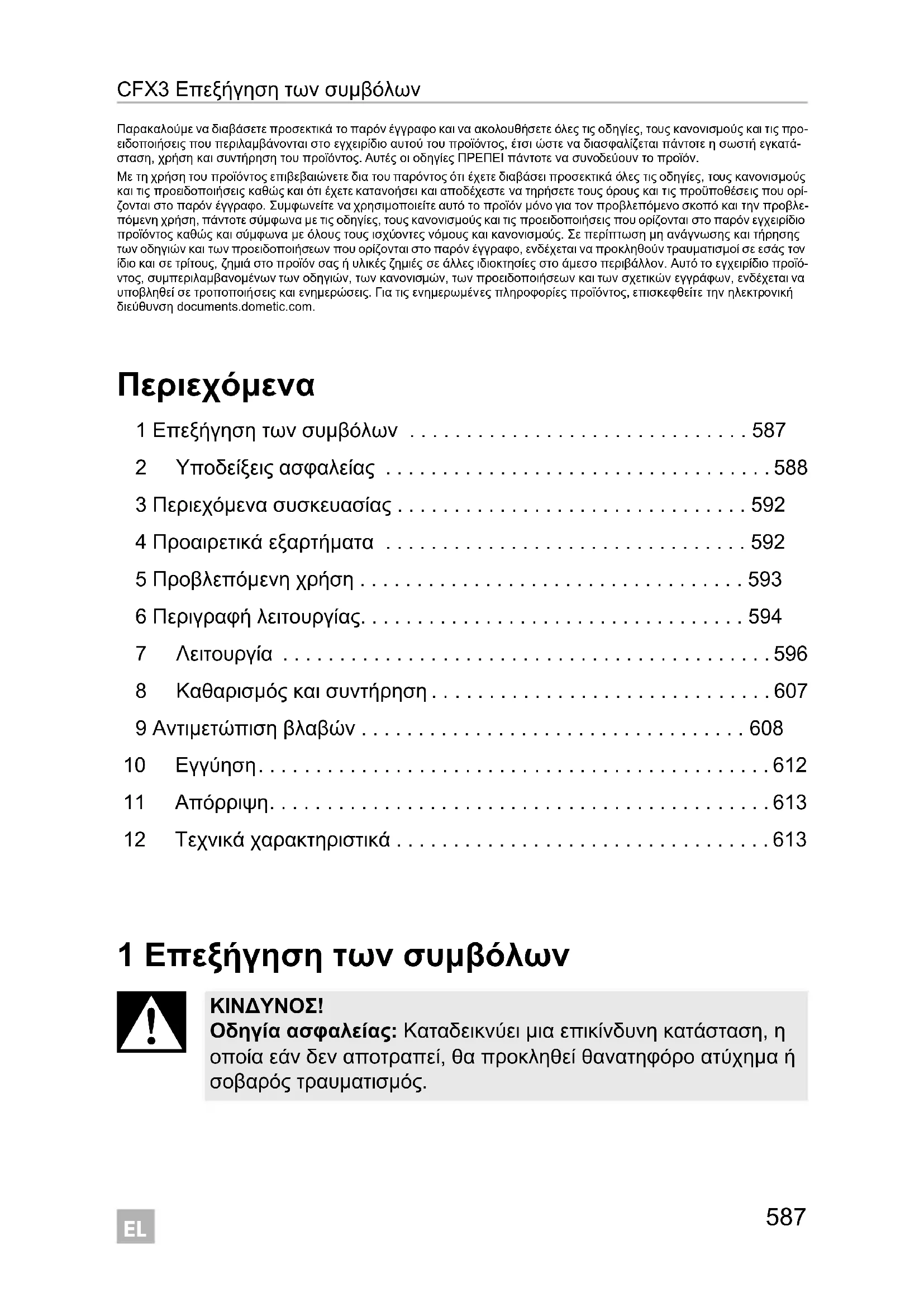 - Παρακαλούμε να διαβάσετε προσεκτικά το παρόν έγγραφο και να ακολουθήσετε όλες τις οδηγίες, τους κανονισμούς και τις προ- ειδοποιήσεις που περιλαμβάνονται στο εγχειρίδιο αυτού του προϊόντος, έτσι ώστε να διασφαλίζεται πάντοτε η σωστή εγκατά- σταση, χρήση και συντήρηση του προϊόντος. Αυτές οι οδηγίες ΠΡΕΠΕΙ πάντοτε να συνοδεύουν το προϊόν. Με τη χρήση του προϊόντος επιβεβαιώνετε δια του παρόντος ότι έχετε διαβάσει προσεκτικά όλες τις οδηγίες, τους κανονισμούς και τις προειδοποιήσεις καθώς και ότι έχετε κατανοήσει και αποδέχεστε να τηρήσετε τους όρους και τις προϋποθέσεις που ορί- ζονται στο παρόν έγγραφο. Συμφωνείτε να χρησιμοποιείτε αυτό το προϊόν μόνο για τον προβλεπόμενο σκοπό και την προβλε- πόμενη χρήση, πάντοτε σύμφωνα με τις οδηγίες, τους κανονισμούς και τις προειδοποιήσεις που ορίζονται στο παρόν εγχειρίδιο προϊόντος καθώς και σύμφωνα με όλους τους ισχύοντες νόμους και κανονισμούς. Σε περίπτωση μη ανάγνωσης και τήρησης των οδηγιών και των προειδοποιήσεων που ορίζονται στο παρόν έγγραφο, ενδέχεται να προκληθούν τραυματισμοί σε εσάς τον ίδιο και σε τρίτους, ζημιά στο προϊόν σας ή υλικές ζημιές σε άλλες ιδιοκτησίες στο άμεσο περιβάλλον. Αυτό το εγχειρίδιο προϊό- ντος, συμπεριλαμβανομένων των οδηγιών, των κανονισμών, των προειδοποιήσεων και των σχετικών εγγράφων, ενδέχεται να υποβληθεί σε τροποποιήσεις και ενημερώσεις. Για τις ενημερωμένες πληροφορίες προϊόντος, επισκεφθείτε την ηλεκτρονική διεύθυνση documents.dometic.com. Περιεχόμενα 1 Επεξήγηση των συμβόλων p. 587