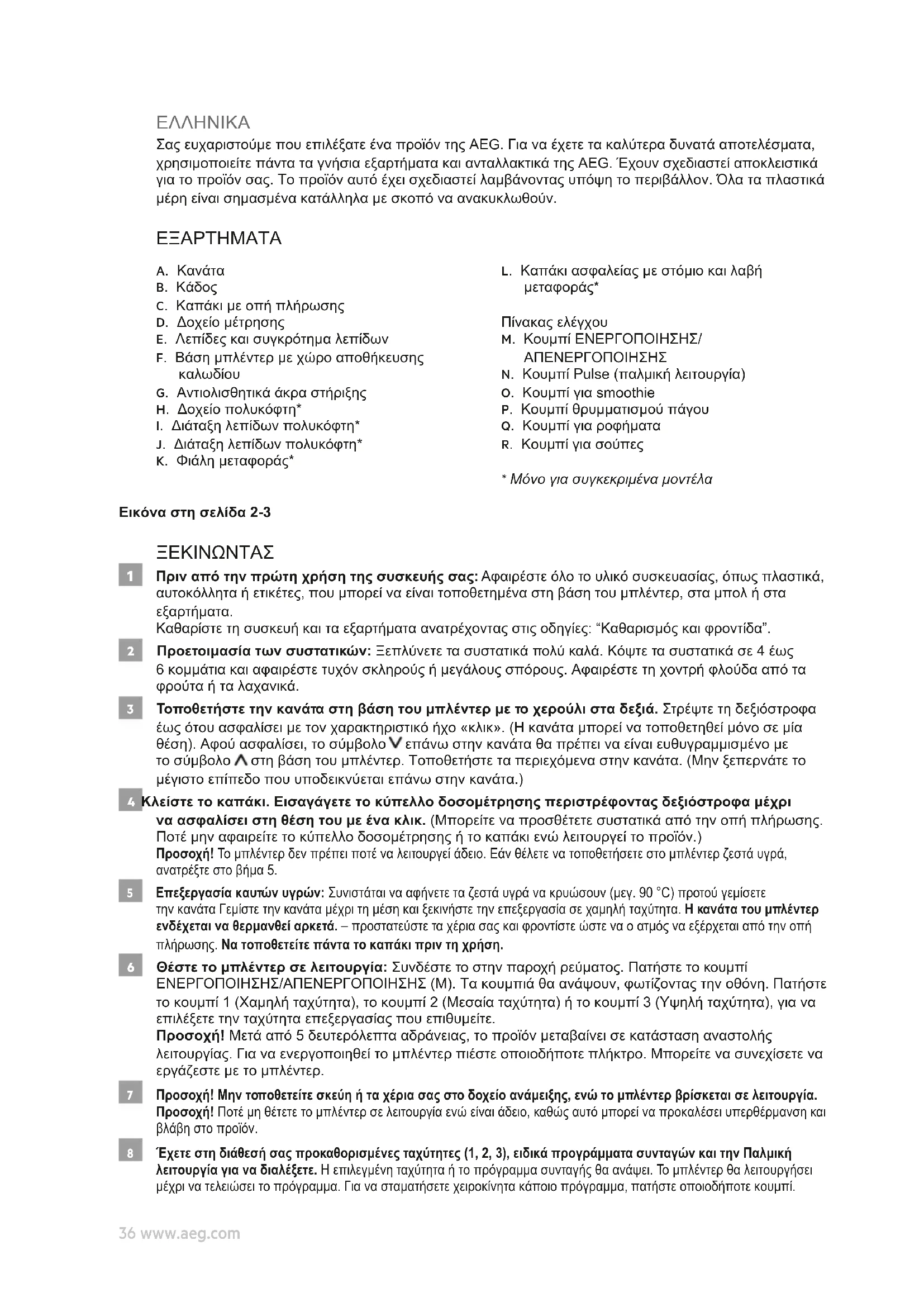 Προειδοποίηση! Μην βυθίζετε το περίβλημα, το φις ή το καλώδιο σε νερό ή σε οποιοδήποτε άλλο υγρό. 15 Πλήρης καθαρισμός της κανάτας: Σημείωση! Το συγκρότημα των λεπίδων δεν αφαιρείται. Άφαιρέστε το καπάκι και το δοχείο μέτρησης. Πλύνετε το συγκρότημα των λεπίδων με νερό και απορρυπαντικό και, στη συνέχεια, τοποθετήστε το δοχείο μέτρησης και την κανάτα στο πλυντήριο πιάτων για να καθαριστούν πλήρως. Προσοχή! Χειριστείτε τις λεπίδες με προσοχή καθώς είναι πολύ αιχμηρές! Όλα τα μέρη είναι κατάλληλα για πλυντήριο πιάτων, εκτός από τη βάση του μπλέντερ. Απολαύστε το καινούριο σας προϊόν της AEG! ΥΠΟΔΕΙΞΕΙΣ ΆΣΦΆΛΕΙΆΣ Διαβάστε προσεκτικά τις παρακάτω οδηγίες πριν χρησιμοποιήσετε για πρώτη φορά τη συσκευή.