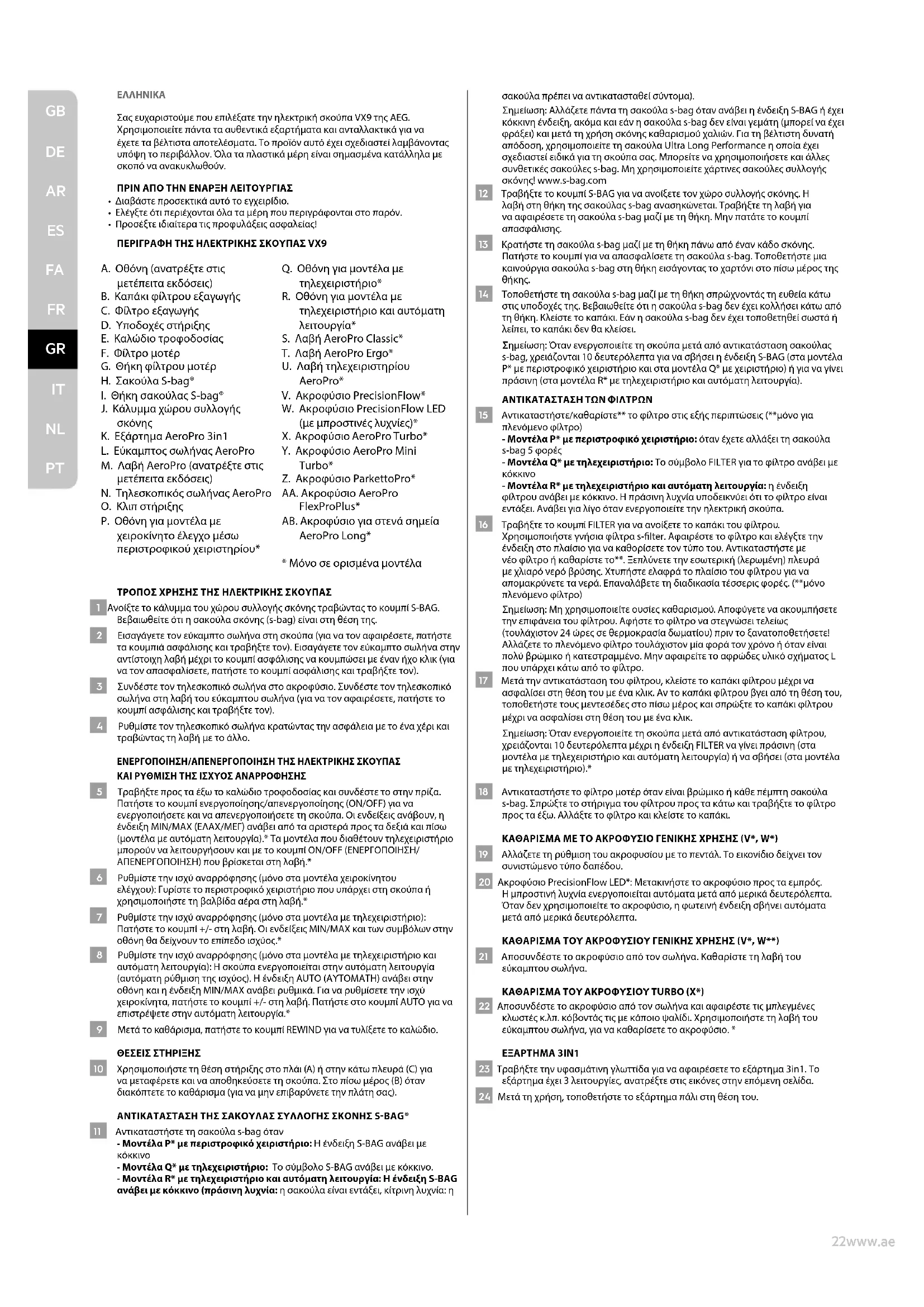 PT24www.aeg.com ΠΡΌΦΥΛΑΞΕΙΣ ΑΣΦΑΛΕΙΑΣ Η συσκευή μπορεί να χρησιμοποιηθεί από παιδιά ηλικίας 8 ετών και άνω ή από άτομα με μειωμένες σωματικές, αισθητηριακές ή διανοητικές ικανότητες ή με έλλειψη εμπειρίας και γνώσεων, εφόσον βρίσκονται υπό επιτήρηση ή έχουν λάβει οδηγίες για την ασφαλή χρήση της συσκευής και κατανοούν τους κινδύνους που συνεπάγεται. Τα παιδιά απαγορεύεται να παίζουν με τη συσκευή. Ο καθαρισμός και η συντήρηση δεν πρέπει να πραγματοποιούνται από παιδιά χωρίς επίβλεψη. ΠΡΟΕΙΔΟΠΟΙΗΣΗ: Τα ακροφύσια turbo* διαθέτουν μια περιστρεφόμενη βούρτσα στην οποία μπορεί να εγκλωβιστούν αντικείμενα. Να τα χρησιμοποιείτε με προσοχή και μόνο στις επιφάνειες για τις οποίες προορίζονται. Απενεργοποιήστε την ηλεκτρική σκούπα πριν αφαιρέσετε τα εγκλωβισμένα αντικείμενα ή πριν καθαρίσετε τη βούρτσα. Πρέπει να αφαιρείτε τις μπαταρίες από το τηλεχειριστήριο στη λαβή* / το φωτιζόμενο ακροφύσιο με τις ενδείξεις LED* πριν από την απόρριψη του προϊόντος**. *Μόνο σε ορισμένα μοντέλα. **Πληροφορίες σχετικά με την αφαίρεση της μπαταρίας στην ενότητα 25 και 26 του πτυσσόμενου ένθετου. Αποσυνδέετε πάντα το φις από την πρίζα πριν από τον καθαρισμό ή τη συντήρηση της συσκευής ή κατά την αφαίρεση της μπαταρίας. Η μπαταρία πρέπει να απορριφθεί με ασφάλεια. Εάν το καλώδιο έχει καταστραφεί, θα πρέπει να αντικατασταθεί μόνο από εξουσιοδοτημένο κέντρο υποστήριξης της AEG, για την αποφυγή πιθανών κινδύνων. Η VX9 θα πρέπει να χρησιμοποιείται μόνο για τη συνήθη διαδικασία σκουπίσματος με αναρρόφηση σε οικιακό περιβάλλον. Βεβαιωθείτε ότι η ηλεκτρική σκούπα φυλάσσεται σε στεγνό μέρος. Όλες οι εργασίες σέρβις ή επισκευής πρέπει να εκτελούνται από εξουσιοδοτημένο κέντρο σέρβις της AEG. Τα παιδιά δεν πρέπει να έχουν πρόσβαση στα υλικά συσκευασίας, όπως οι πλαστικές σακούλες, για να αποφεύγεται ο κίνδυνος ασφυξίας. Μη χρησιμοποιείτε ποτέ την ηλεκτρική σκούπα: Σε υγρούς χώρους. Κοντά σε εύφλεκτα αέρια κ.λπ. Εάν το προϊόν παρουσιάζει ορατές ενδείξεις φθοράς. Πάνω σε αιχμηρά αντικείμενα ή υγρά. Εάν το ακροφύσιο δαπέδου παρουσιάζει ορατές ενδείξεις φθοράς. Πάνω σε ζεστές ή κρύες στάχτες, αναμμένα αποτσίγαρα κ.λπ. Πάνω σε λεπτή σκόνη, όπως σκόνη από σοβάδες, τσιμέντο, αλεύρι και ζεστές ή κρύες στάχτες. Μην αφήνετε την ηλεκτρική σκούπα εκτεθειμένη σε άμεσο ηλιακό φως. Αποφεύγετε την έκθεση της ηλεκτρικής σκούπας σε ακραίες θερμοκρασίες θερμότητας ή ψύχους. Μη χρησιμοποιείτε ποτέ την ηλεκτρική σκούπα χωρίς τα φίλτρα της. Μην επιχειρήσετε να ακουμπήσετε τη βούρτσα-ρολό όταν η σκούπα είναι ενεργοποιημένη και η βούρτσα-ρολό περιστρέφεται. Όταν τα ροδάκια είναι μπλοκαρισμένα. Προφυλάξεις για το καλώδιο τροφοδοσίας Ελέγχετε τακτικά το φις και το καλώδιο. Μη χρησιμοποιείτε ποτέ την ηλεκτρική σκούπα αν το φις ή το καλώδιο έχουν υποστεί ζημιά. Η εγγύηση δεν καλύπτει φθορές του καλωδίου της ηλεκτρικής σκούπας. Ποτέ μην τραβάτε και μη σηκώνετε την ηλεκτρική σκούπα από το