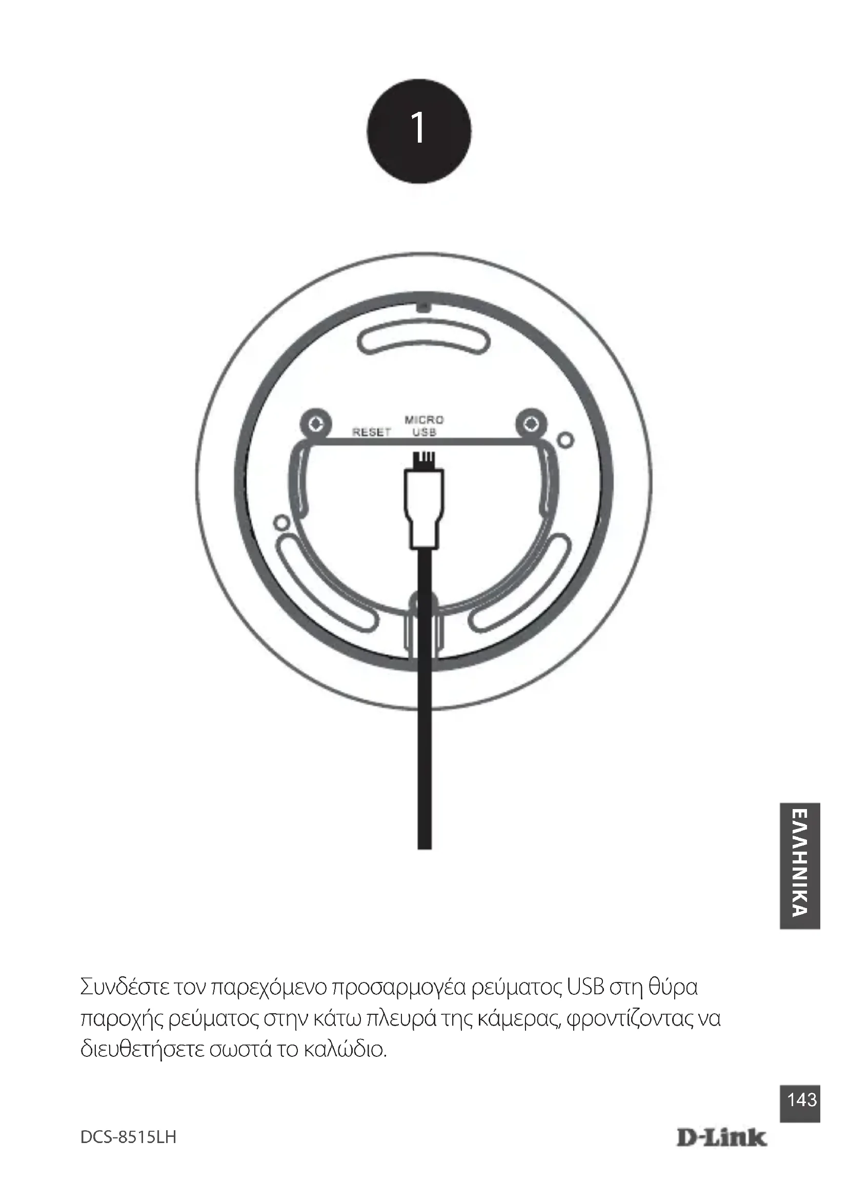 Συνδέστε τον παρεχόμενο προσαρμογέα ρεύματος USB στη θύρα παροχής ρεύματος στην κάτω πλευρά της κάμερας, φροντίζοντας να διευθετήσετε σωστά το καλώδιο.DCS-8515LH