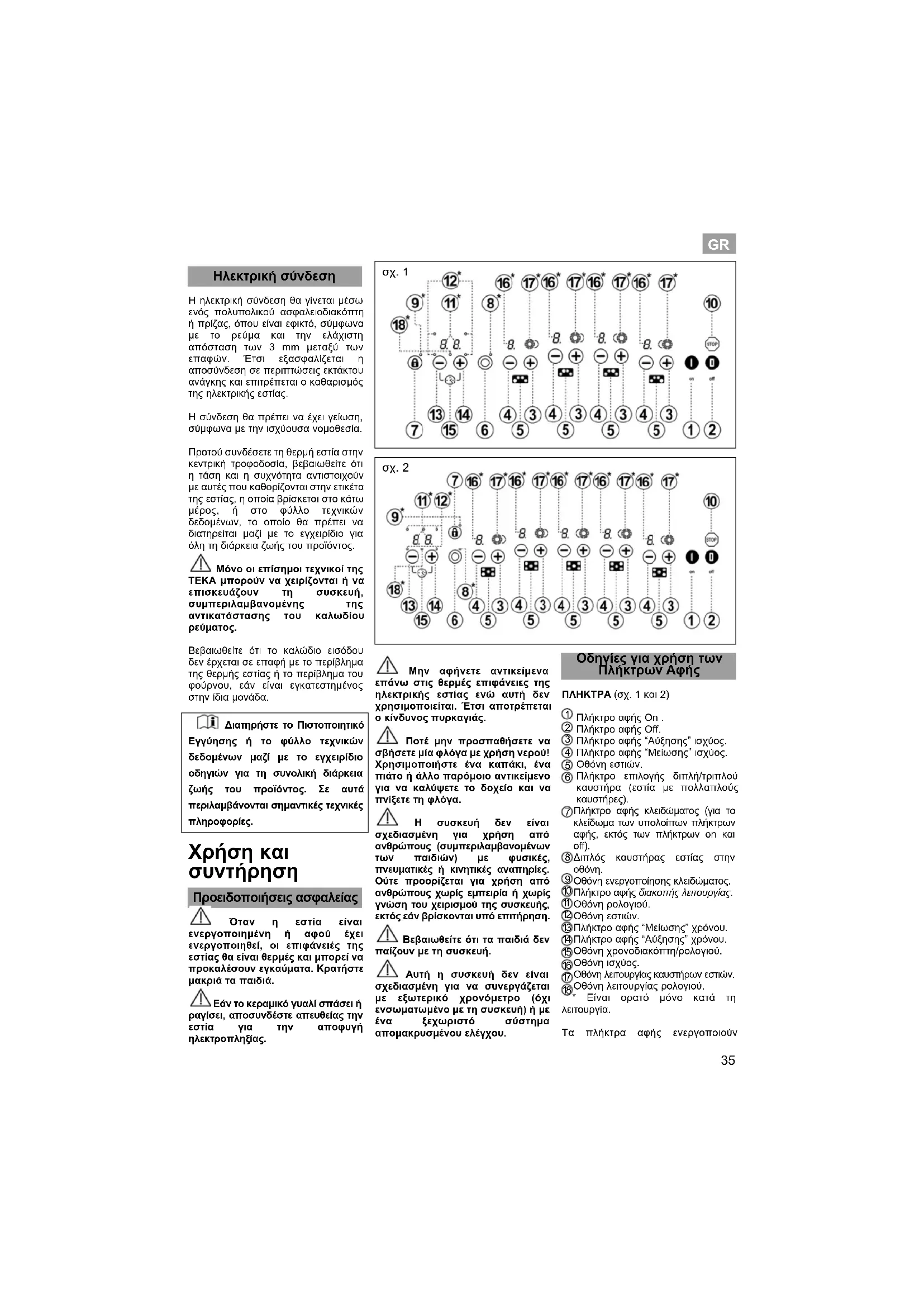 FR35 Ηλεκτρική σύνδεση Η ηλεκτρική σύνδεση θα γίνεται μέσω ενός πολυπολικού ασφαλειοδιακόπτη ή πρίζας, όπου είναι εφικτό, σύμφωνα με το ρεύμα και την ελάχιστη απόσταση των 3 mm μεταξύ των επαφών. Έτσι εξασφαλίζεται η αποσύνδεση σε περιπτώσεις εκτάκτου ανάγκης και επιτρέπεται ο καθαρισμός της ηλεκτρικής εστίας. Η σύνδεση θα πρέπει να έχει γείωση, σύμφωνα με την ισχύουσα νομοθεσία. Προτού συνδέσετε τη θερμή εστία στην κεντρική τροφοδοσία, βεβαιωθείτε ότι η τάση και η συχνότητα αντιστοιχούν με αυτές που καθορίζονται στην ετικέτα της εστίας, η οποία βρίσκεται στο κάτω μέρος, ή στο φύλλο τεχνικών δεδομένων, το οποίο θα πρέπει να διατηρείται μαζί με το εγχειρίδιο για όλη τη διάρκεια ζωής του προϊόντος. Μόνο οι επίσημοι τεχνικοί της TEKA μπορούν να χειρίζονται ή να επισκευάζουν τη συσκευή, συμπεριλαμβανομένης της αντικατάστασης του καλωδίου