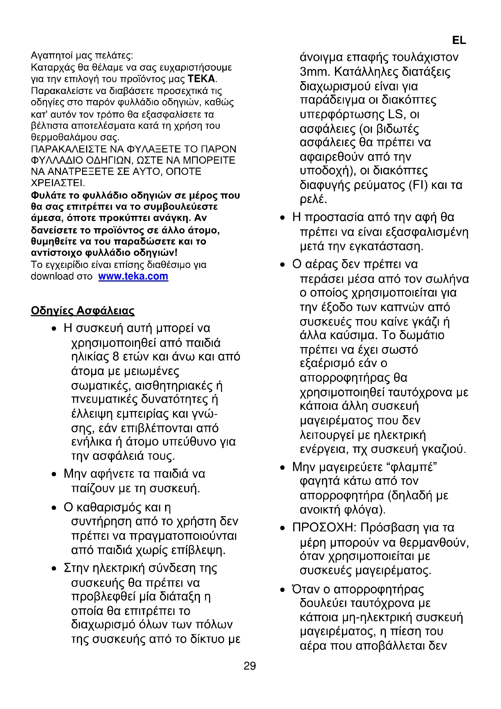 Φυλάτε το φυλλάδιο οδηγιών σε μέρος που θα σας επιτρέπει να το συμβουλεύεστε άμεσα, όποτε προκύπτει ανάγκη. Αν δανείσετε το προϊόντος σε άλλο άτομο, θυμηθείτε να του παραδώσετε και το αντίστοιχο φυλλάδιο οδηγιών! Το εγχειρίδιο είναι επίσης διαθέσιμο για download στο www.teka.com Οδηγίες Ασφάλειας Η συσκευή αυτή μπορεί να χρησιμοποιηθεί από παιδιά ηλικίας 8 ετών και άνω και από άτομα με μειωμένες σωματικές, αισθητηριακές ή πνευματικές δυνατότητες ή έλλειψη εμπειρίας και γνώ‐ σης, εάν επιβλέπονται από ενήλικα ή άτομο υπεύθυνο για την ασφάλειά τους. Μην αφήνετε τα παιδιά να παίζουν με τη συσκευή. Ο καθαρισμός και η συντήρηση από το χρήστη δεν πρέπει να πραγματοποιούνται από παιδιά χωρίς επίβλεψη. Στην ηλεκτρική σύνδεση της συσκευής θα πρέπει να προβλεφθεί μία διάταξη η οποία θα επιτρέπει το διαχωρισμό όλων των πόλων της συσκευής από το δίκτυο με άνοιγμα επαφής τουλάχιστον 3mm. Κατάλληλες διατάξεις διαχωρισμού είναι για παράδειγμα οι διακόπτες υπερφόρτωσης LS, οι ασφάλειες (οι βιδωτές ασφάλειες θα πρέπει να αφαιρεθούν από την υποδοχή), οι διακόπτες διαφυγής ρεύματος (FI) και τα