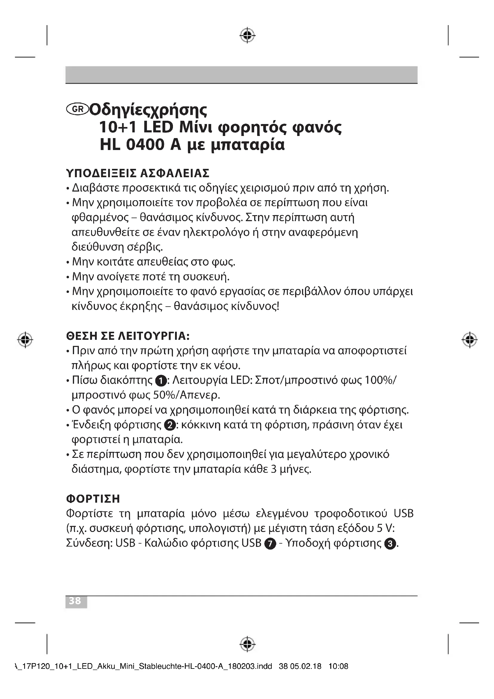 HL 0400 A Οδηγίες χρήσης ΚΑΤΑΣΤΑΣΗ ΤΩΝ ΣΤΟΊΧΕΊΩΝ ΧΕΊΡΊΣΜΟΥ: ΤΕΧΝΊΚΑ ΧΑΡΑΚΤΗΡΊΣΤΊΚΑ: Λυχνίες LED: Μπροστινό φως 10x Osram Προβολέας LED SMD, σποτ 1x προβολέα LED SMD Φωτεινή ισχύς: Μπροστινό φως400/200 lm, σποτ 80 lm Μπαταρία: ενσωματωμένη, Li Ion 3,6 V/2,6 Ah Είσοδος φόρτισης: Micro-USB 5 VDC, 1000 mA max. Διάρκεια λειτουργίας: Μπροστινό φως 3ω/6ω, σποτ 8 h Διάρκεια φόρτισης: ~ 4h Προστασία: IP 42 Εύρος θερμοκρ ασίας: -5 °C– +40 ° C