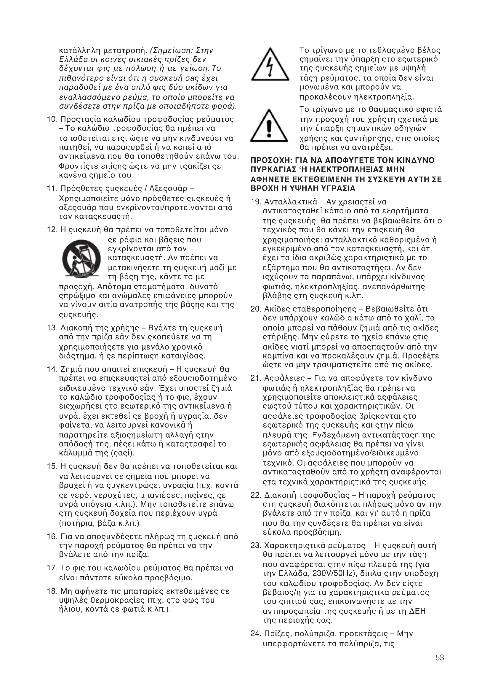 υψηλέσ θερµοκρασίεσ (π.χ. στο φωσ του ήλιου, κοντά σε φωτιά κ.λπ.). Το τρίγωνο µε το τεθλασµένο βέλοσ σηµαίνει την ύπαρξη στο εσωτερικ τησ συσκευήσ σηµείων µε υψηλή τάση ρεύµατοσ, τα οποία δεν είναι µονωµένα και µπορούν να προκαλέσουν ηλεκτροπληξία. Το τρίγωνο µε το θαυµαστικ εφιστά την προσοχή του χρήστη σχετικά µε την ύπαρξη σηµαντικών οδηγιών χρήσησ και συντήρησησ, στισ οποίεσ θα πρέπει να ανατρέξει. ΠΡΟΣΟΧΗ: ΓΙΑ ΝΑ ΑΠΟΦΥΓΕΤΕ ΤΟΝ ΚΙΝ∆ΥΝΟ ΠΥΡΚΑΓΙΑΣ ‘Η ΗΛΕΚΤΡΟΠΛΗΞΙΑΣ ΜΗΝ ΑΦΗΝΕΤΕ ΕΚΤΕΘΕΙΜΕΝΗ ΤΗ ΣΥΣΚΕΥΗ ΑΥΤΗ ΣΕ ΒΡΟΧΗ Η ΥΨΗΛΗ ΥΓΡΑΣΙΑ