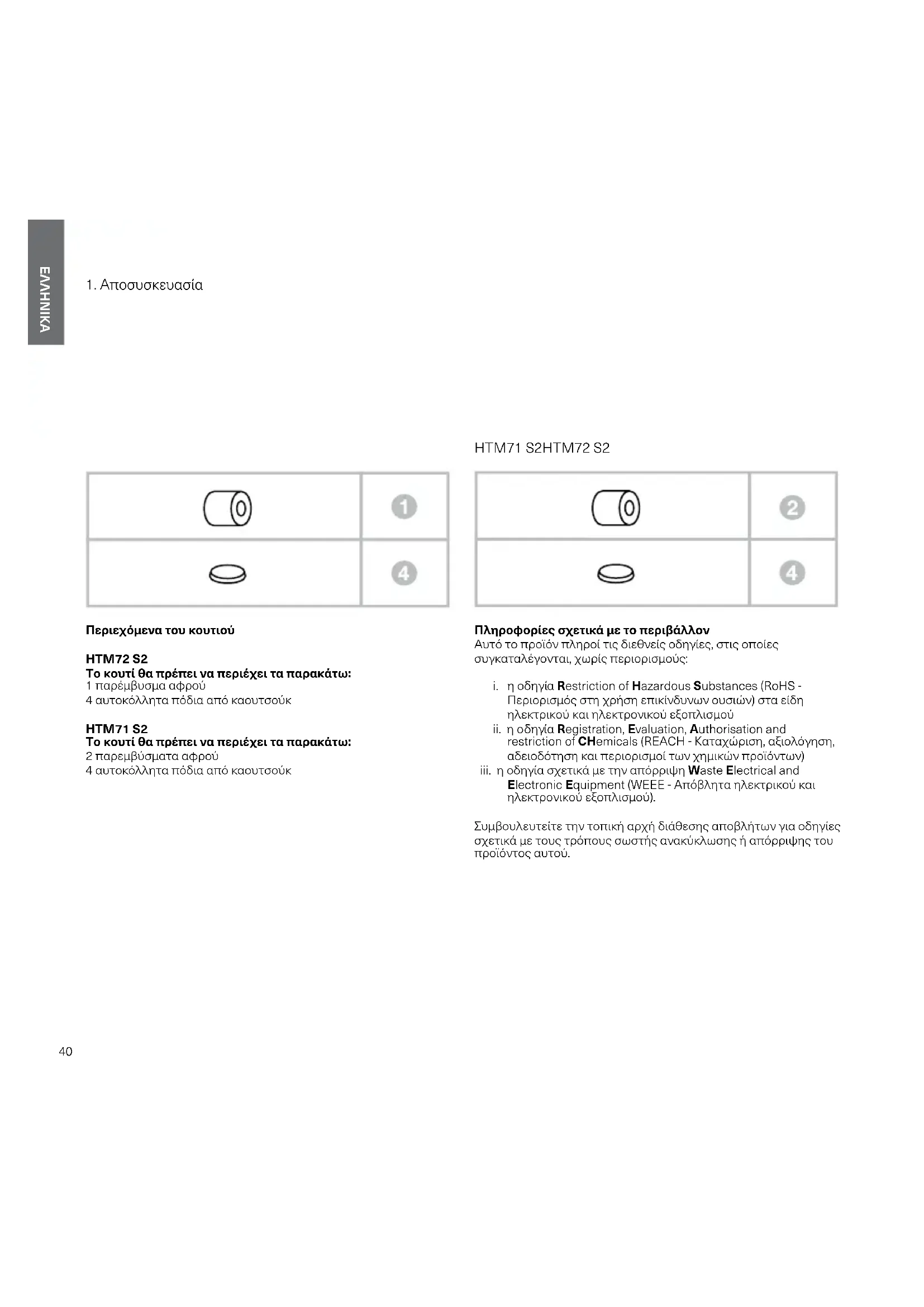 Περιεχόμενα του κουτιού HTM72S2 Το κουτί θα πρέπει να περιέχει τα παρακάτω: 1 παρέμβυσμα αφρού 4 αυτοκόλλητα πόδια από καουτσούκ HTM71S2 Το κουτί θα πρέπει να περιέχει τα παρακάτω: 2 παρεμβύσματα αφρού 4 αυτοκόλλητα πόδια από καουτσούκ Πληροφορίες σχετικά με το περιβάλλον Αυτό το προϊόν πληροί τις διεθνείς οδηγίες, στις οποίες συγκαταλέγονται, χωρίς περιορισμούς: