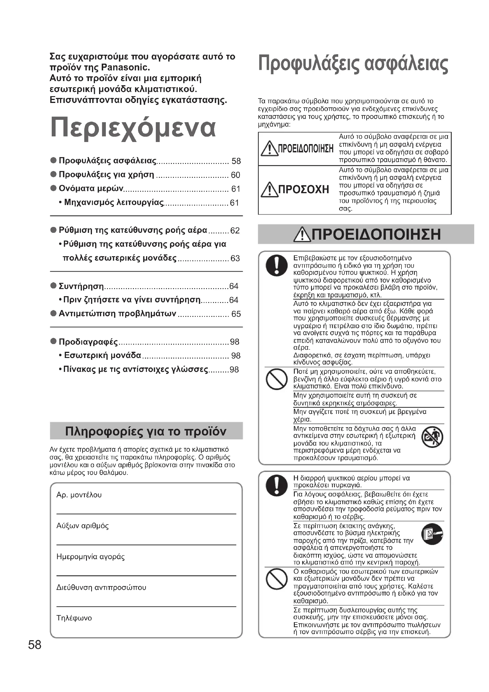 - Προφυλάξεις ασφάλειας p. 58