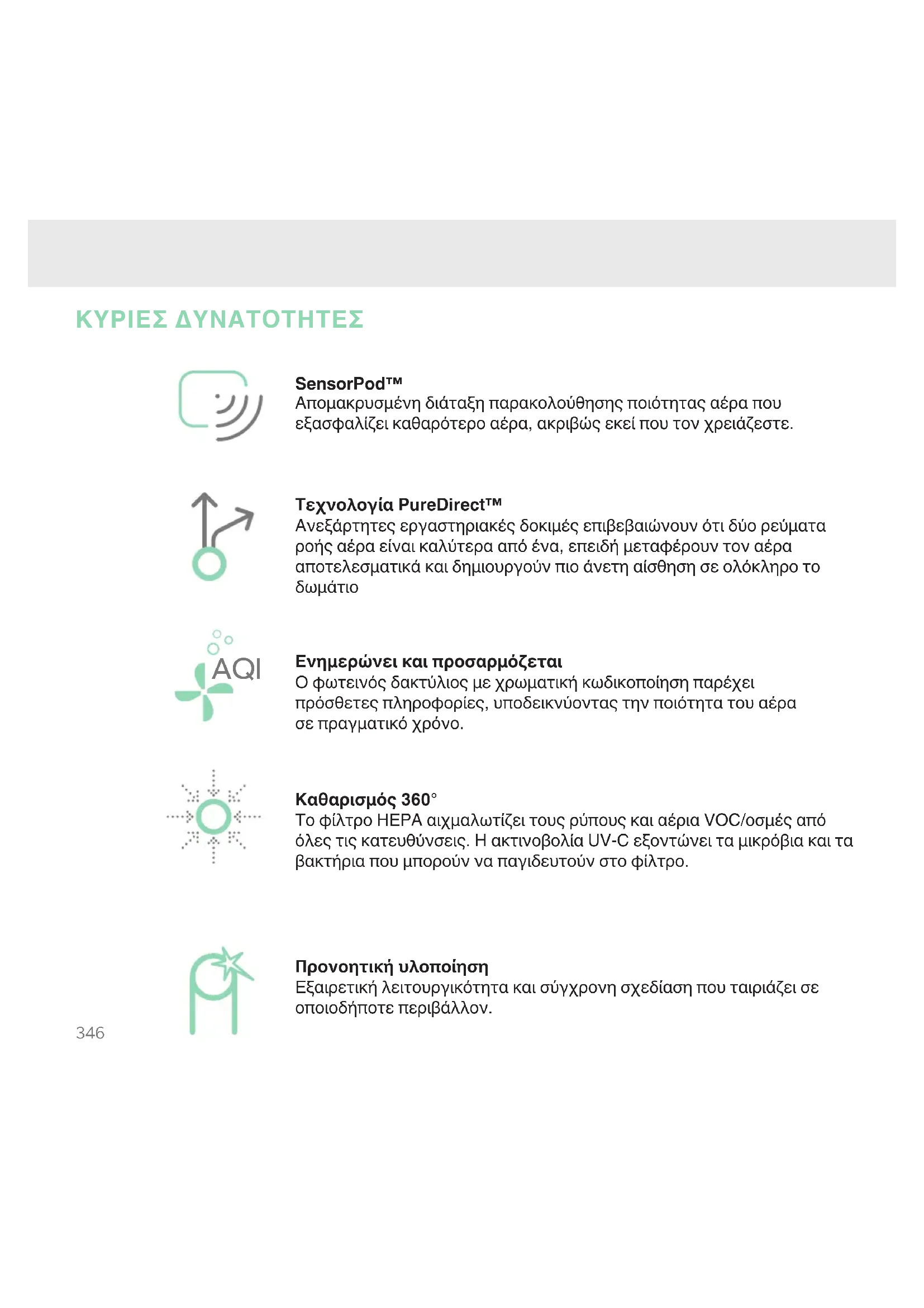 ΚΥΡΙΕΣ ΔΥΝΑΤΟΤΗΤΕΣ SensorPod™ Απομακρυσμένη διάταξη παρακολούθησης ποιότητας αέρα που εξασφαλίζει καθαρότερο αέρα, ακριβώς εκεί που τον χρειάζεστε. Τεχνολογία PureDirect™ Ανεξάρτητες εργαστηριακές δοκιμές επιβεβαιώνουν ότι δύο ρεύματα ροής αέρα είναι καλύτερα από ένα, επειδή μεταφέρουν τον αέρα αποτελεσματικά και δημιουργούν πιο άνετη αίσθηση σε ολόκληρο το